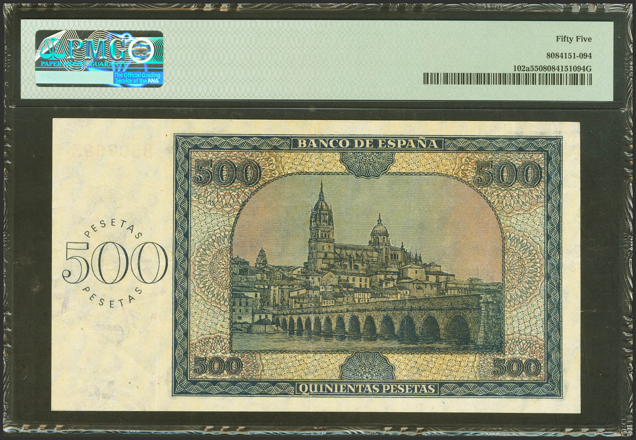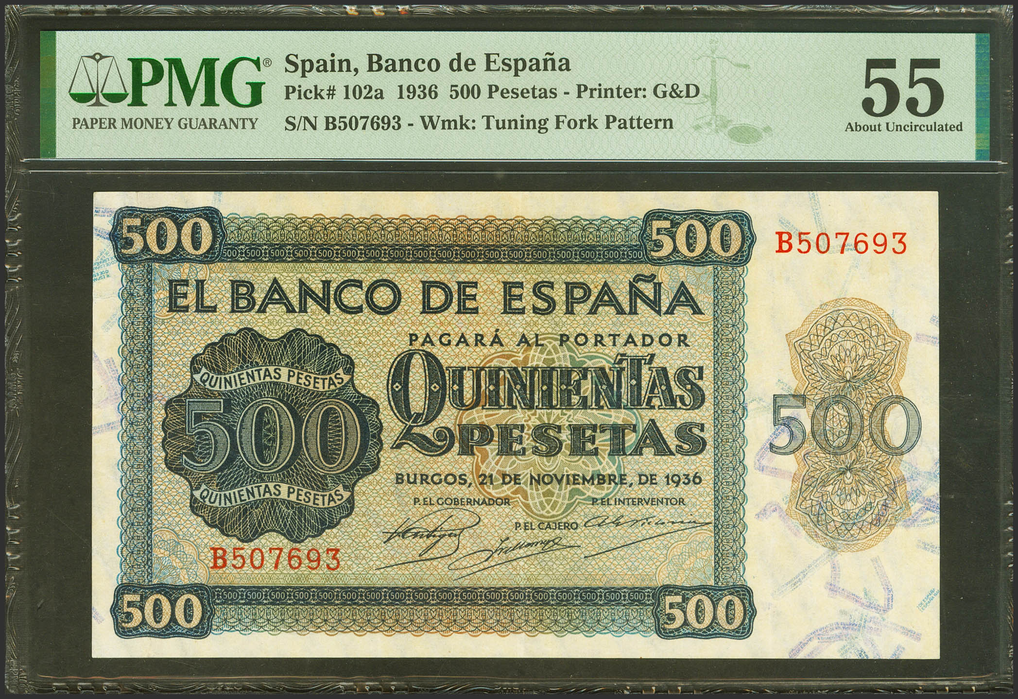 500 Pesetas. November 21, 1936. Series B. (Edifil 2023: 422a, Pick: 102a). Unusual. Good Extremely Fine. PMG55 encapsulation.