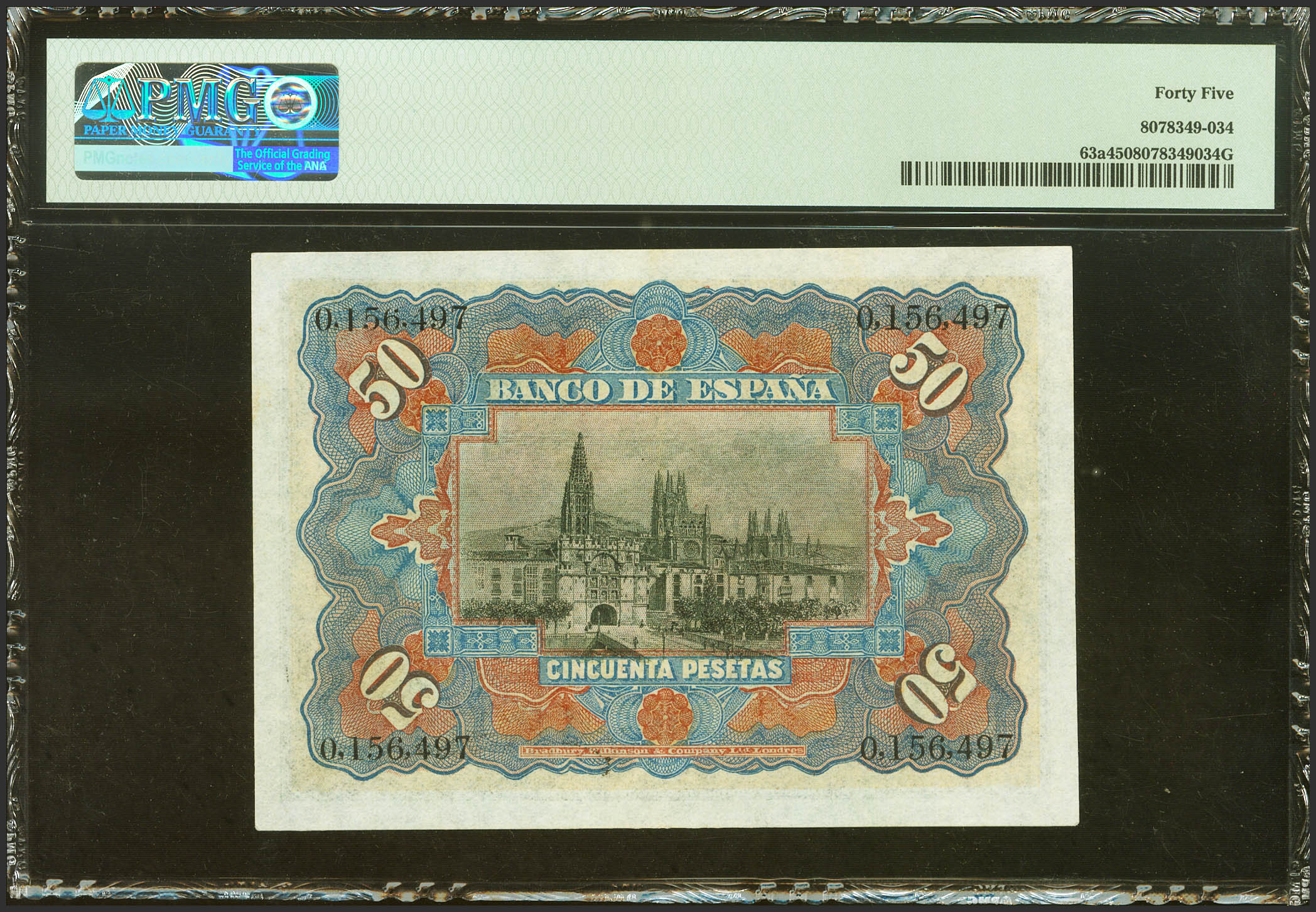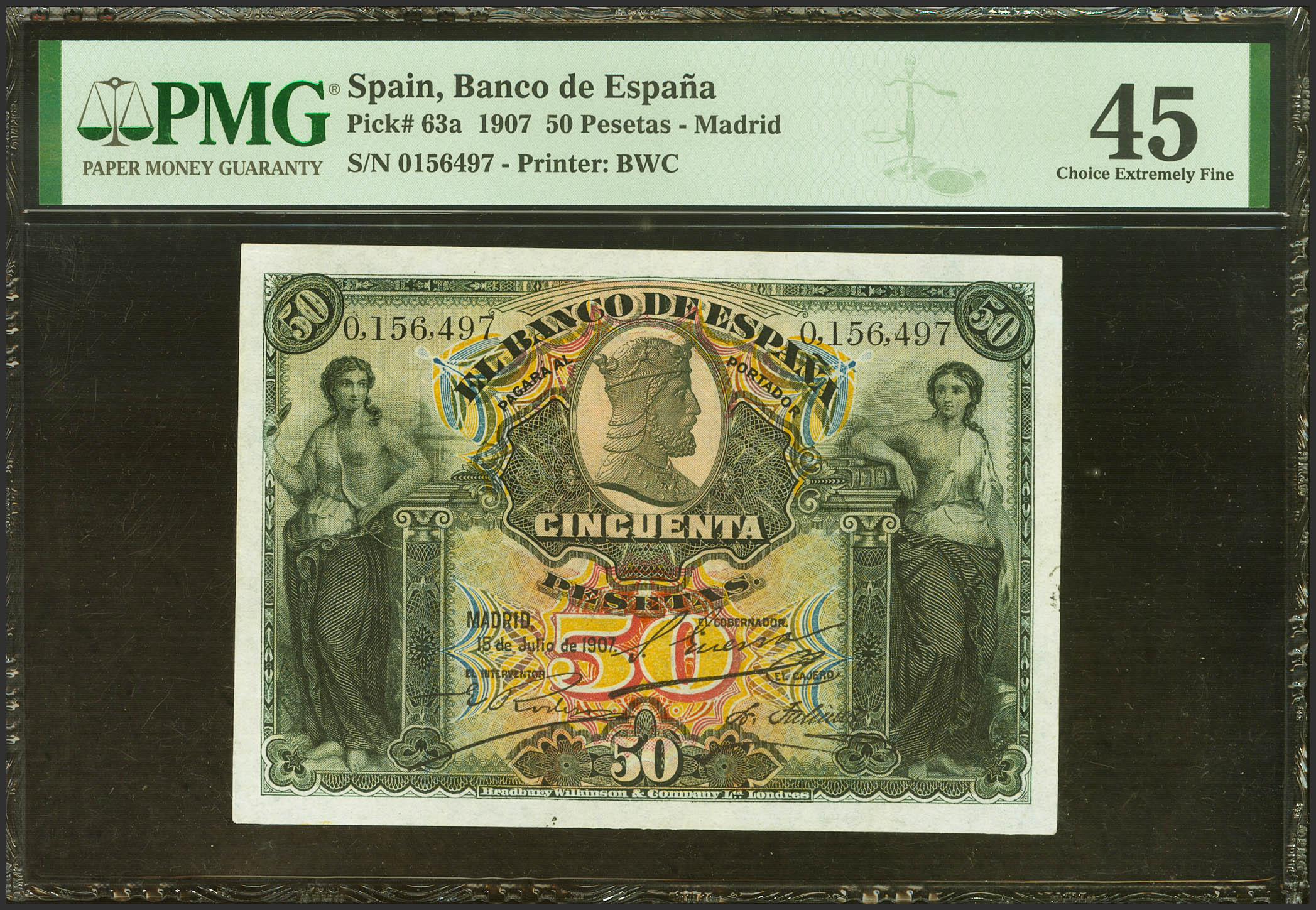 50 Pesetas. July 15, 1907. No series. (Edifil 2023: 319, Pick: 63a). Almost Extremely Fine. PMG45 encapsulation.