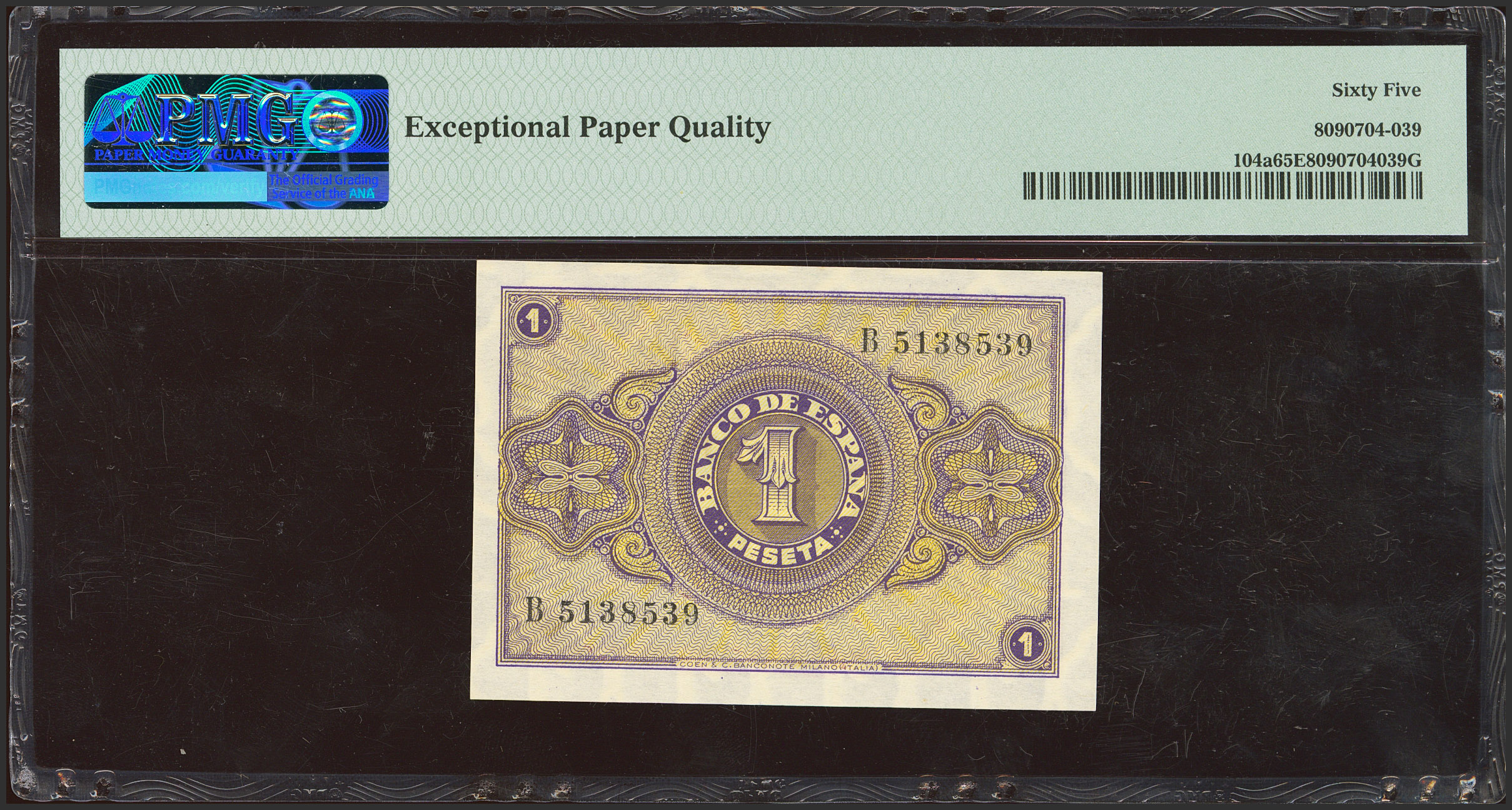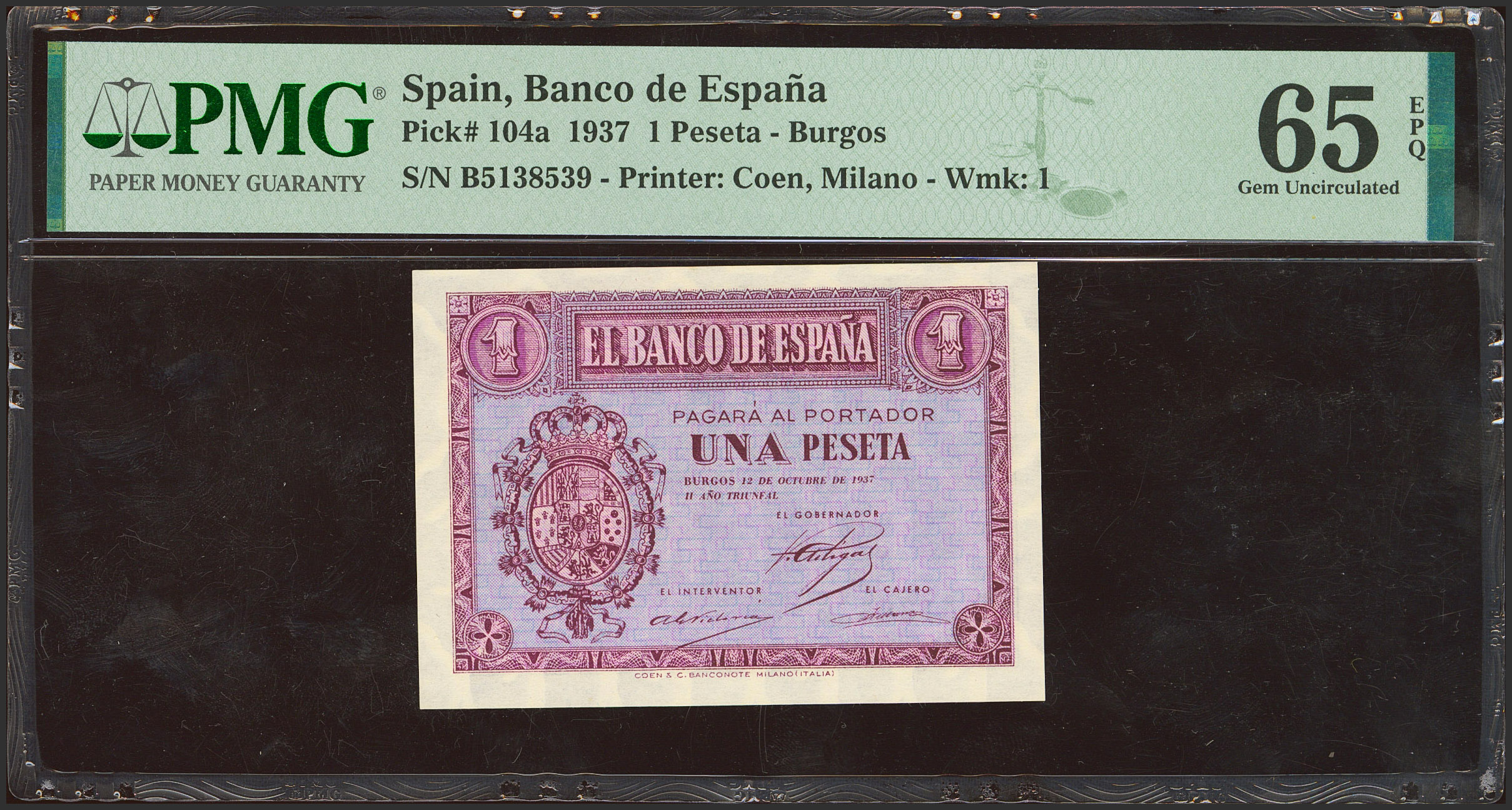 1 Peseta. October 12, 1937. Series B. (Edifil 2023: 425a, Pick: 104a). Original sizing. PMG65EPQ package.