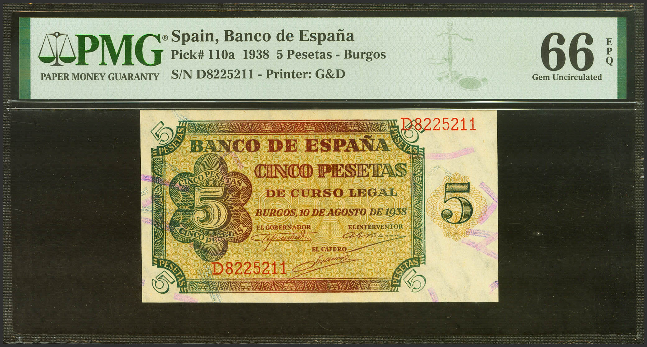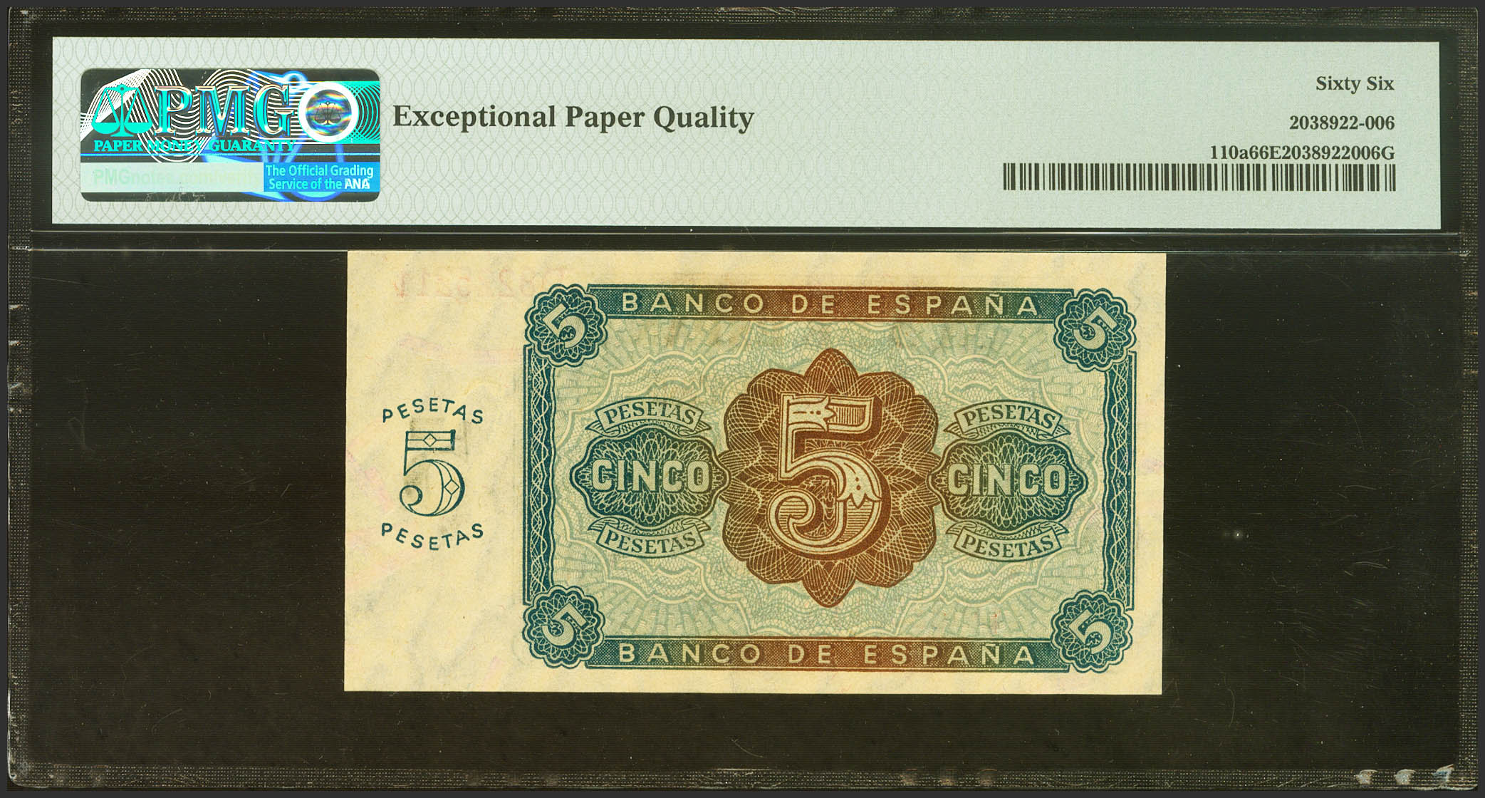 5 Pesetas. August 10, 1938. Series D. (Edifil 2023: 435a, Pick: 110a). Rare in this exceptional quality, original sizing. Uncirculated. PMG66EPQ package.