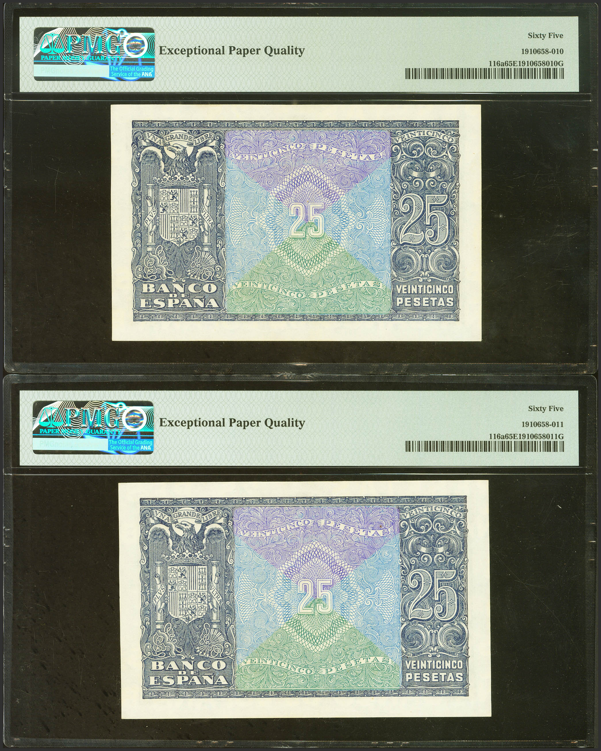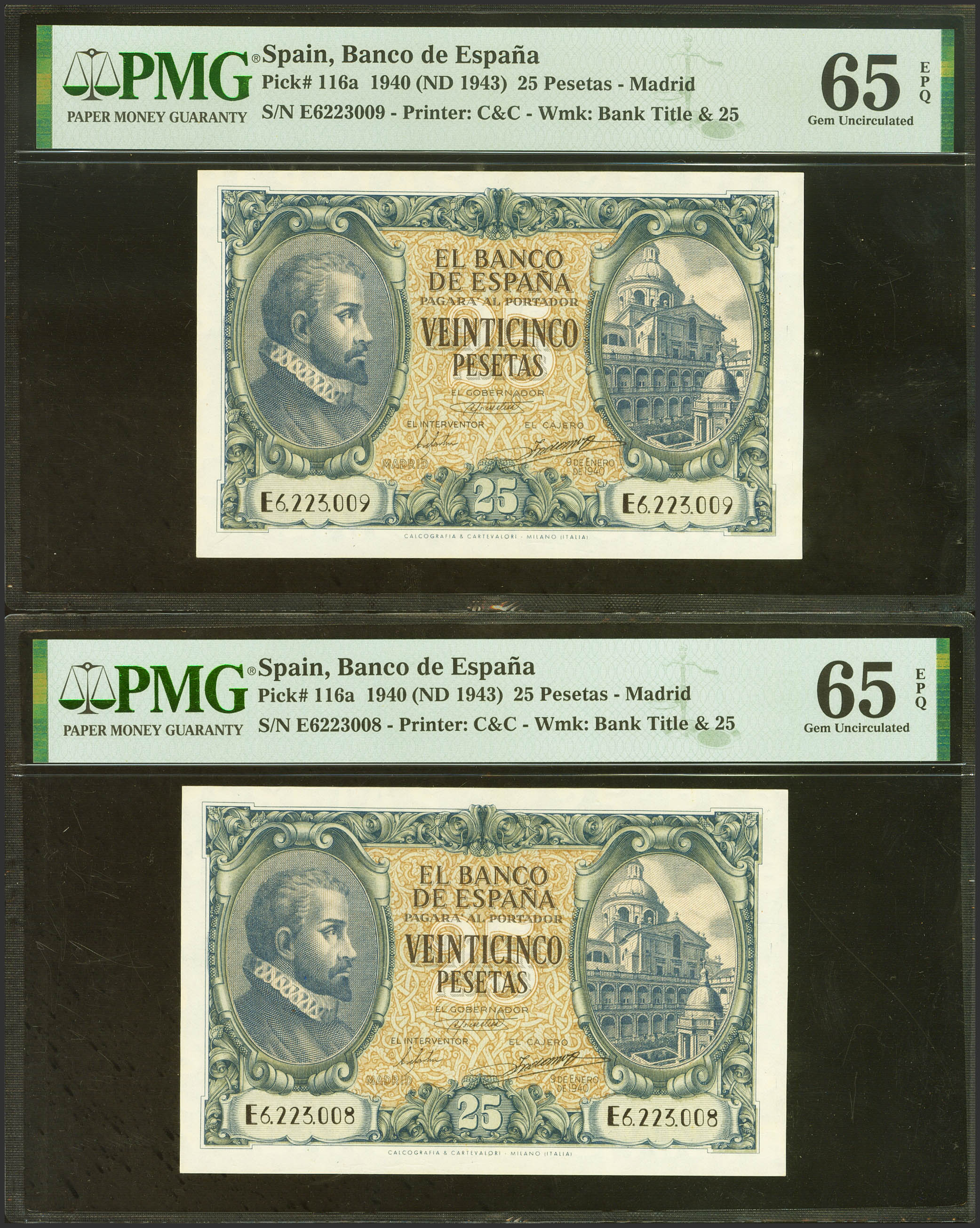 25 Pesetas. January 9, 1940. Correlative couple. Series E. (Edifil 2023: 436a, Pick: 116a). Rare in this exceptional quality, original sizing. Uncirculated. PMG65EPQ encapsulated, both.