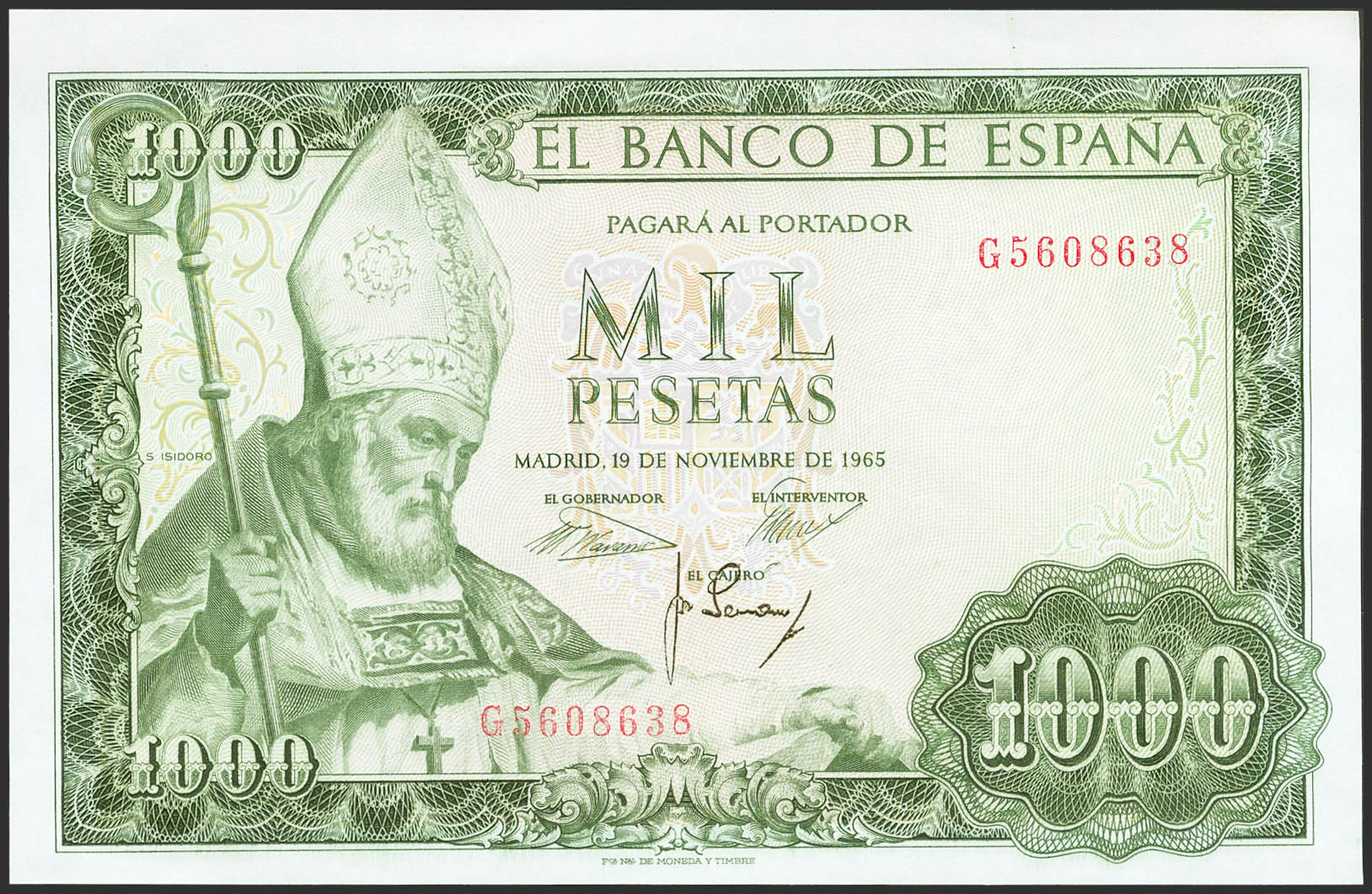 1000 Pesetas. November 19, 1965. Series G. (Edifil 2021: 471b, Pick: 151). It retains all its original finish. Almost Uncirculated.
