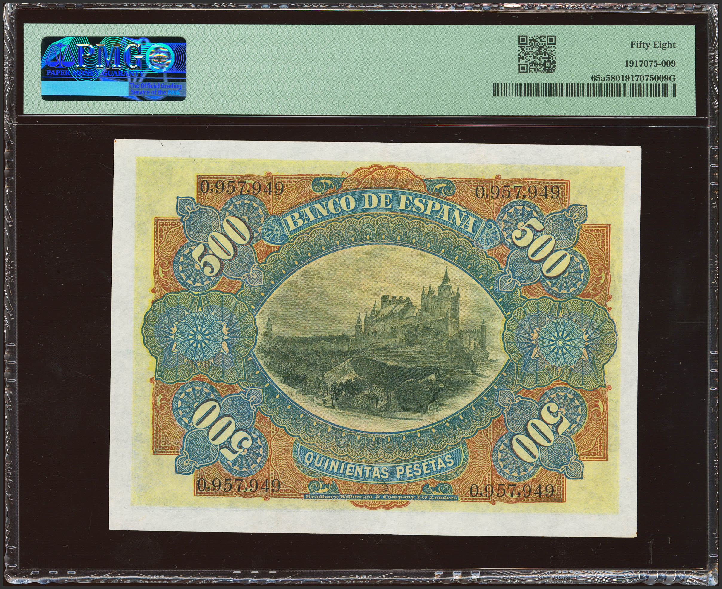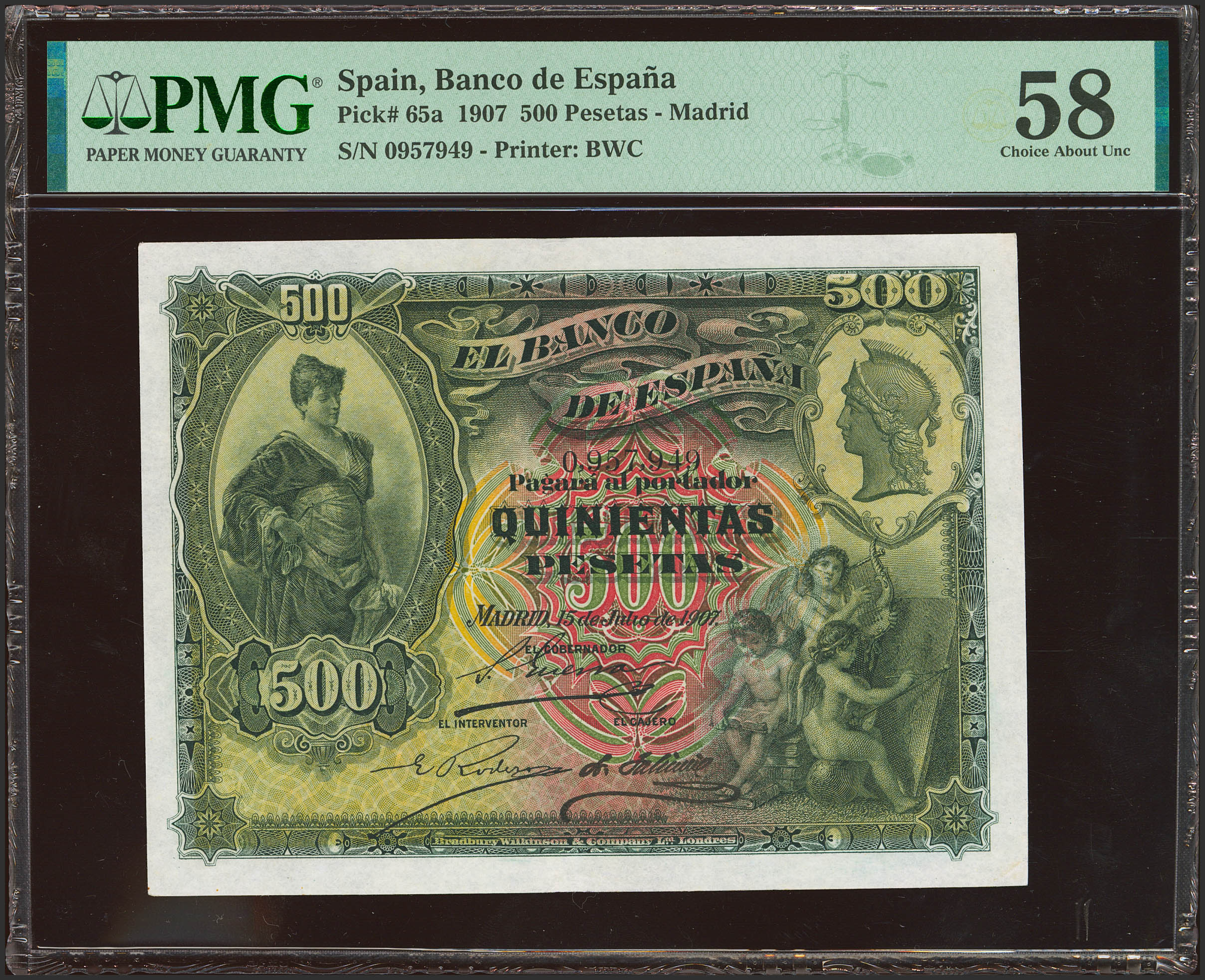 English 500 Pesetas. July 15, 1907. No series. (Edifil 2021: 321, Pick: 65a). Very rare, especially in this exceptional quality, and without any repairs. EBC++. Encapsulated PMG58 (to give us an idea of ​​the rarity, as of March 1, 2024, this note is the second highest rated along with nine other notes in PMG).