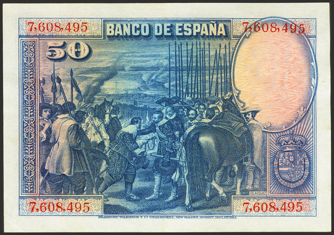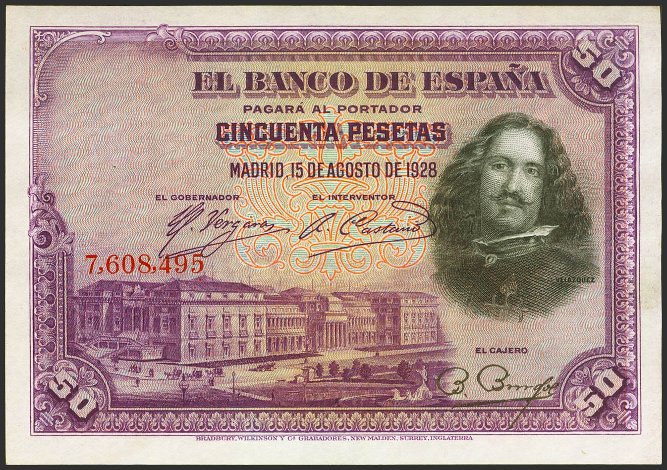 English 50 Pesetas. August 15, 1928. No series. (Edifil 2021: 329, Pick: 75a). Unusual, it retains much of the original finish. Extremely Fine.