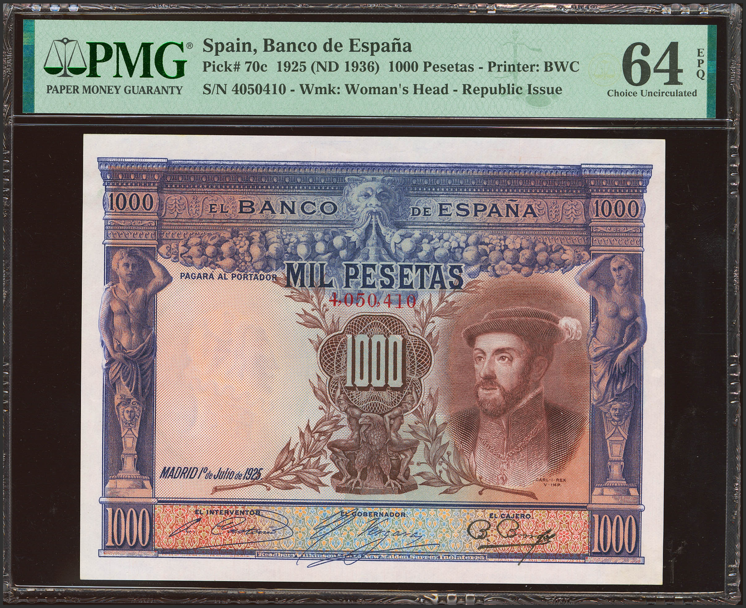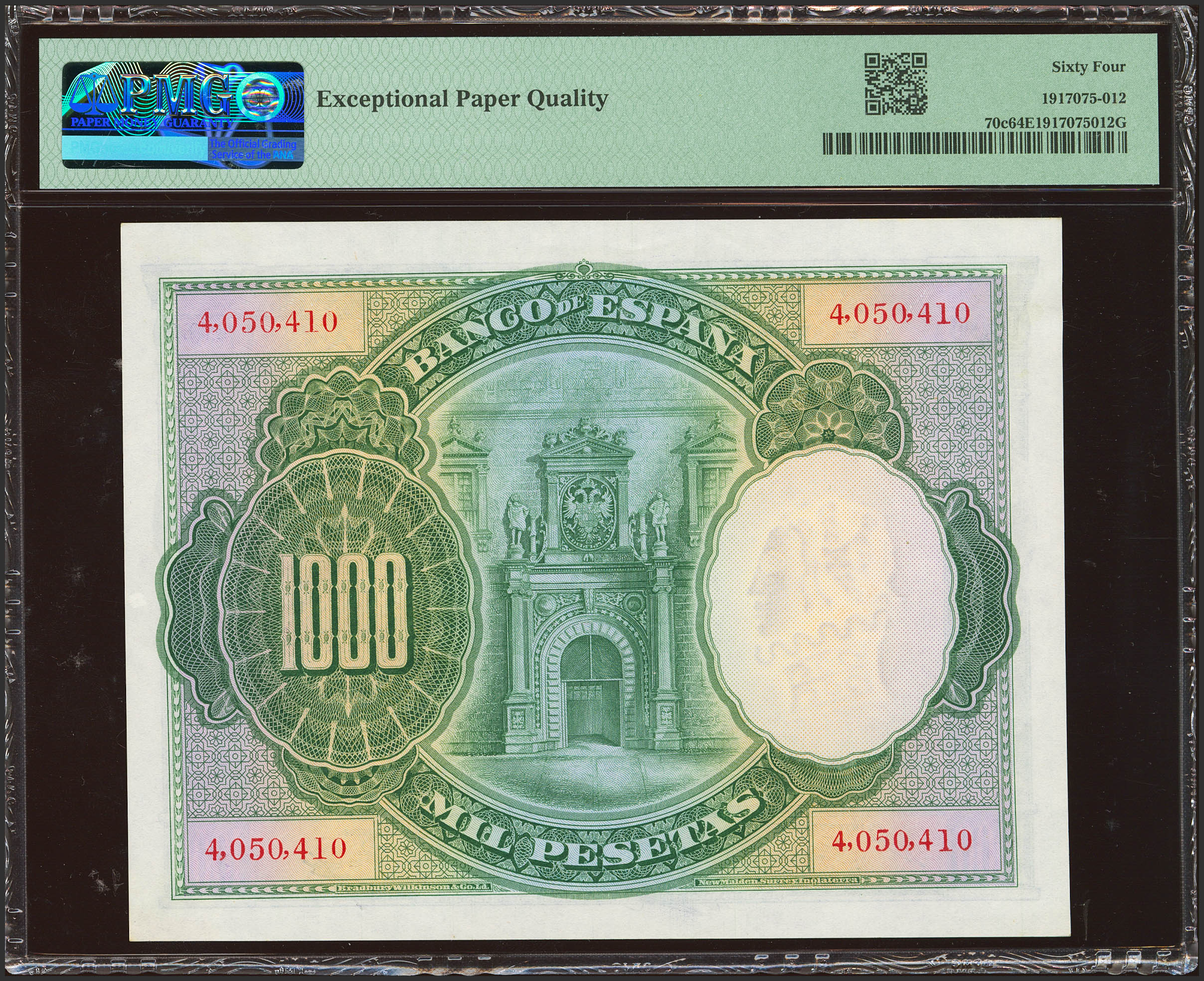 1000 Pesetas. July 1, 1925. No series and numbering after 3646000. (Edifil 2021: 351, Pick: 70c). Very rare in this exceptional quality and original sizing. Uncirculated. Encapsulated PMG64EPQ (to give us an idea of the rarity, as of March 1, 2024, this note is the fifth highest rated in PMG).