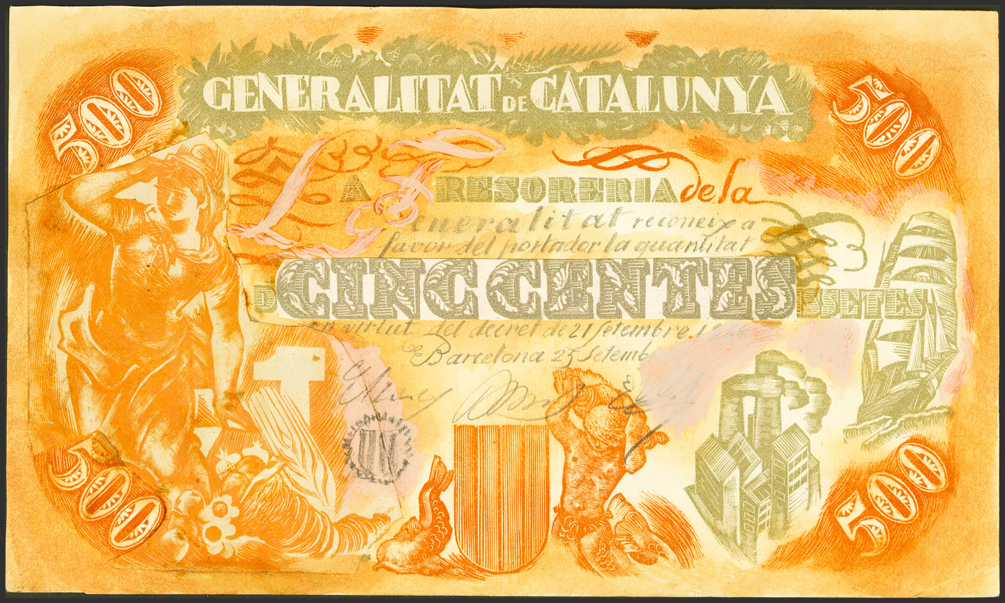 500 Pesetas. September 1936. Artist's proof of the Generalitat of Catalonia Not issued and handcrafted from an artistic point of view. (Not cataloged in Edifil or Filabo). Very rare. Almost Uncirculated.