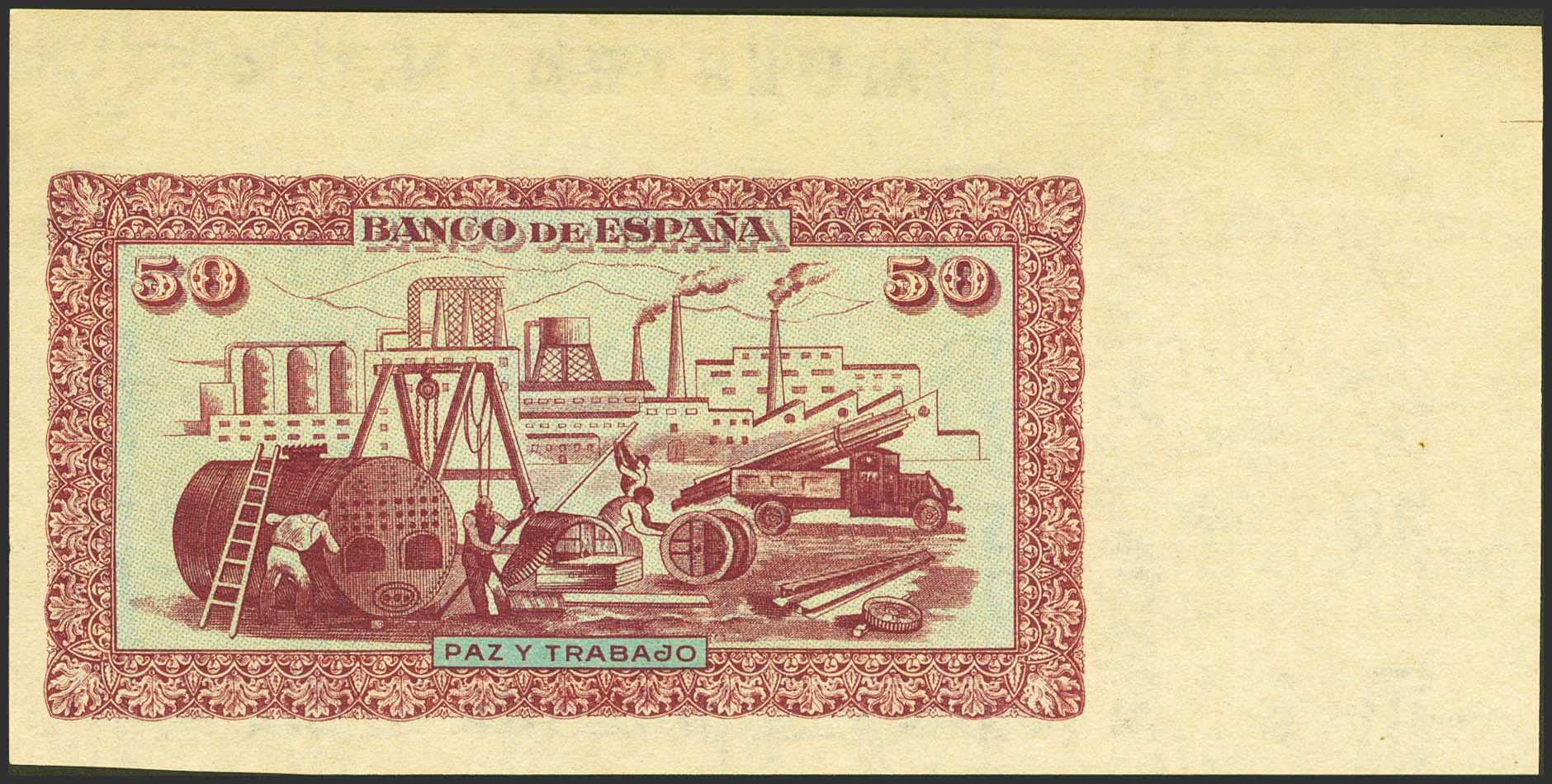50 Pesetas. NOT ISSUED. September 1937. Gijón Branch. Without series, with the matrix on the left and upper leaf edge that includes the marginal inscription "Sample Nº4". (Edifil 2021: NE33, Pick: S579). Very rare, matches the one photographed in the Filabo catalogue. Uncirculated.