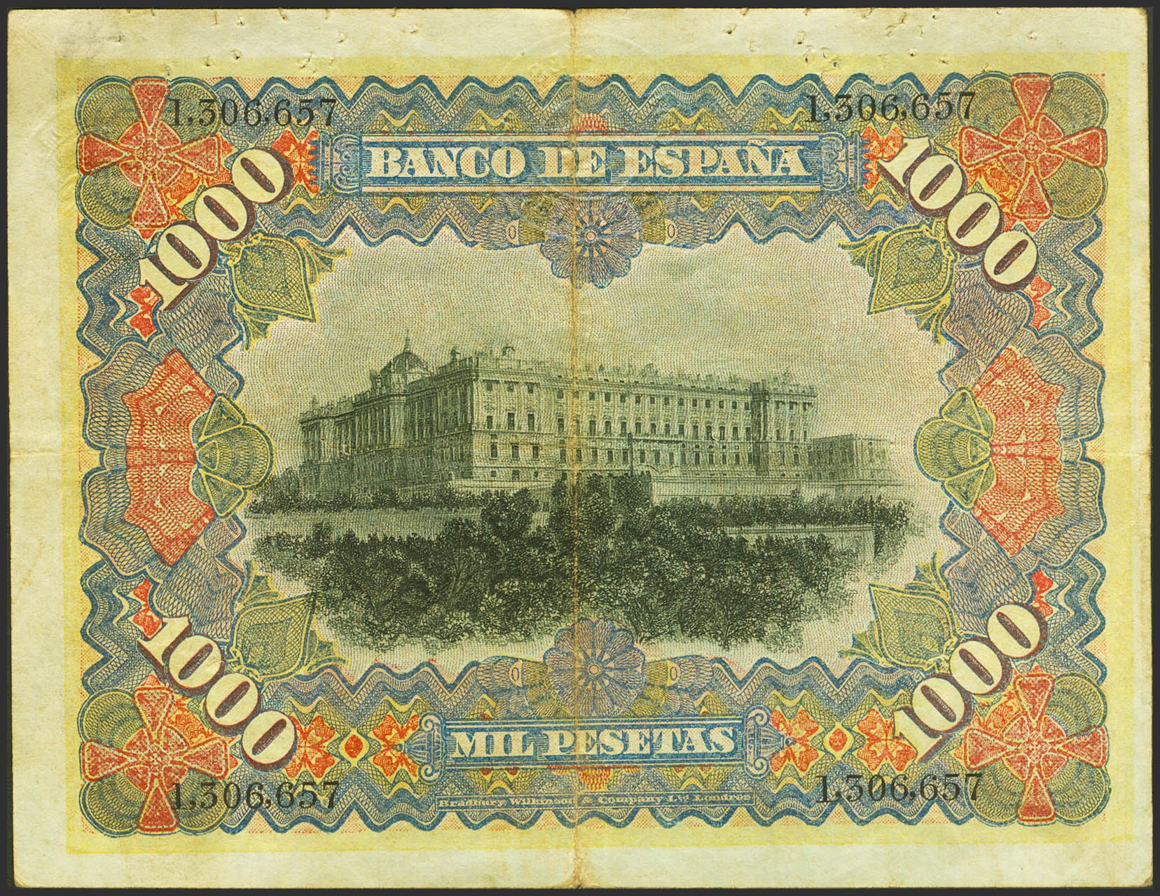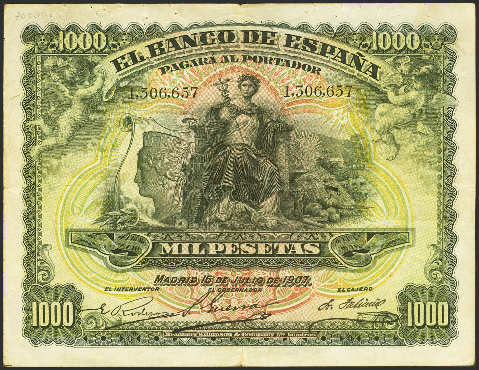 1000 Pesetas. July 15, 1907. Without series and dry stamps PROVISIONAL GOVERNMENT OF THE REPUBLIC / APRIL 14, 1931 and SPANISH STATE / BURGOS. (Edifil 2021: 415A, Pick 66b). Staple points at the top margin. Almost Very Fine.