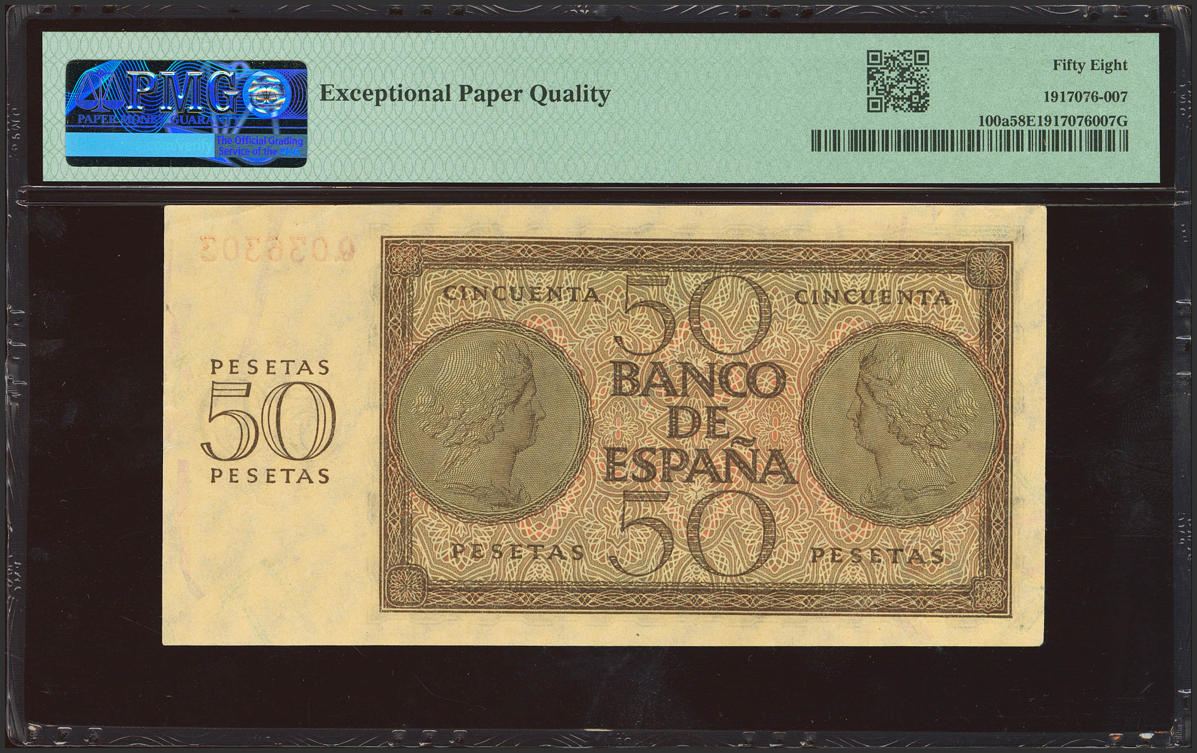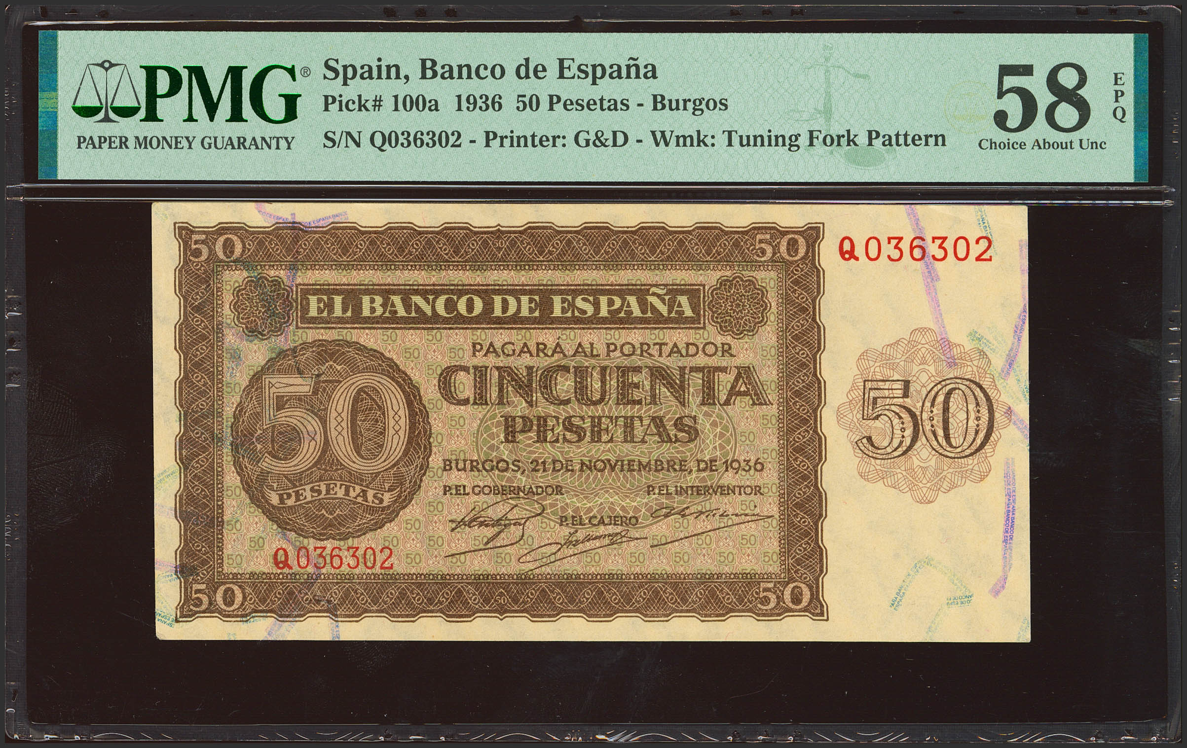 50 Pesetas. November 21, 1936. Series Q. (Edifil 2021: 420a, Pick: 100a). It retains all its original finish. EBC++. PMG58EPQ package.