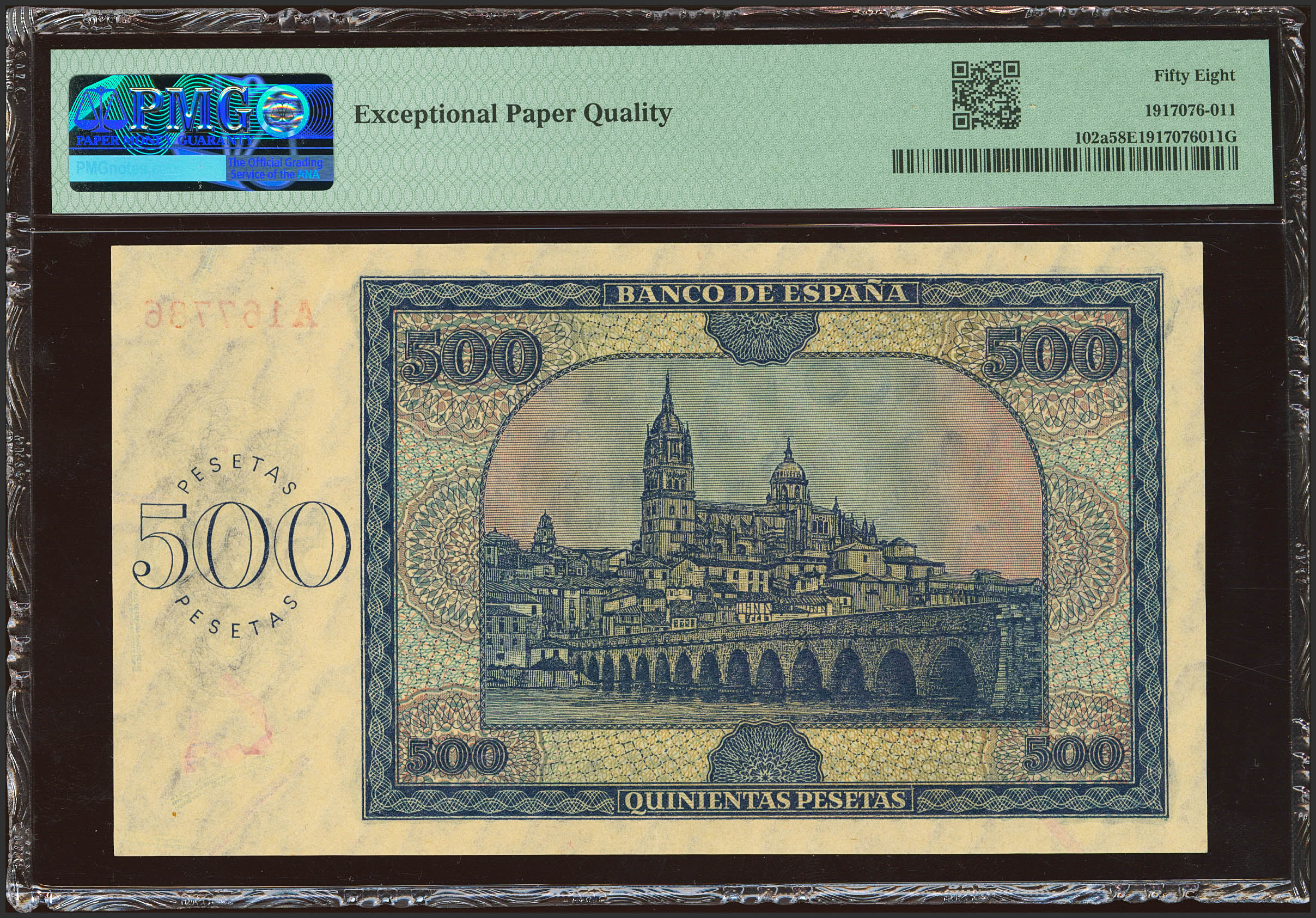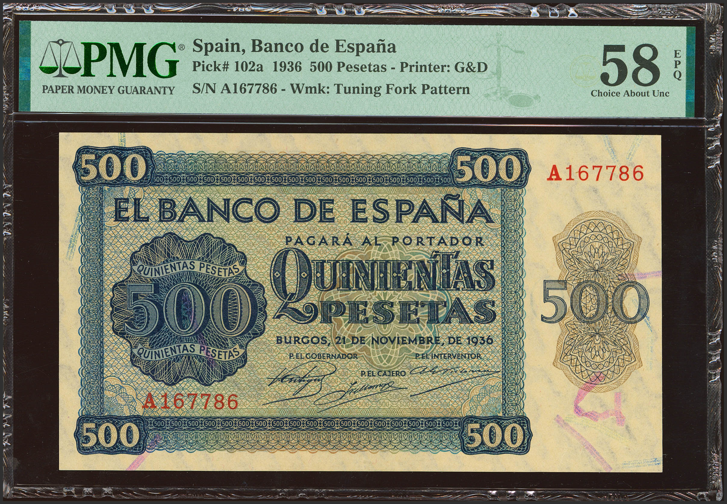500 Pesetas. November 21, 1936. Series A. (Edifil 2021: 422, Pick: 102a). Ripple that does not break the fiber, unusual in this quality, original finish. EBC+++. Encapsulated PMG58EPQ (to give us an idea of the rarity, as of March 1, 2024, this bill is the ninth highest rated along with two other bills in PMG).