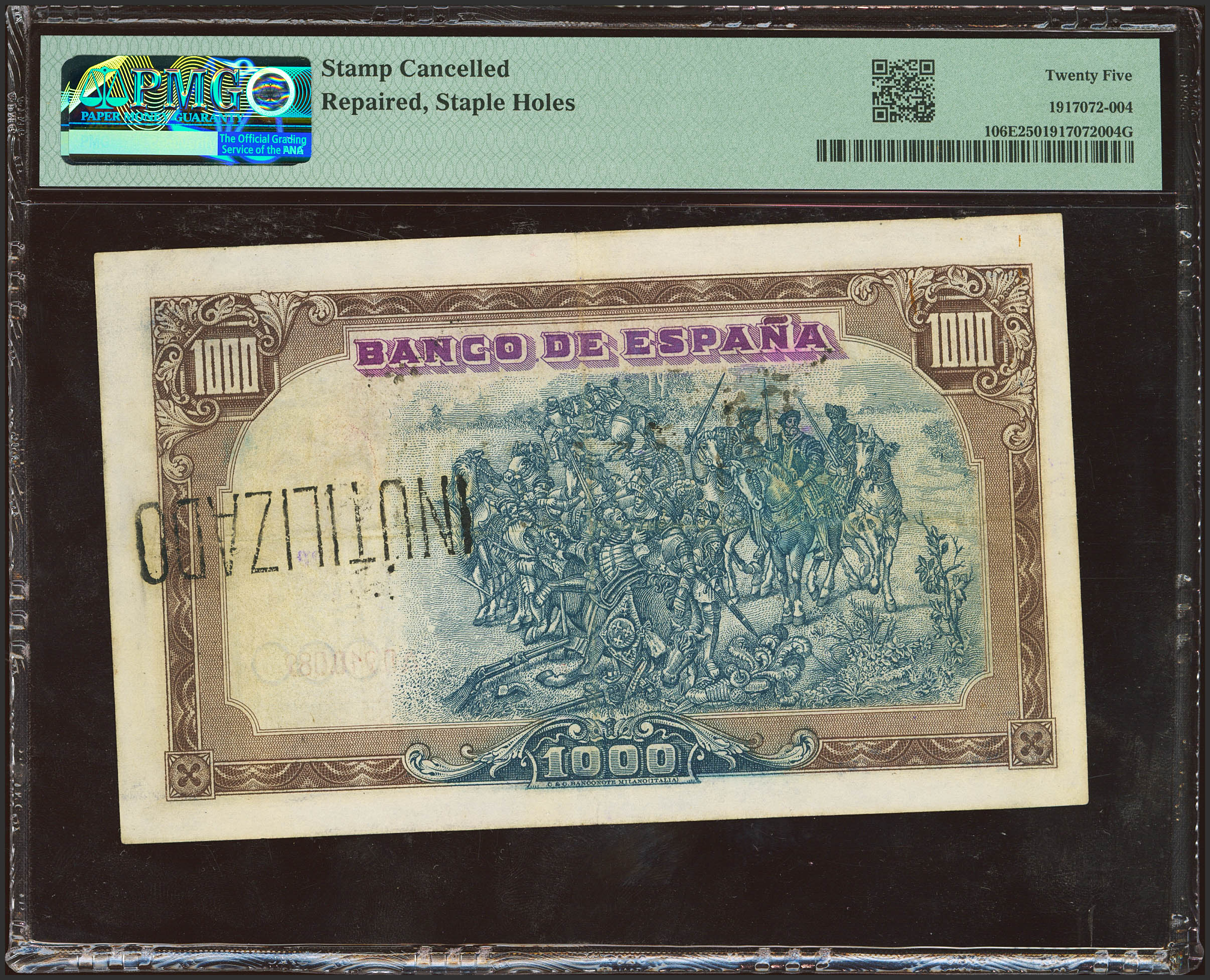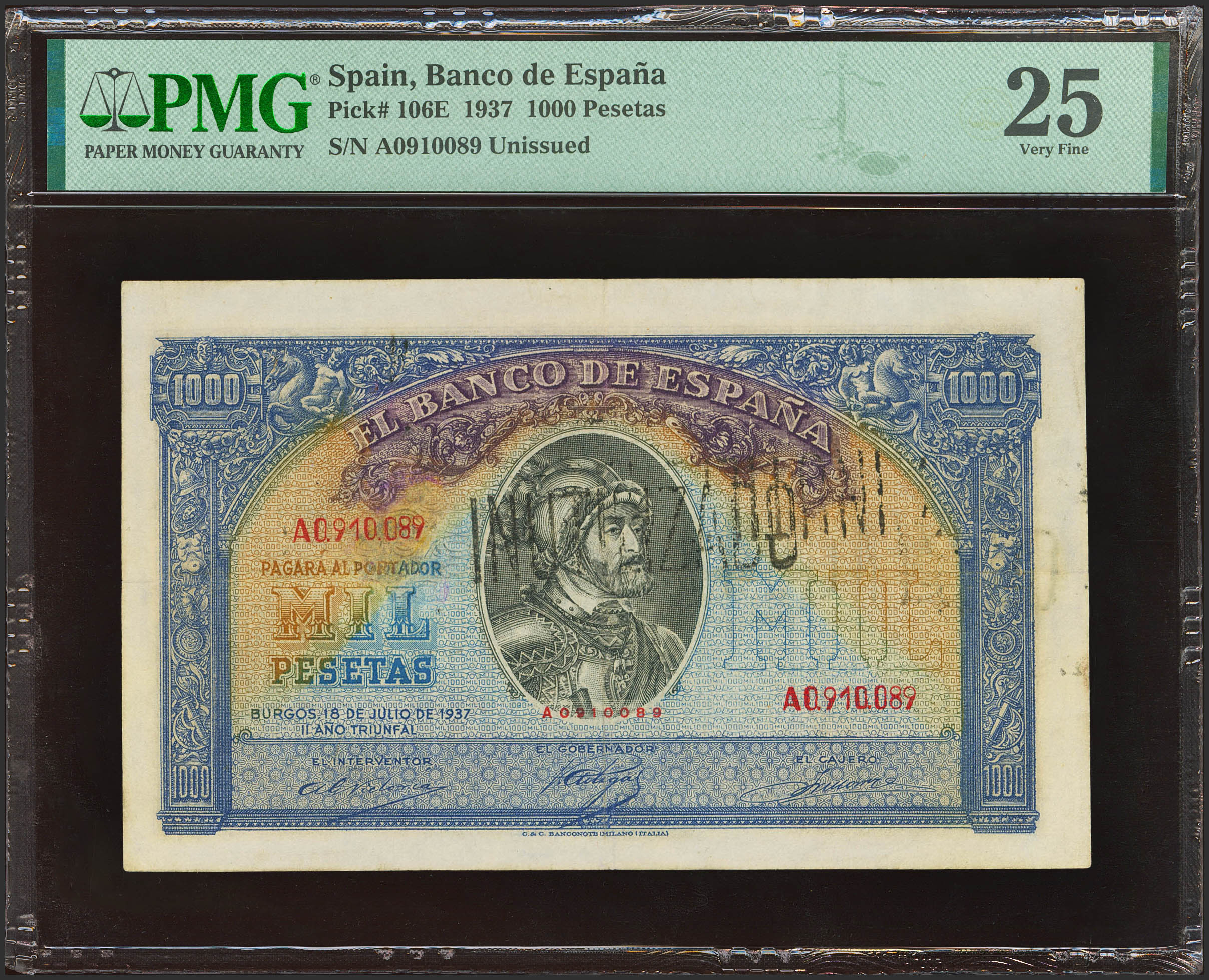 1000 Pesetas. July 18, 1937. Not issued, with the original Cartevalori numbering and stamp "UNUSED". (Edifil: NE44, Pick: 106E). Extremely rare, very few known copies, staple points and repaired, without a doubt one of the rarest banknotes in the Spanish billet. Good Very Fine. PMG25 encapsulation (repaired, staple holes). To talk about the failed 1937 issue of Cartevalori is to contemplate a magnetic story of mysteries, thefts, espionage and strange secret operations on the part of the printing press, the Bank of Spain and, of course, those who robbed the warehouses to put some into circulation. of those notes even before the Bank thought about it. And there are stories and specimens that have such a pedigree that it is impossible to get away from them. This is the case of this ticket. Once Franco's first broadcast was resolved, that of November 1936, the rebel government set its sights on celebrating the first anniversary of the uprising. To do this, he turned to the unexpected C&C Banconote (the letters C hiding the Jewish surname Coen), an Italian printing company with no experience in the production of banknotes, although it did have experience in other purposes. The order, accepted by a very young Gualtiero Coen (also known as Rino Giori), was signed on August 1, 1937 and was extended on March 7, 1938. The Italian printing press had to manufacture 98 million banknotes of 25, 50, 100 , 500 and 1,000 pesetas in intaglio. But they did not have enough experience or machinery for that printing technique. Without going into too many details, what happened was that the sample banknotes manufactured were not to the taste of the Board of the Bank of Spain, according to a communication from August 1938, so they were discarded by C&C. However, despite the security of the carabinieri, a 25 peseta bill of that issue appeared in the Bank of Spain branch in Bilbao on October 24, 1938, and a 1,000 peseta bill in Hendaye (France), two days later. after. The one thousand pesetas was the number A0.910.090. Skipping all the details about the discussions and investigations (which can be read in the Encyclopedia of Spanish Notaphilia and Scripophilia, Volume 4, Volume II), the fact is that on November 25 another suspicious bill appeared in the Bank of Spain agency in Tetuán, from the Spanish Credit Bank: number A0.910.089. It is precisely this same copy at auction, a unique and exclusive document, whose story is worthy of a movie. We are faced with an authentic copy (manufactured by C&C) and numbered, although theoretically discarded. However, C&C neither crossed it out, as was its usual procedure, nor did it drill and burn it, as requested by the Bank of Spain. The “UNUSED” stamp that shows this copy on the front and back comes from the Bank of Spain after the seizure, so it is in itself another historical element of this copy. Thus, we can see in this copy the only evidence we know of how the numbering on this very rare banknote was supposed to have originally looked like. Among other things, after the discovery of this same banknote, the Bank of Spain in Burgos decided to proceed with burning the consignment of banknotes that it had already received. The discussion between the Bank of Spain and C&C escalated in January 1939 and was not settled until 1957.
