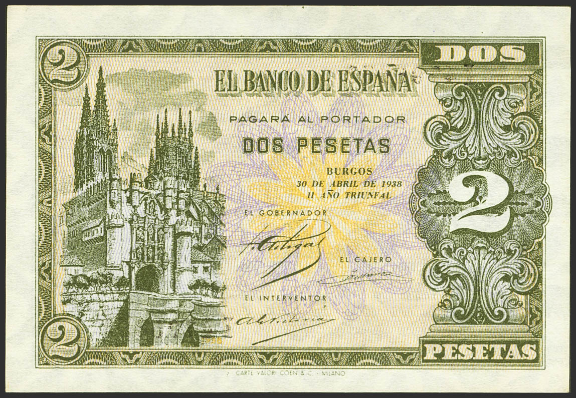2 Pesetas. April 30, 1938. Series I. (Edifil 2021: 429a, Pick: 109a). Original sizing. Uncirculated.