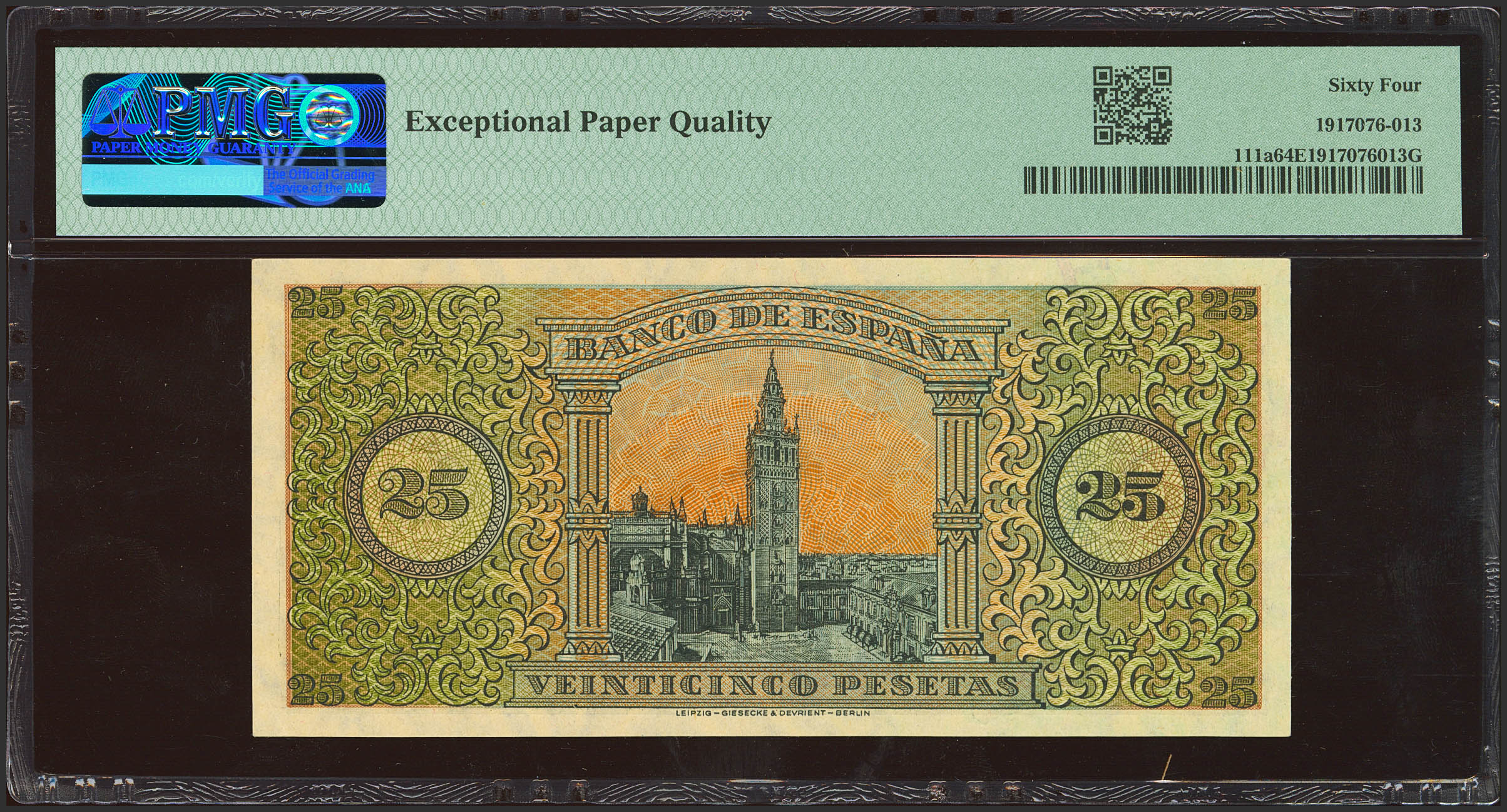 25 Pesetas. May 20, 1938. Series A. (Edifil 2021: 430a, Pick: 111a). Unusual in this quality, original sizing. Uncirculated. PMG64EPQ package.