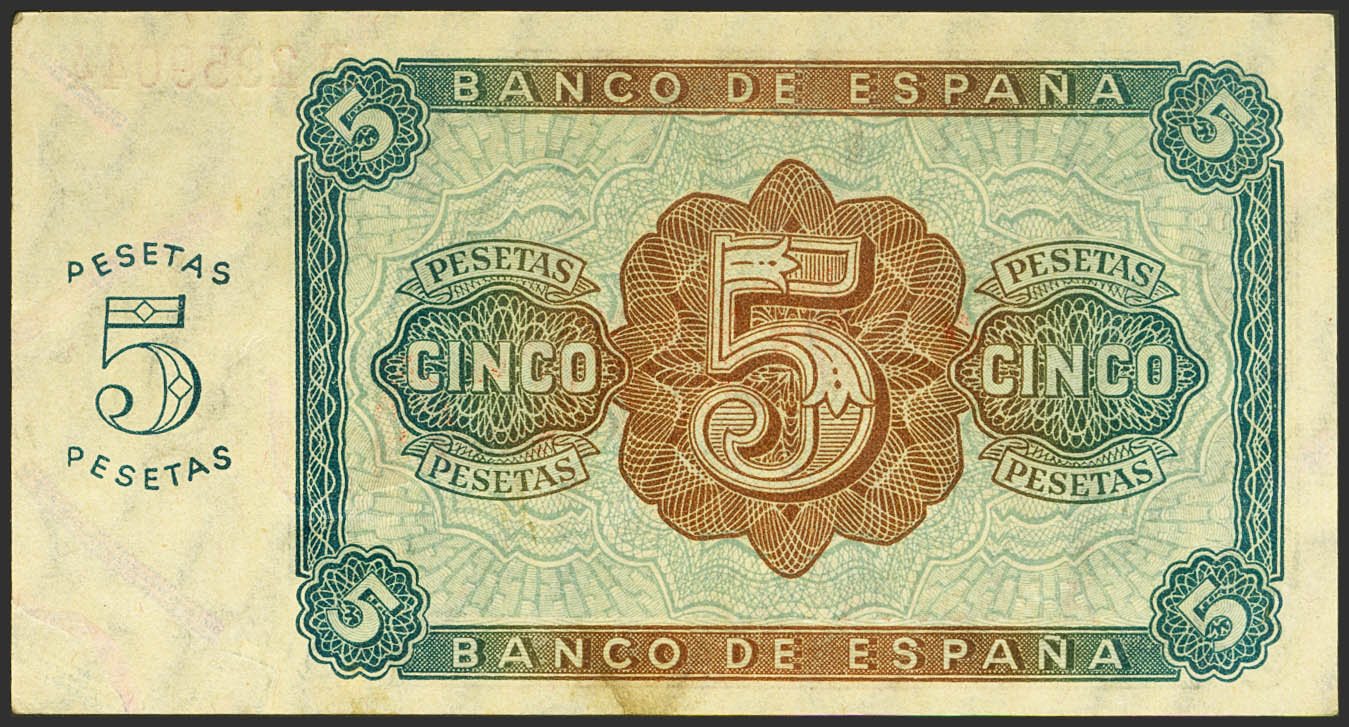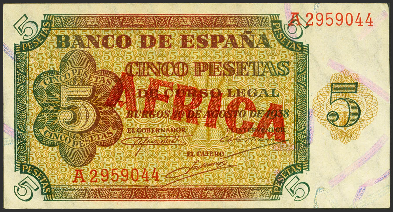 5 Pesetas. August 10, 1938. Series A. (Edifil 2021: 435A). AFRICA typographic overload, in red. Extremely rare, it retains all its original finish. Good Extremely Fine. It matches the one photographed at Edifil and the one auctioned at the Caja Madrid Auction. The differentiation of money in circulation in some territories of a country is a mechanism originally designed to prevent capital flight and maintain sufficient cash in that area. A simple mechanism to accomplish this task is the use of stamps, wet or dry. A Ministerial Order of April 22, 1939 urged the stamping of the word “AFRICA” on the Francoist emissions of 1938, in theory with the justification of preventing smuggling in the Protectorate of Morocco, estimated at about 300 million pesetas. Only those could circulate in the region, preventing their illegal entry into the rest of Spanish territory. The idea for this project came from Juan Beigbeder Atienza, then High Commissioner of Spain in Morocco. There was never any official regulation on the matter, only two proposals from the Ministry of Finance, and they were never put into circulation for fear of the drop in the price of the peseta in the Tangier area. Yes, some dies were engraved with the stamp and typographic stamping was carried out diagonally on the obverse of a series of banknotes. It is not clear if they limited themselves to creating a sample series or if millions of pesetas were actually stamped, because the survivors are minimal. There are also forgeries of these stamps made using wet stamps in modern times. The original plates, as mentioned for letterpress printing, have a subtle pattern inside each letter precisely to make counterfeiting difficult; modern ink pads cannot reproduce it. Needless to say, these authentic banknotes are extraordinarily rare, if not unique.