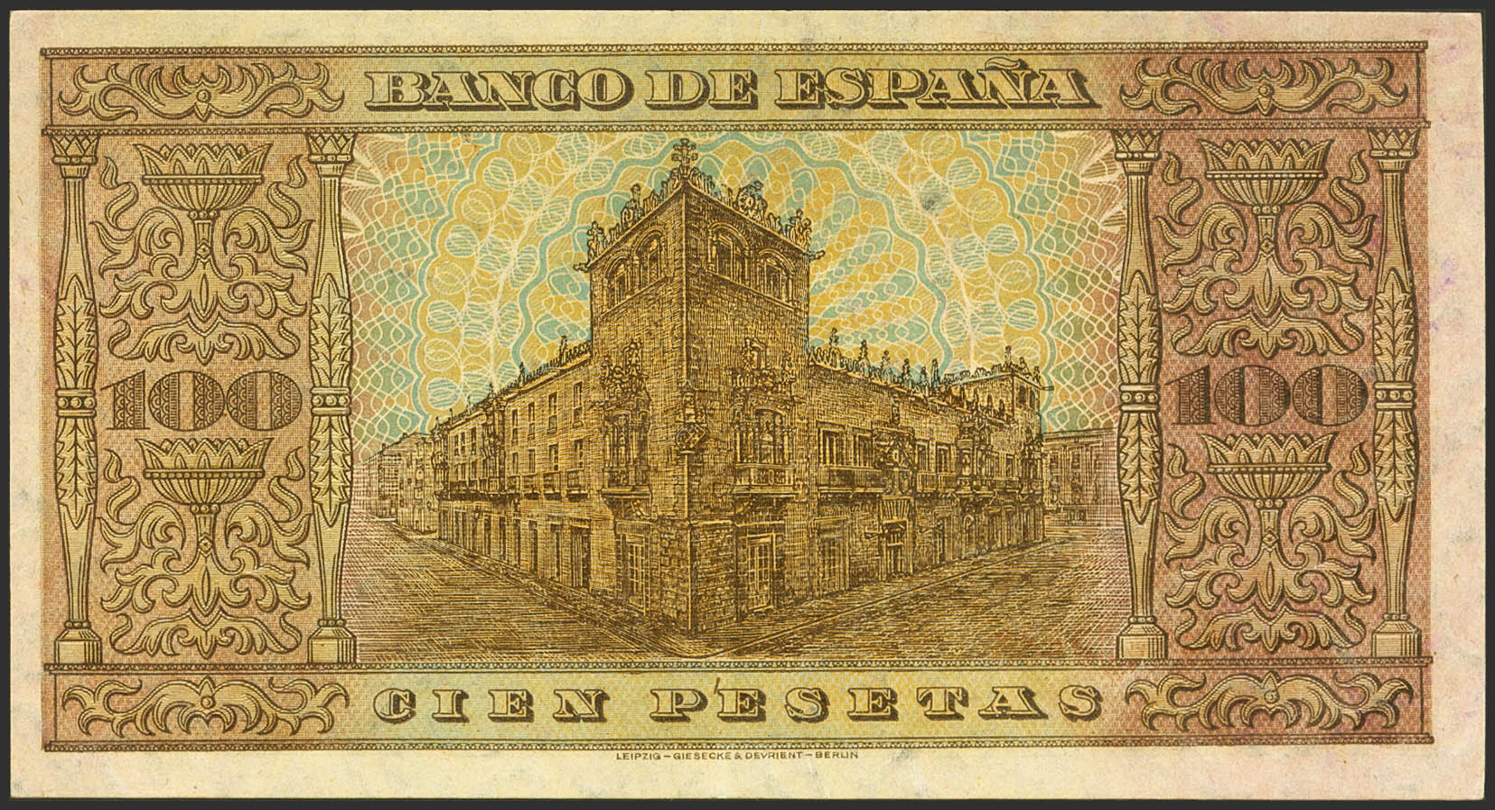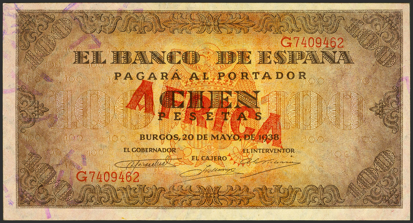 100 Pesetas. May 20, 1938. Series G. (Edifil 2021: 432a, Pick: 113a). AFRICA typographic overload, in red. Extremely rare, it retains all its original finish. Good Extremely Fine. It matches the one photographed at Edifil and the one auctioned at the Caja Madrid Auction.