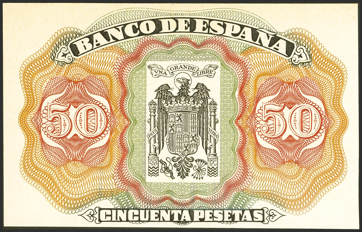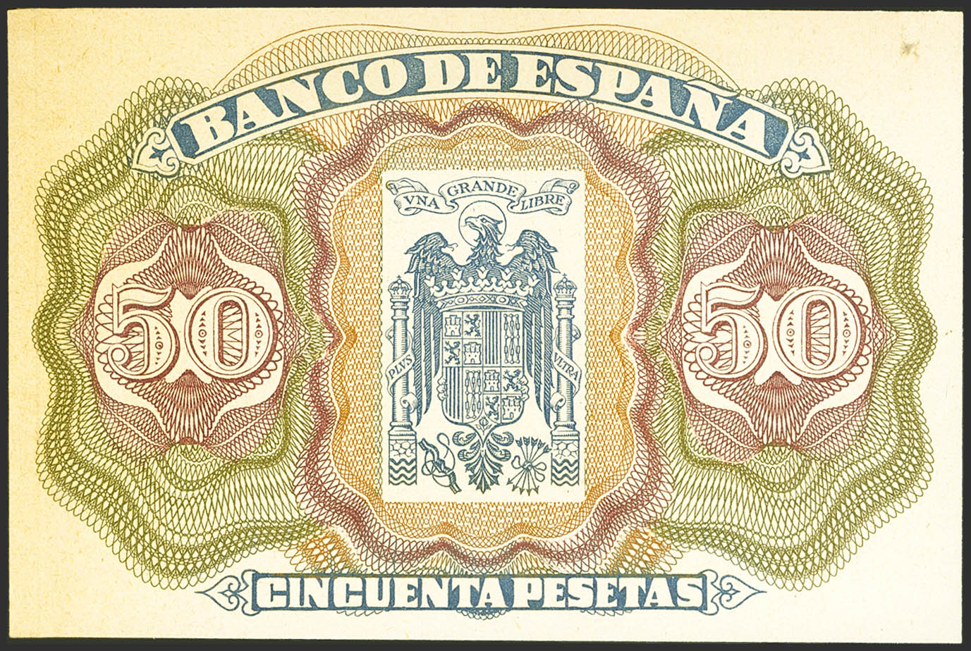 Set of 2 proofs of 50 Pesetas from the back of a model Not Issued in 1939, in different colors. (Edifil 2021: NE47P). Almost Uncirculated/ Good Extremely Fine.