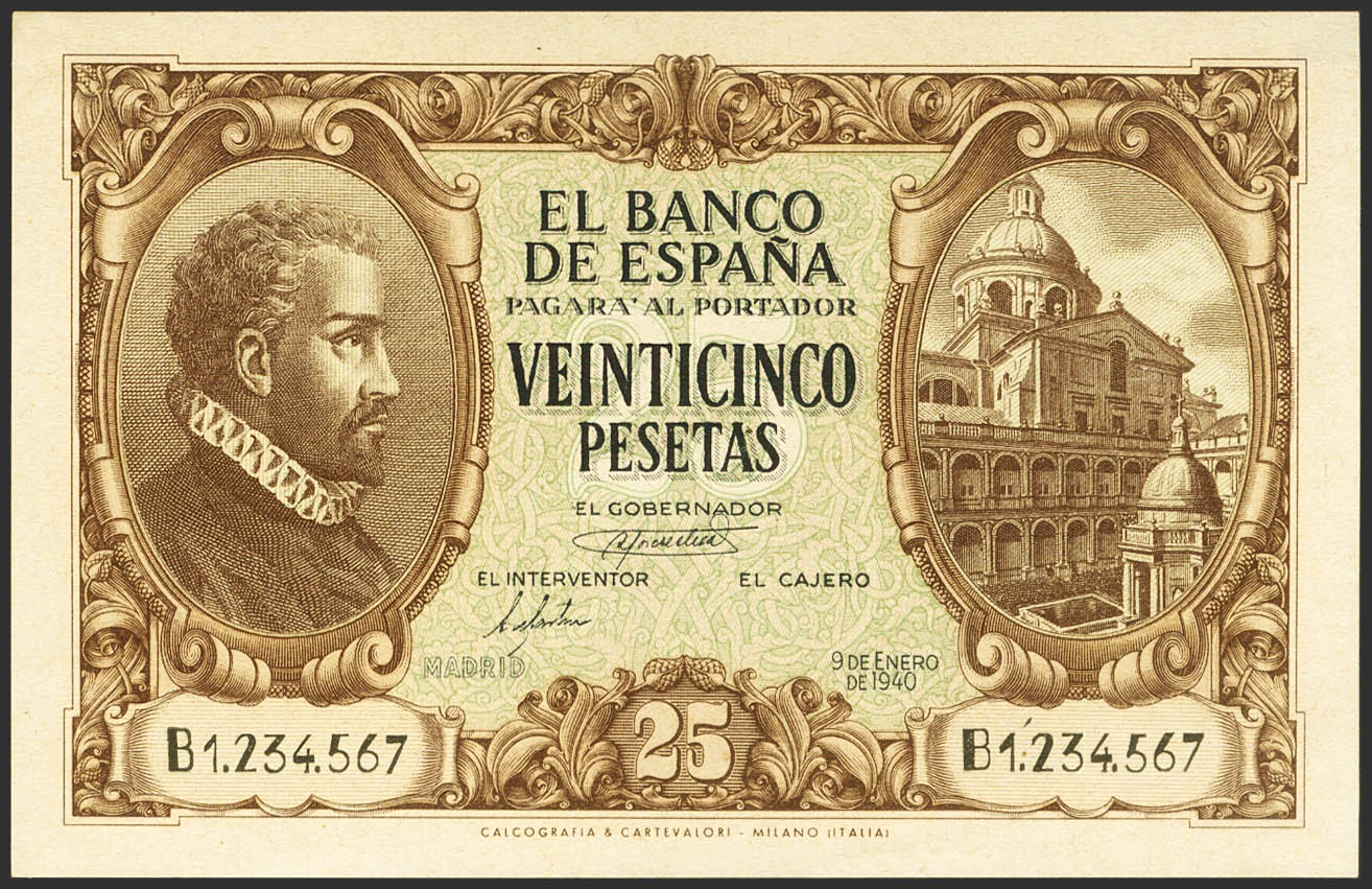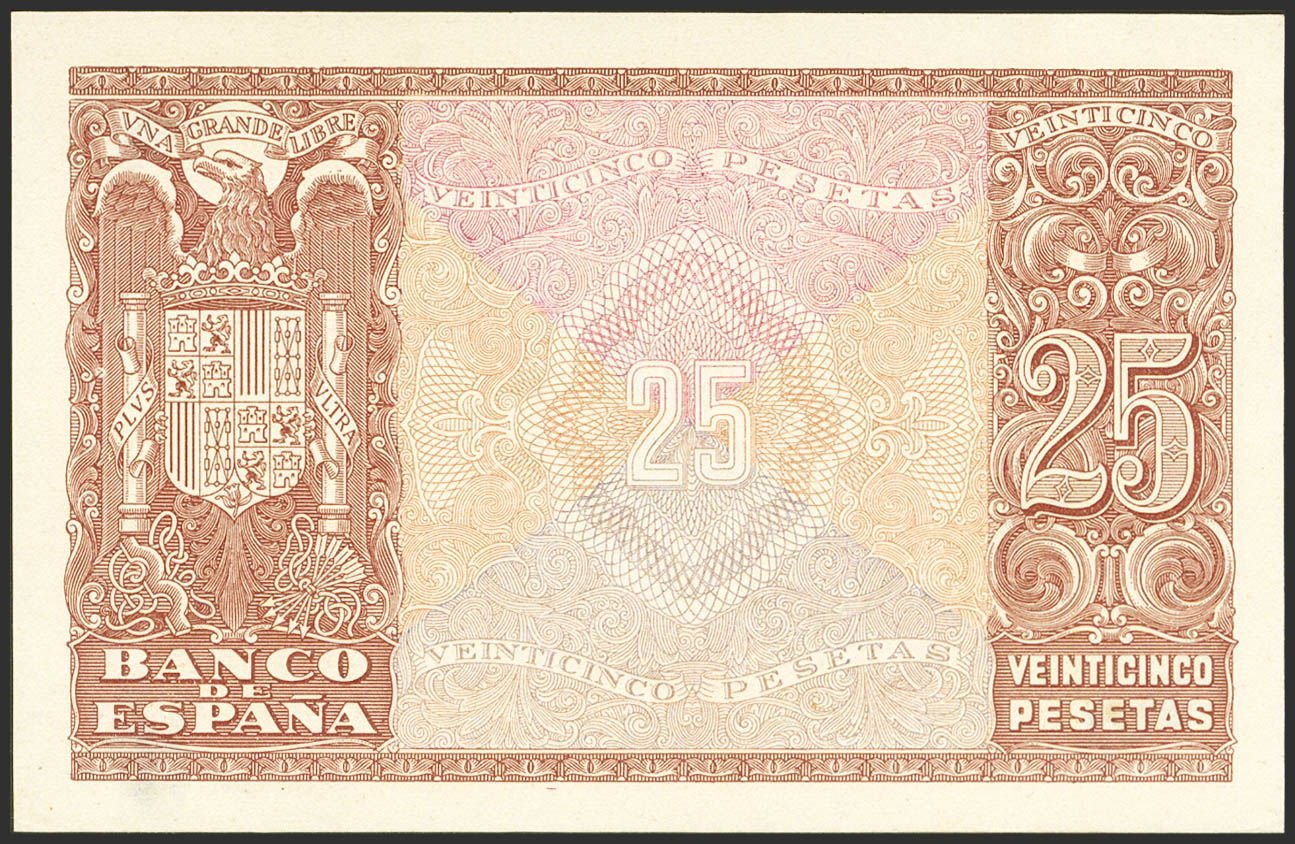 English 25 Pesetas. January 9, 1940. Proof of the obverse and reverse with a non-definitive color and with the numbering B1234567 (consecutive numbers). (Edifil 2021: 438P, 438Pa). Extraordinarily rare, previously mounted on cardboard. Almost Uncirculated-.