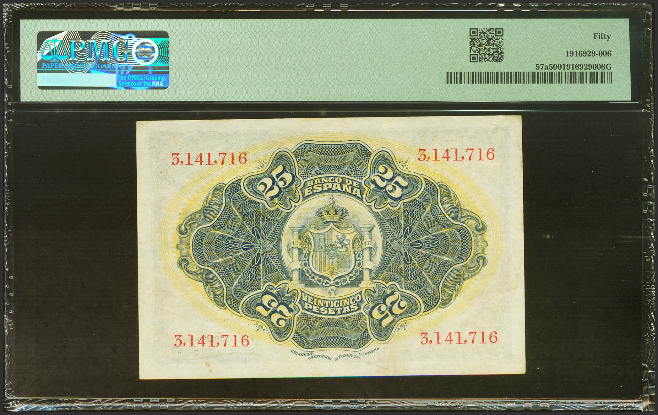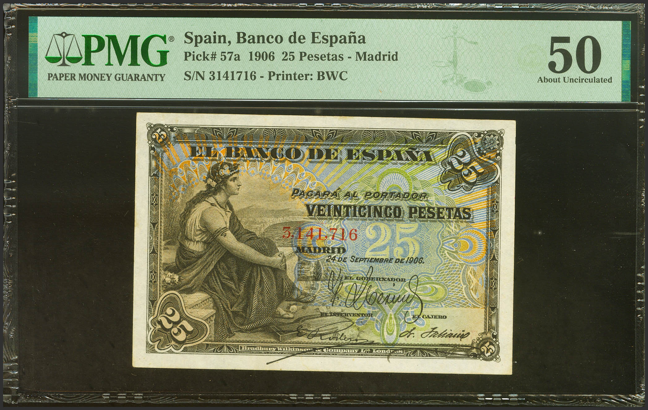 25 Pesetas. September 24, 1906. No series. (Edifil 2023: 314, Pick: 57a). Unusual. Extremely Fine. PMG50 encapsulation.