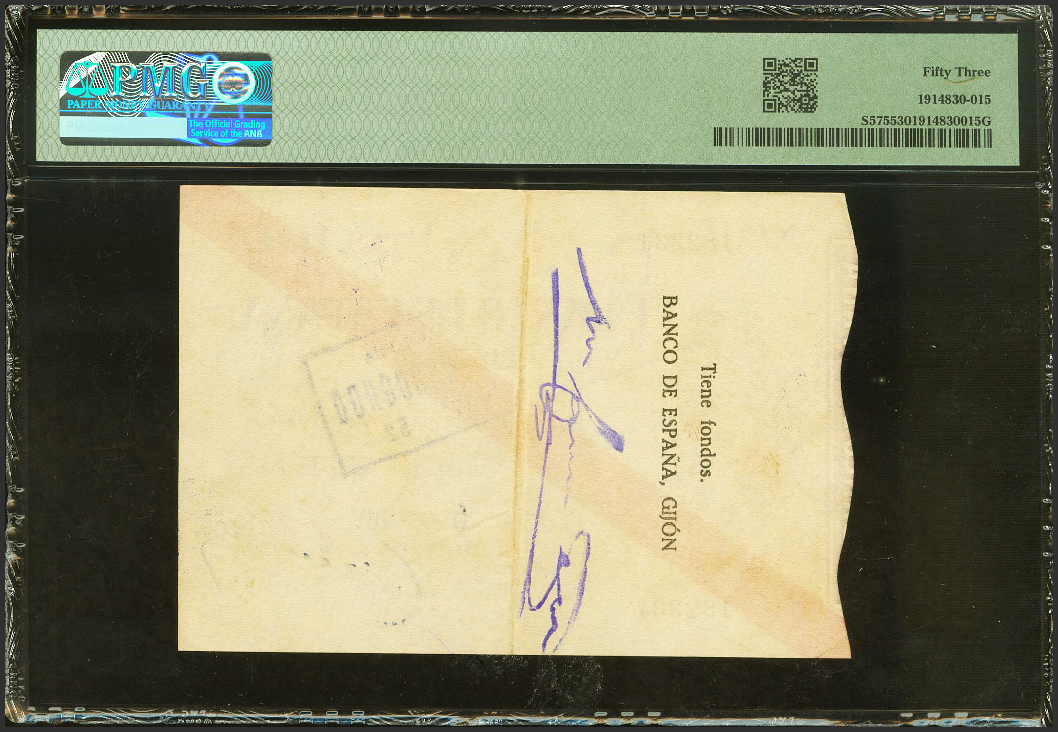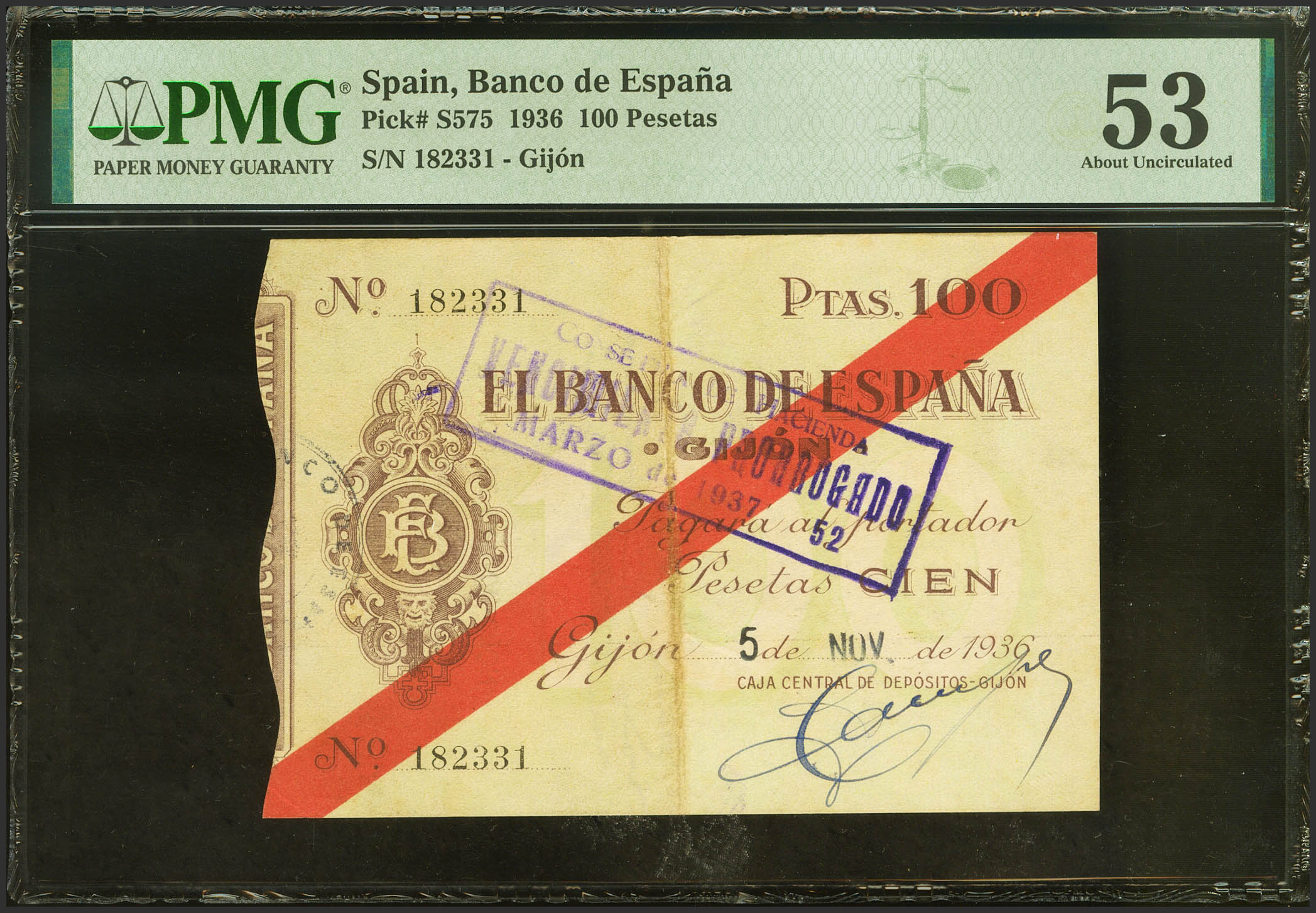 100 Pesetas. November 5, 1936. Gijón Branch. No serie. (Edifil 2021: 384). Rare, especially in this exceptional quality for this banknote, which is always in low qualities. Extremely Fine. PMG53 encapsulation.