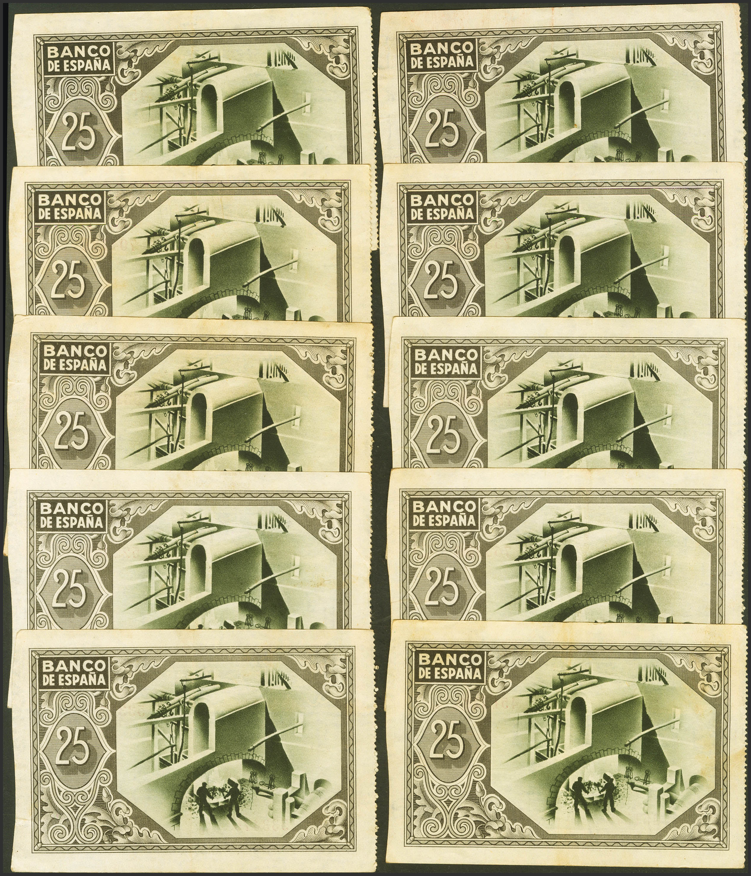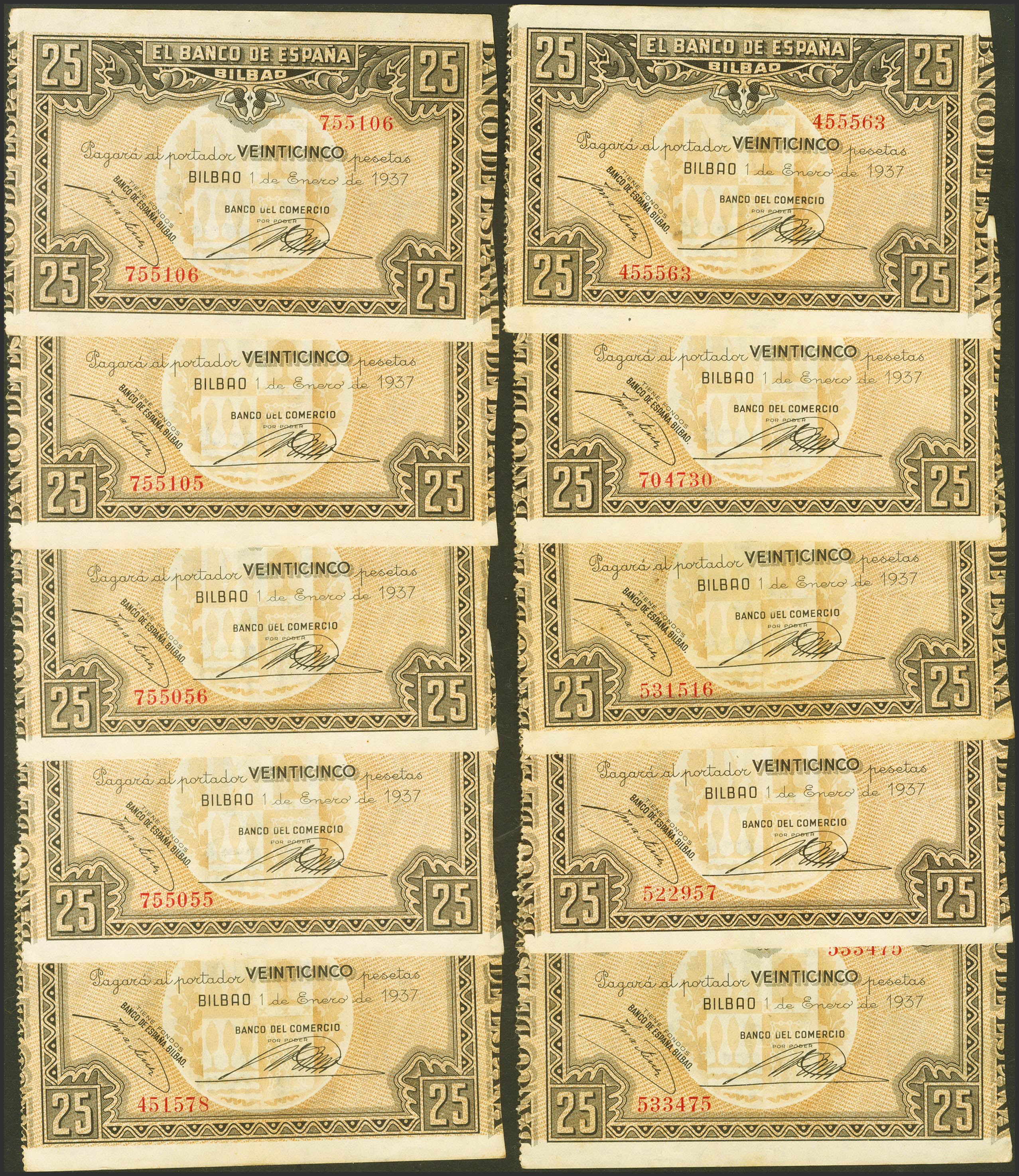 English Set of 10 25 Pesetas banknotes from the Banco de Bilbao, issued on January 1, 1937, all of them without series and with various antesignatures. (Edifil 2023: 388). Extremely Fine/ Almost Extremely Fine.