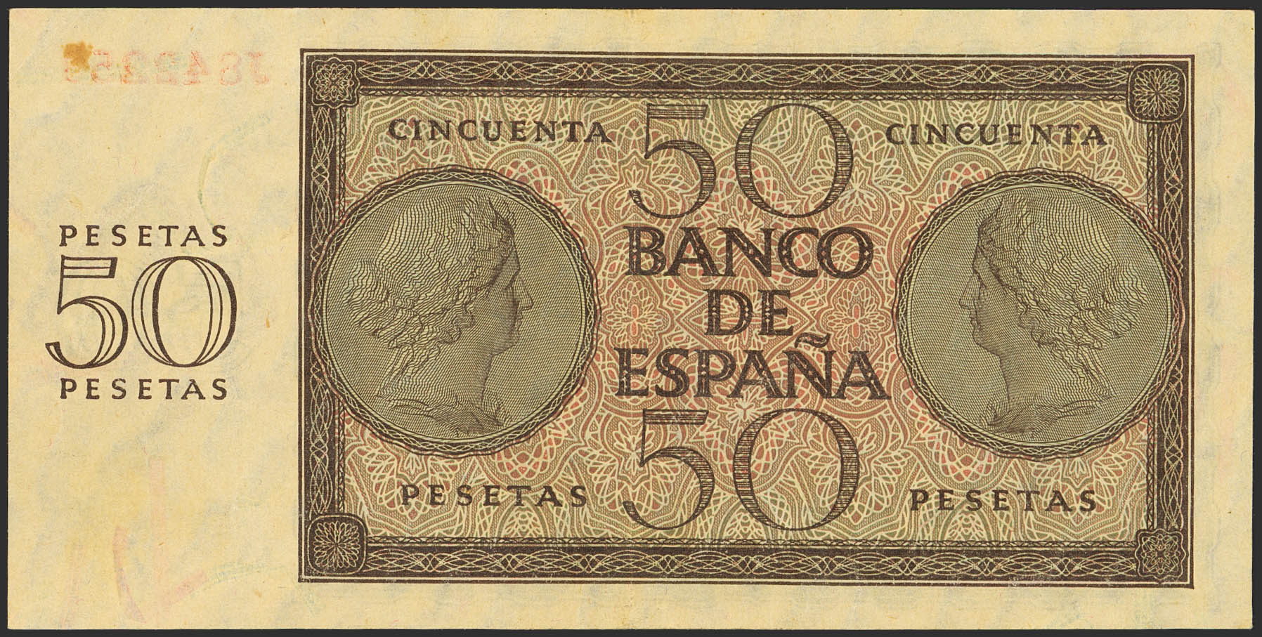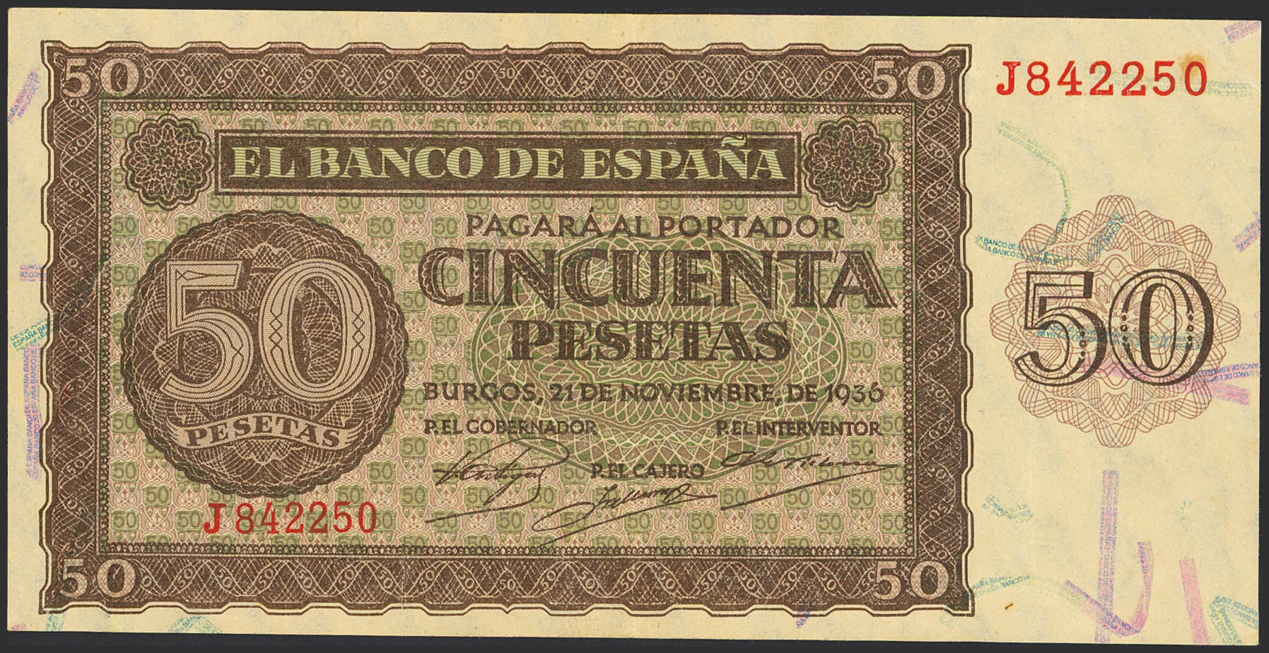 English 50 Pesetas. November 21, 1936. Series J. (Edifil 2023: 420a). It retains part of its original finish. Extremely Fine.