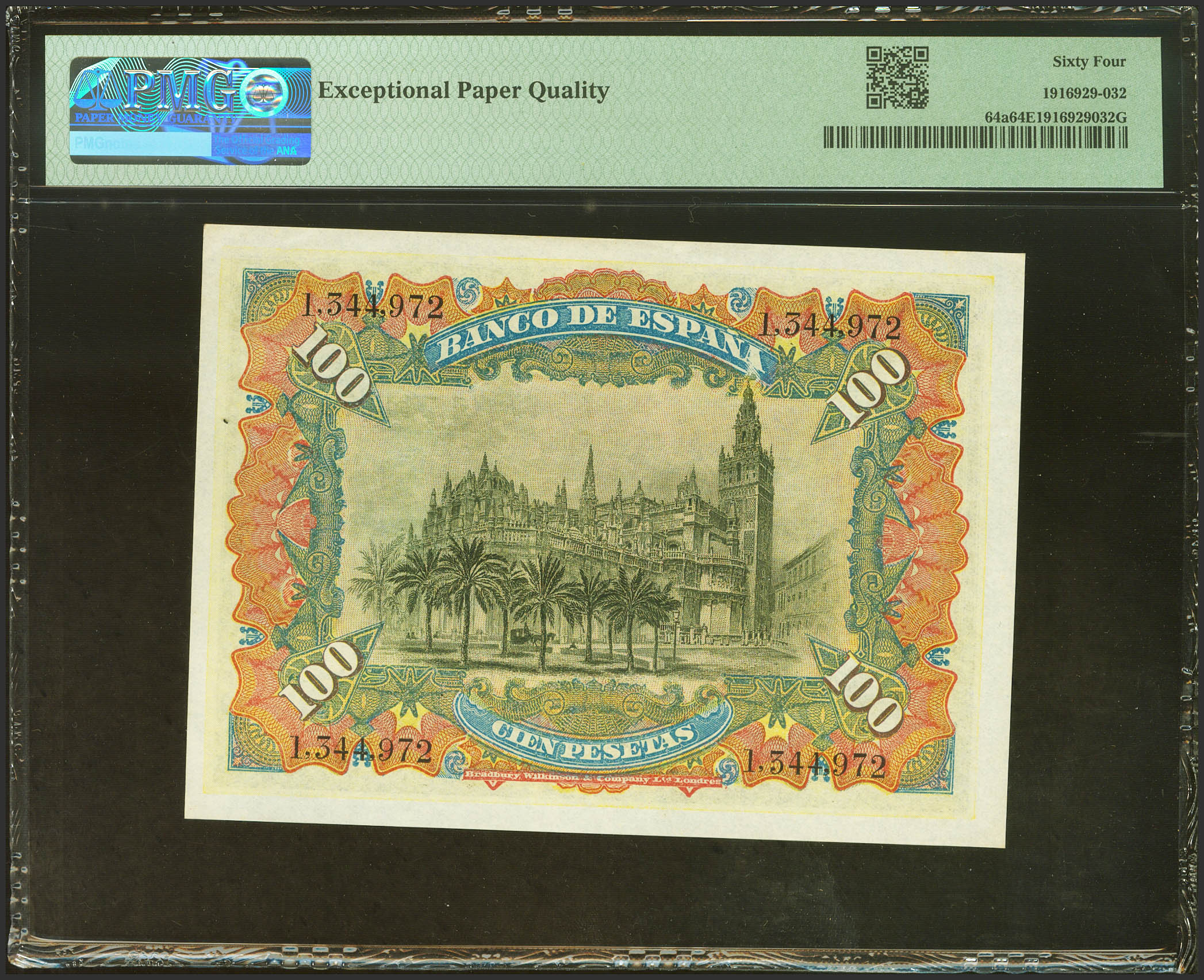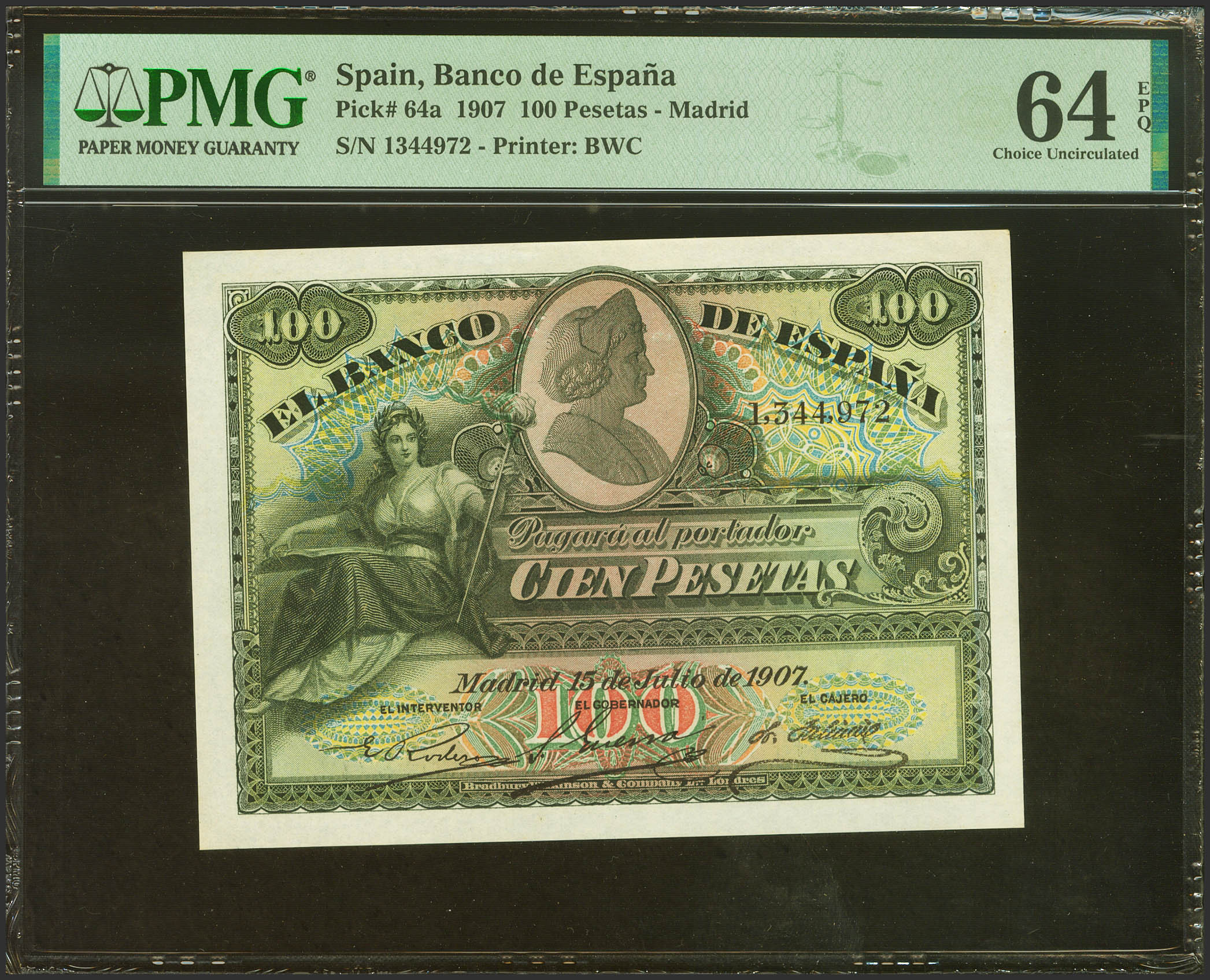 100 Pesetas. July 15, 1907. No series. (Edifil 2023: 320, Pick: 64a). Extraordinarily rare, especially in this quality, original sizing. Uncirculated. PMG64EPQ package. (to give us an idea of the rarity, as of February 1, 2024, this bill is the fifth best graded along with three other examples in PMG)