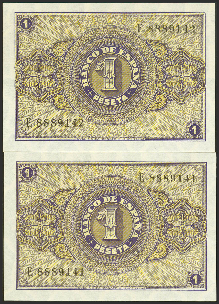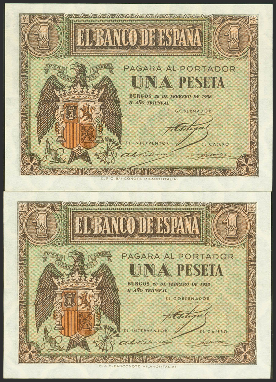 English 1 Peseta. February 28, 1938. Correlative pair. Series E. (Edifil 2021: 427a). It retains all its original finish. Almost Uncirculated.
