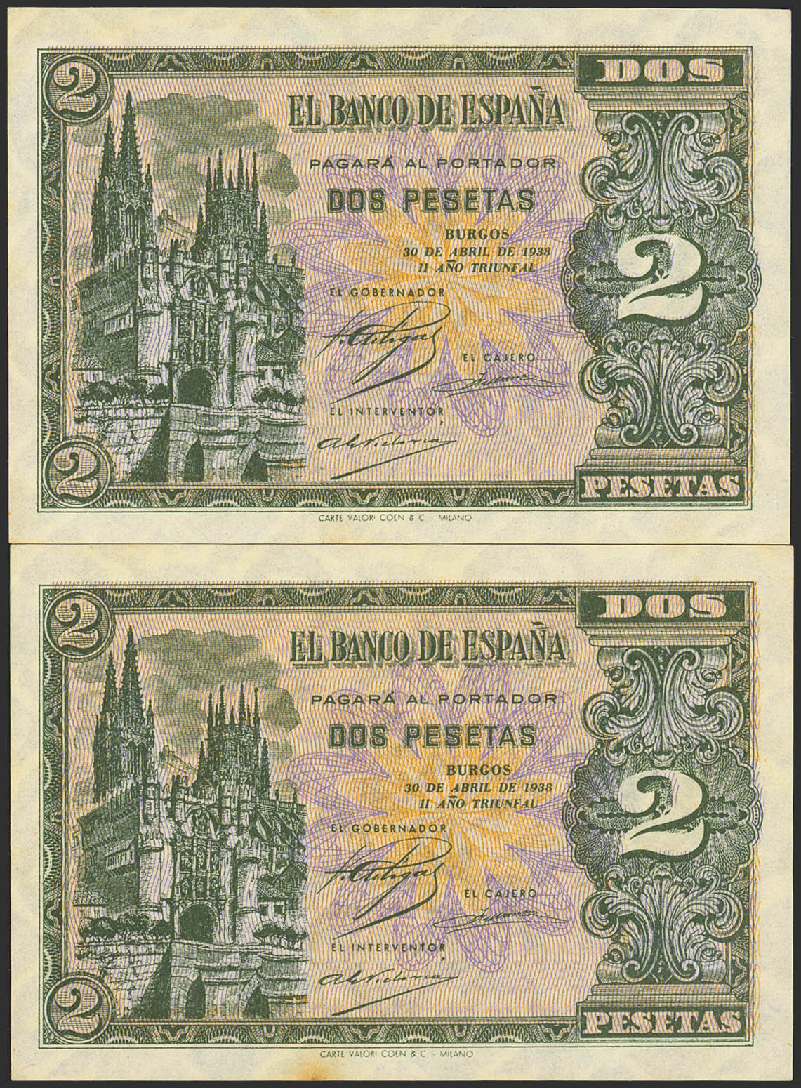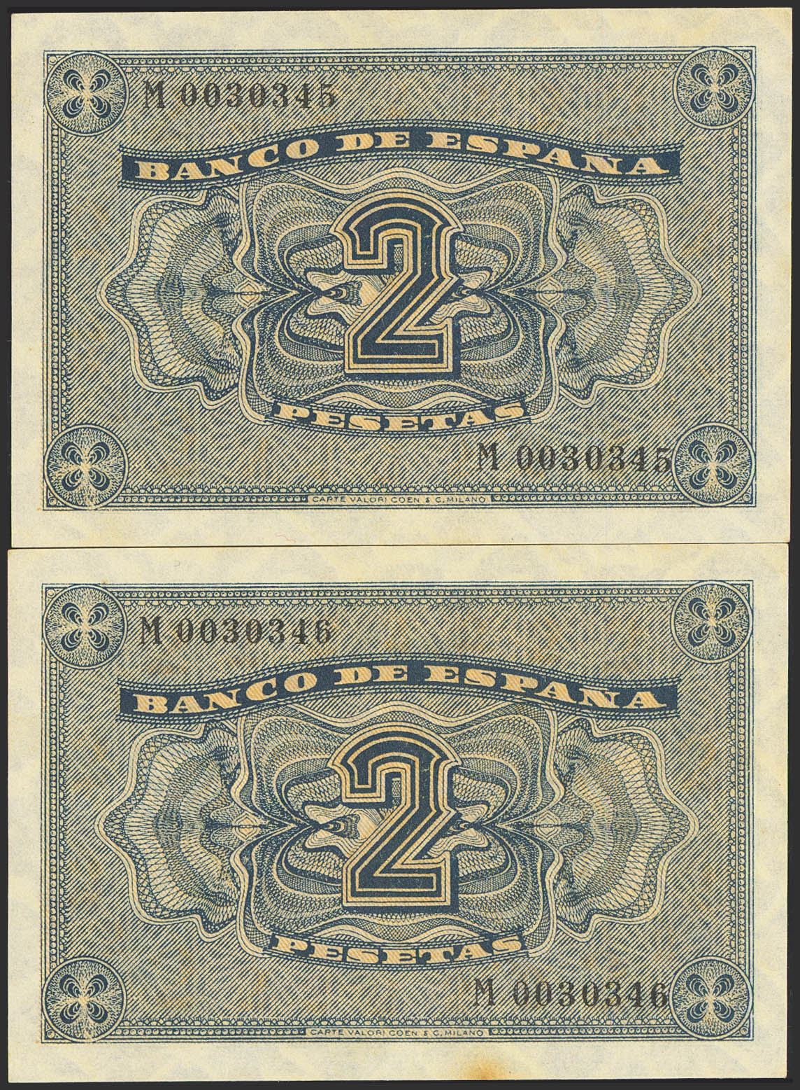 2 Pesetas. April 30, 1938. Correlative pair. Series M. (Edifil 2023: 429a). It retains all its original finish, one of them stained by time. Almost Uncirculated.