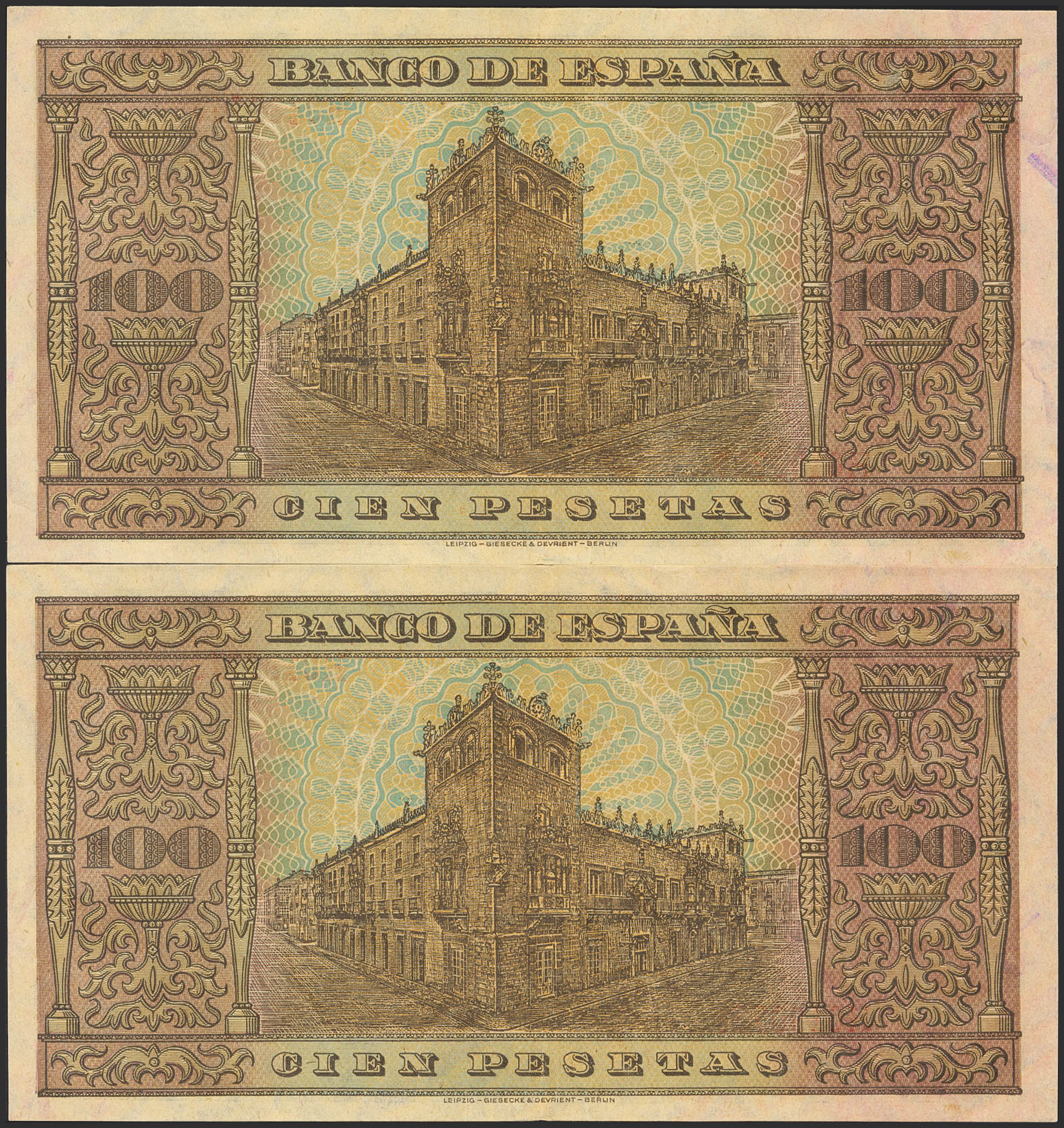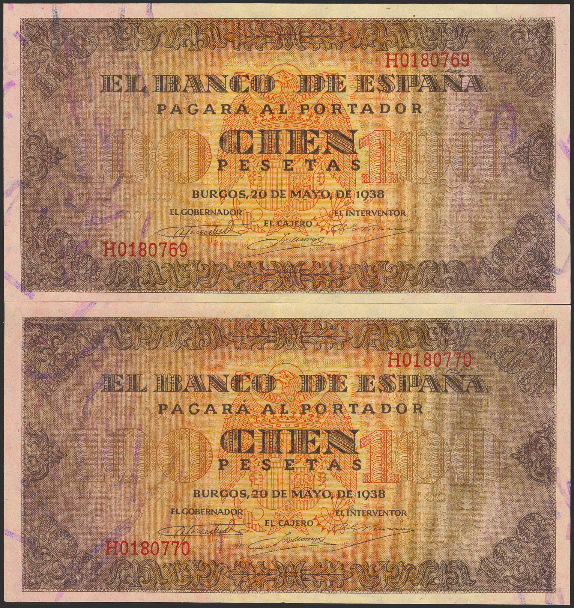 100 Pesetas. May 20, 1938. Correlative pair. Series H, last series broadcast. (Edifil 2023: 432b). Original sizing, natural fold of the paper. Uncirculated.