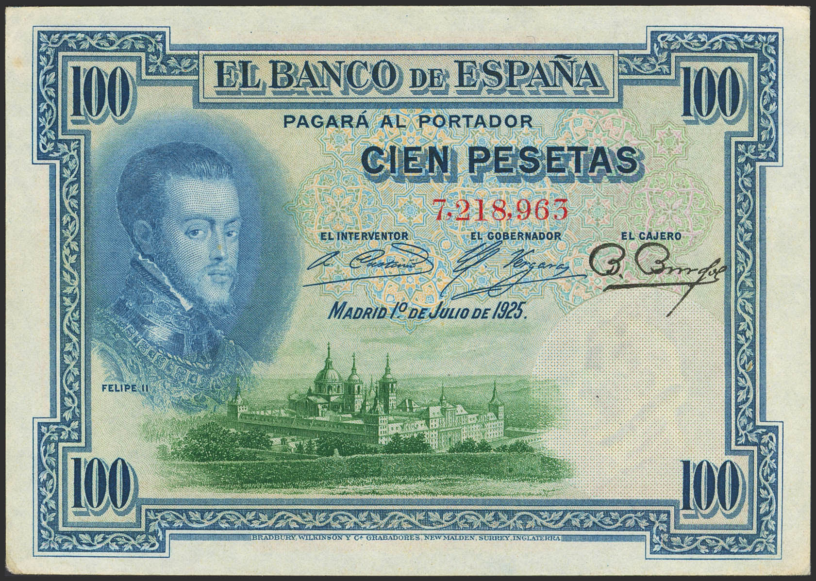100 Pesetas. July 1, 1925. No series. (Edifil 2023: 323). Good Very Fine.