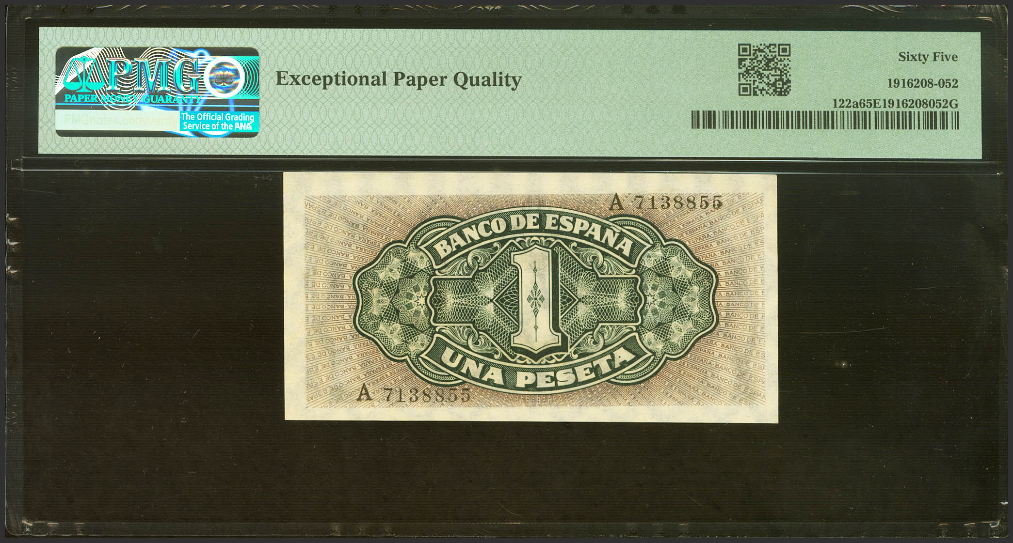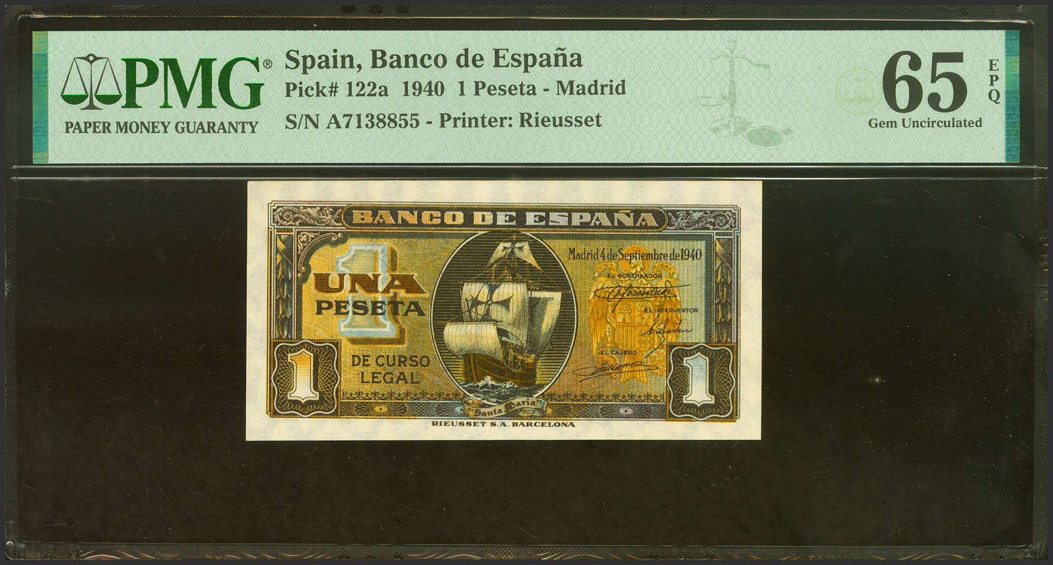 1 Peseta. September 4, 1940. Series A. (Edifil 2023: 442a, Pick: 122a). Rare in this exceptional quality, original sizing. Uncirculated. PMG65EPQ package.