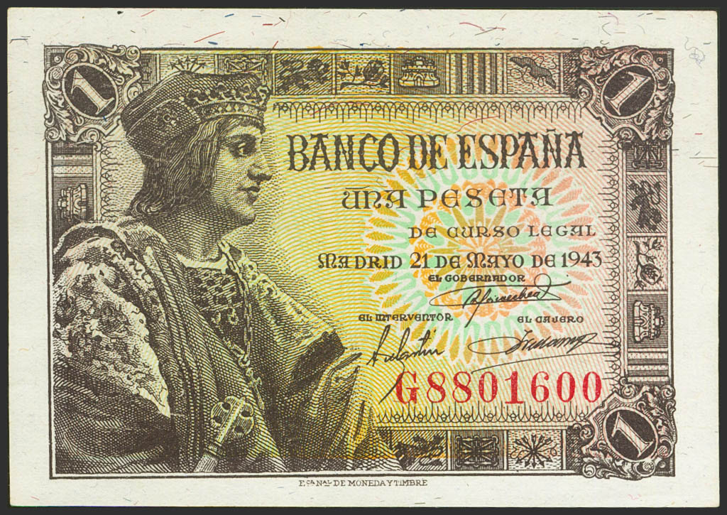 1 Peseta. May 21, 1943. Series G. (Edifil 2021: 447a). Original sizing. Almost Uncirculated.
