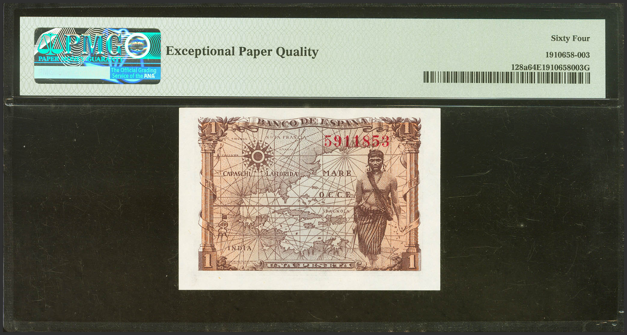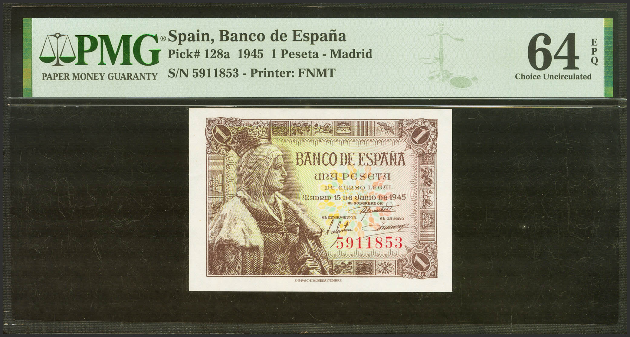 1 Pesetas. June 15, 1945. No series. (Edifil 2023: 448, Pick: 128a). Unusual in this quality, original sizing. Uncirculated. PMG64EPQ package.