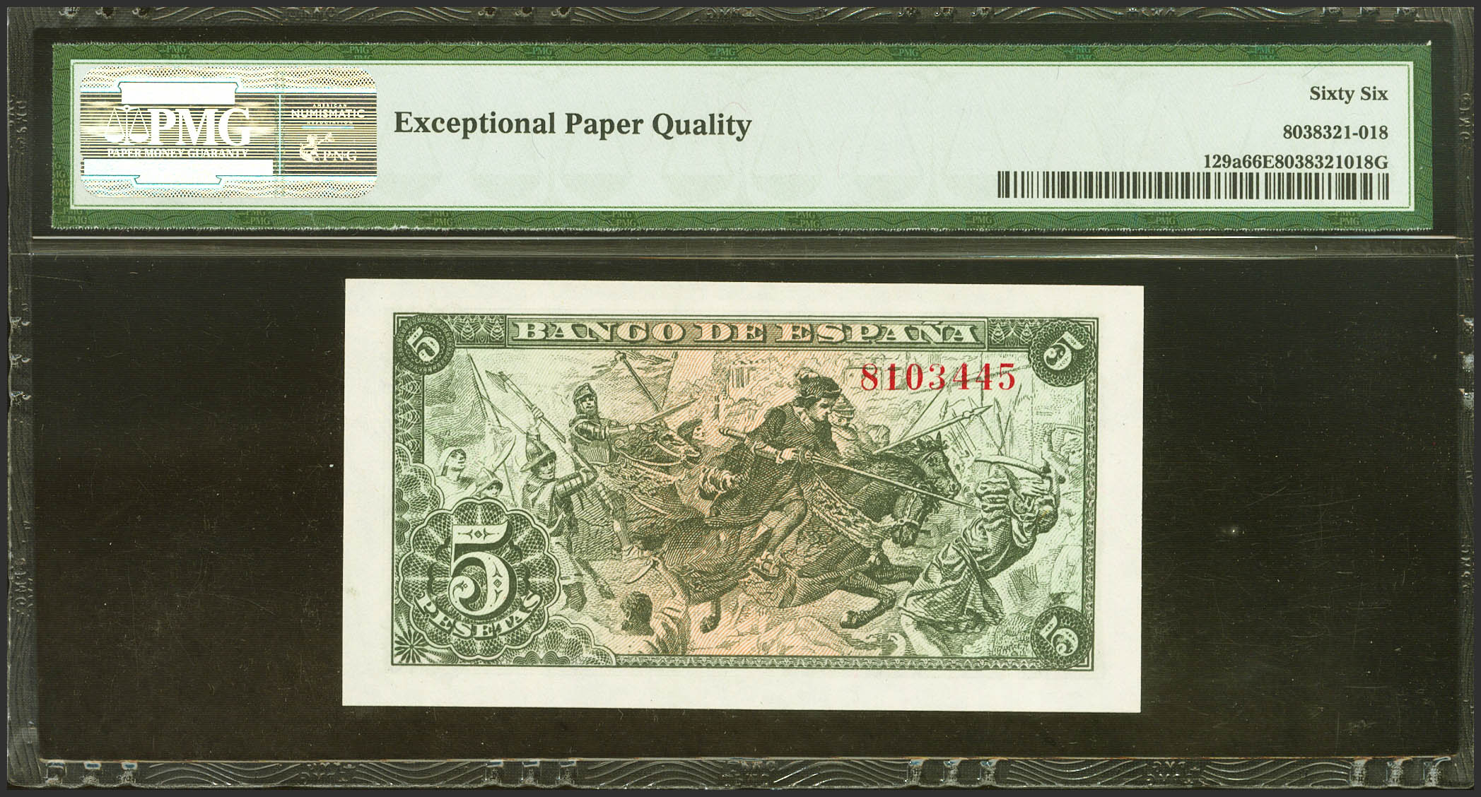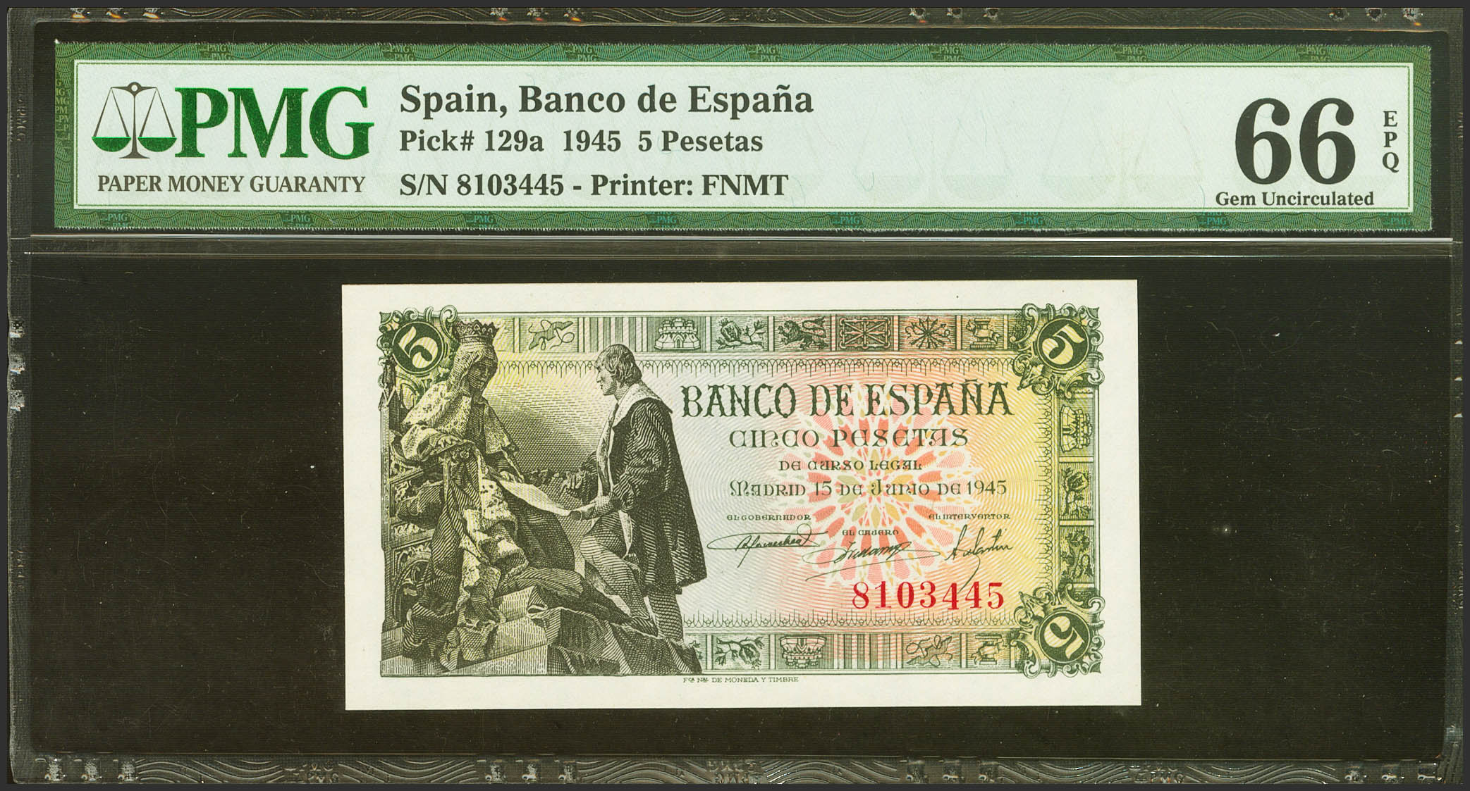 English 5 Pesetas. June 15, 1945. No series. (Edifil 2021: 449, Pick: 129a). Unusual in this quality, original sizing. Uncirculated. PMG66EPQ package.
