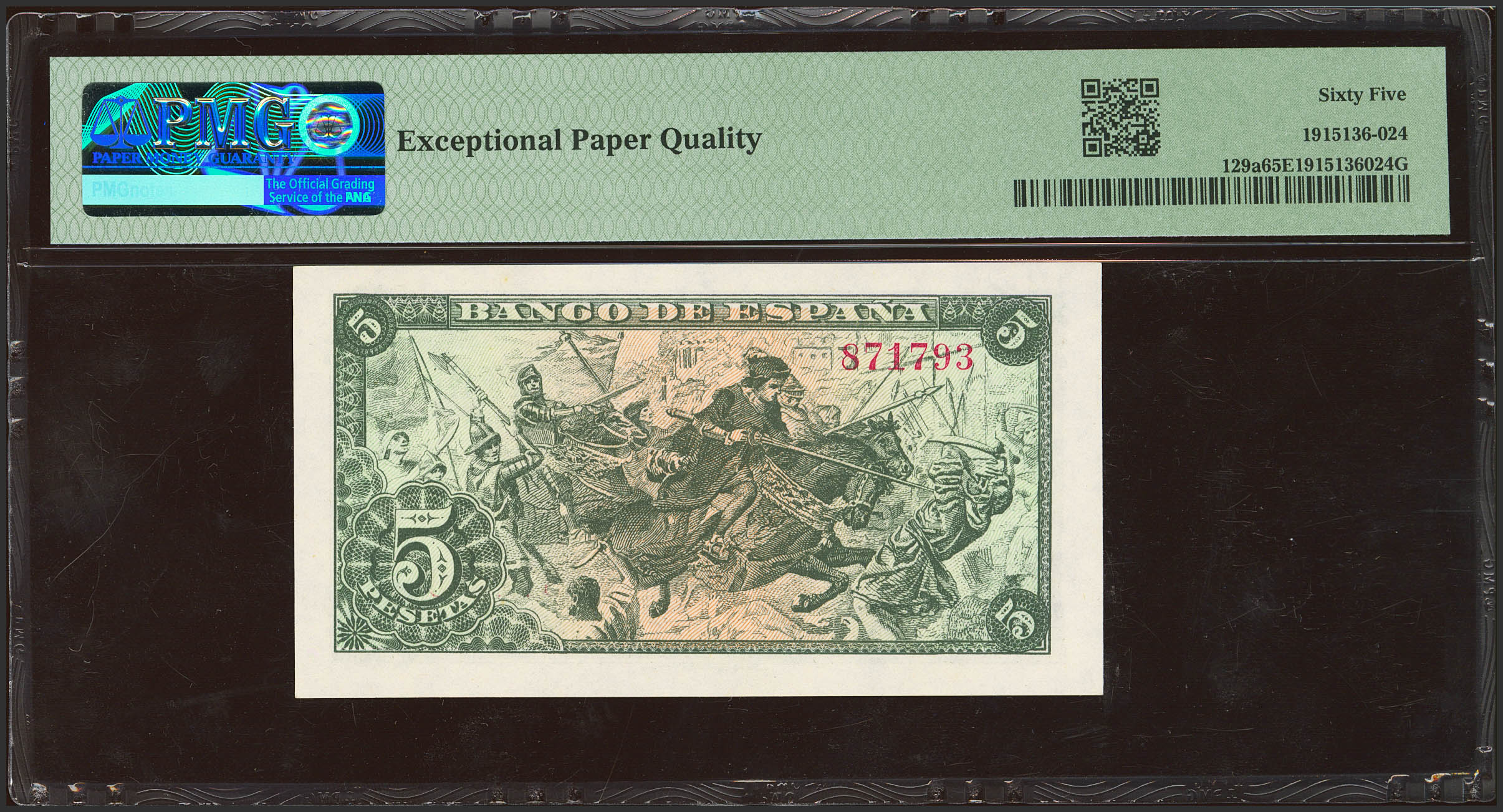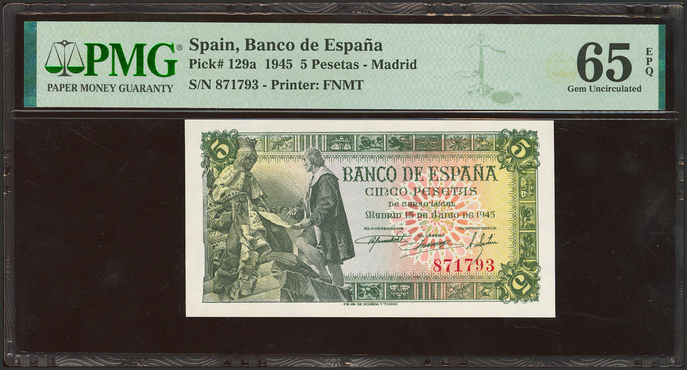 English 5 Pesetas. June 15, 1945. No series. (Edifil 2023: 449, Pick: 129a). Unusual in this quality, original sizing. Uncirculated. PMG65EPQ package.