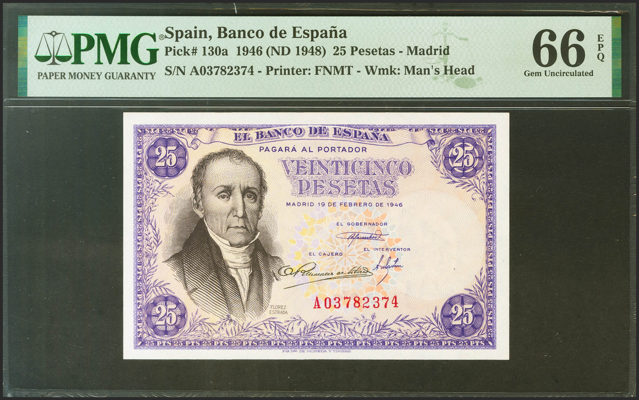 English 25 Pesetas. February 20, 1946. Series A. (Edifil 2021: 450a, Pick: 130a). Rare in this exceptional quality, original sizing. Uncirculated. PMG66EPQ package.