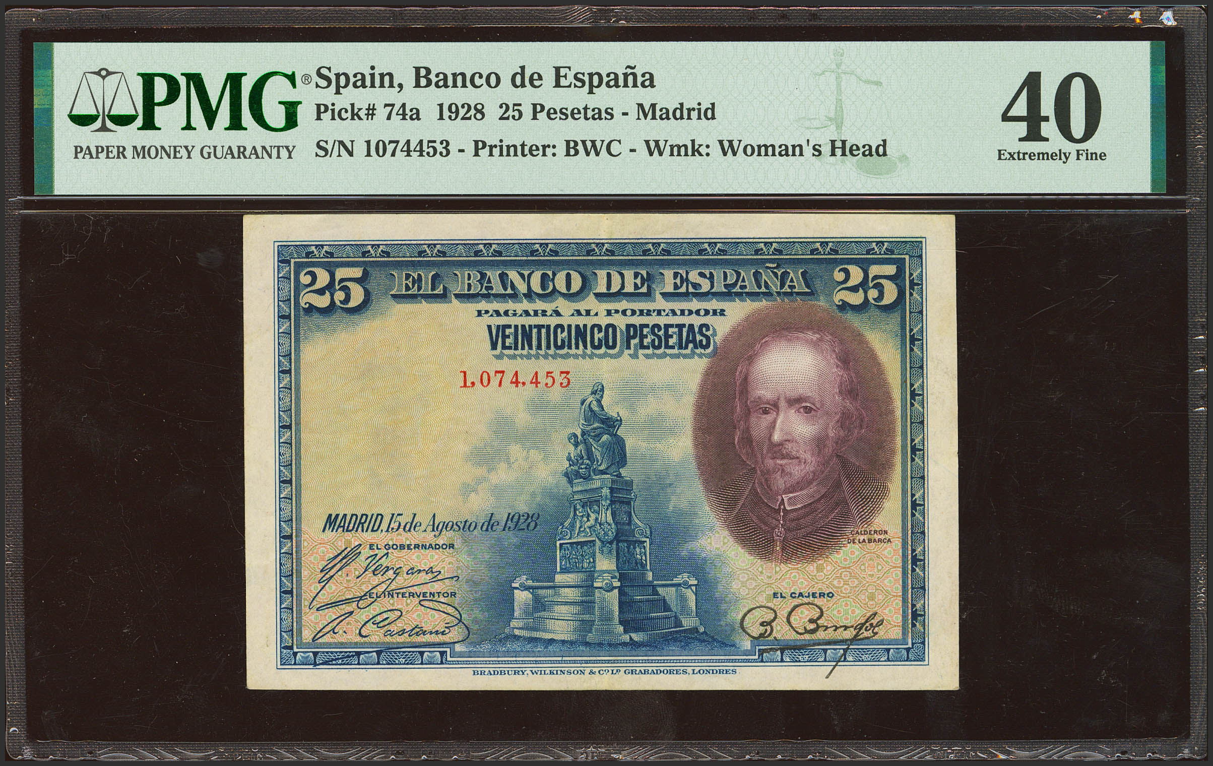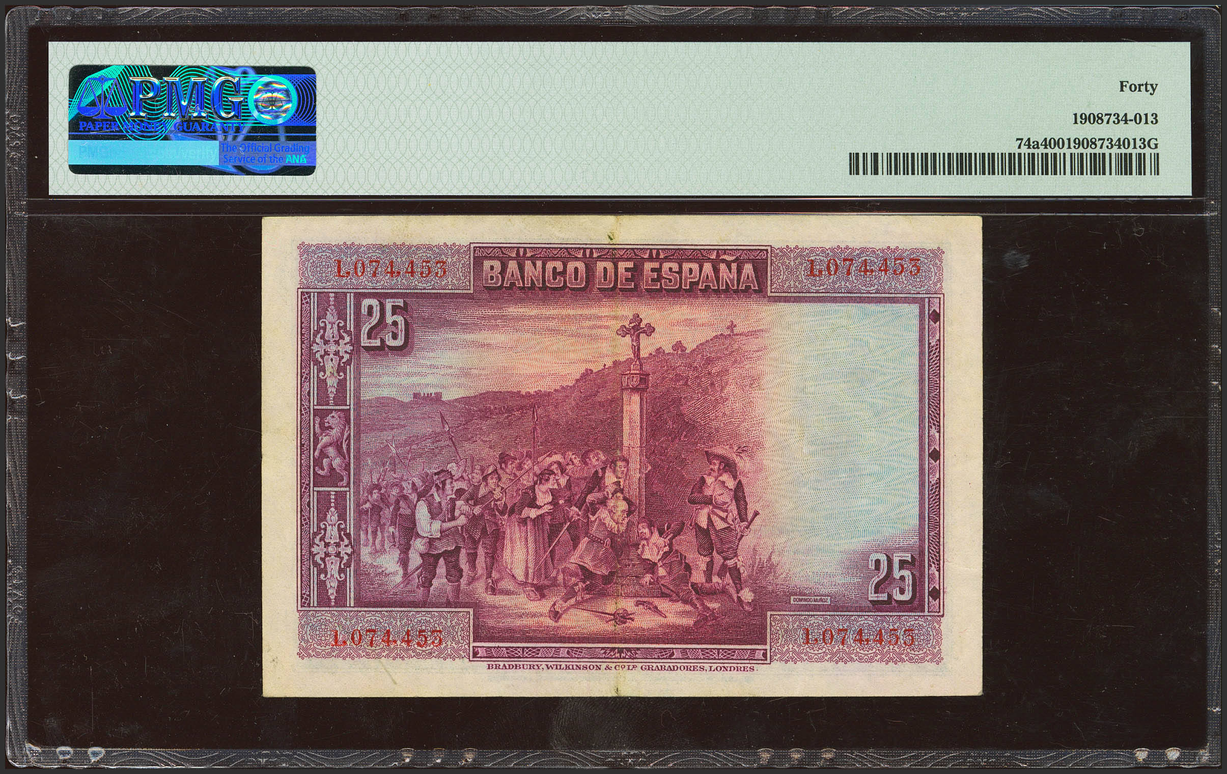 25 Pesetas. August 15, 1928. No series. (Edifil 2023: 328, Pick: 74a). Almost Extremely Fine. PMG40 encapsulation.