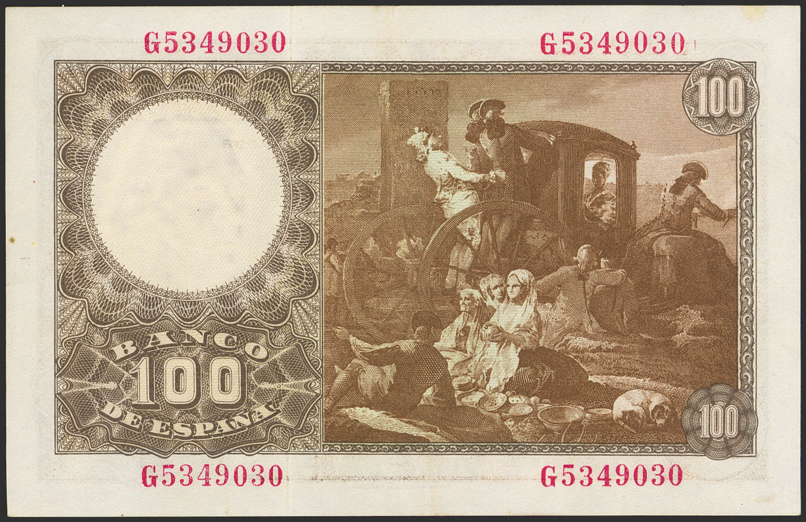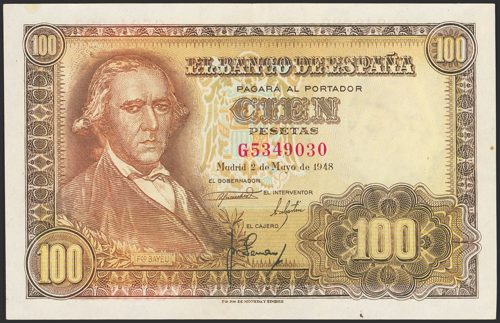 100 Pesetas. May 2, 1948. Series G. (Edifil 2023: 456a). It retains much of the original finish. Extremely Fine.