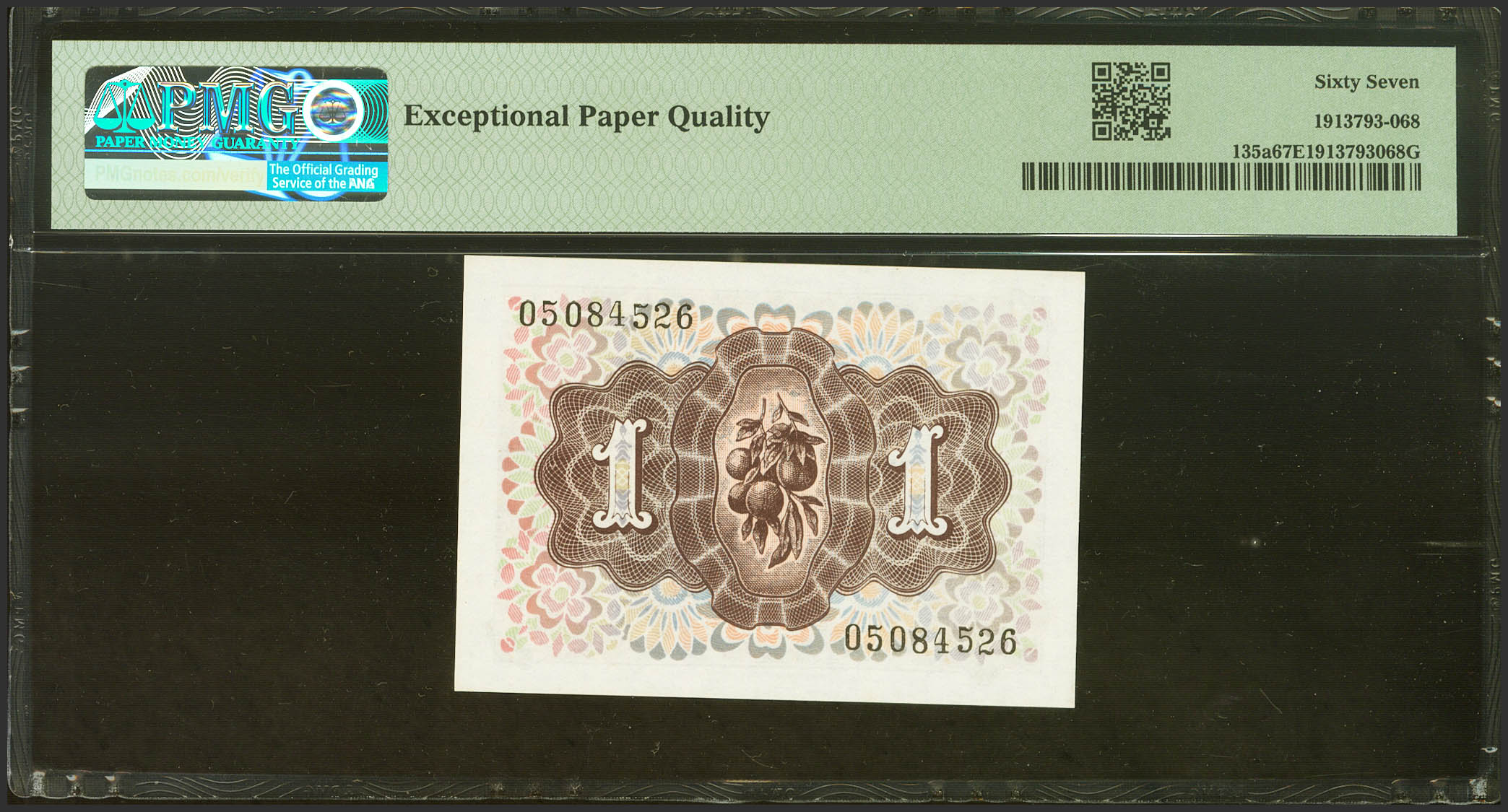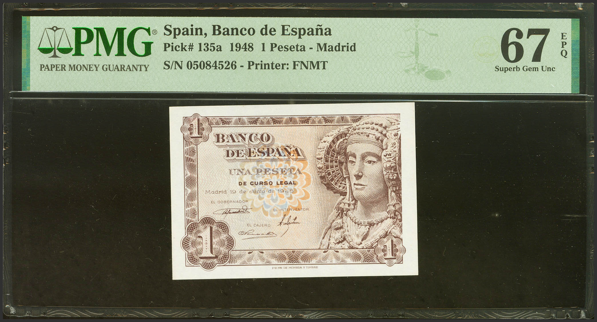 English 1 Peseta. June 19, 1948. No series. (Edifil 2023: 457, Pick: 135a). Unusual in this quality, original sizing. Uncirculated. PMG67EPQ package.