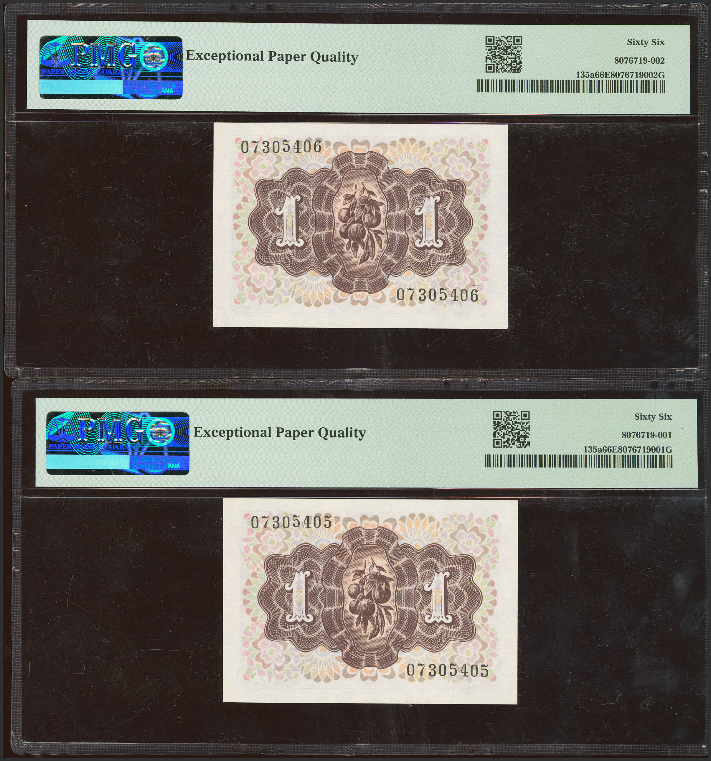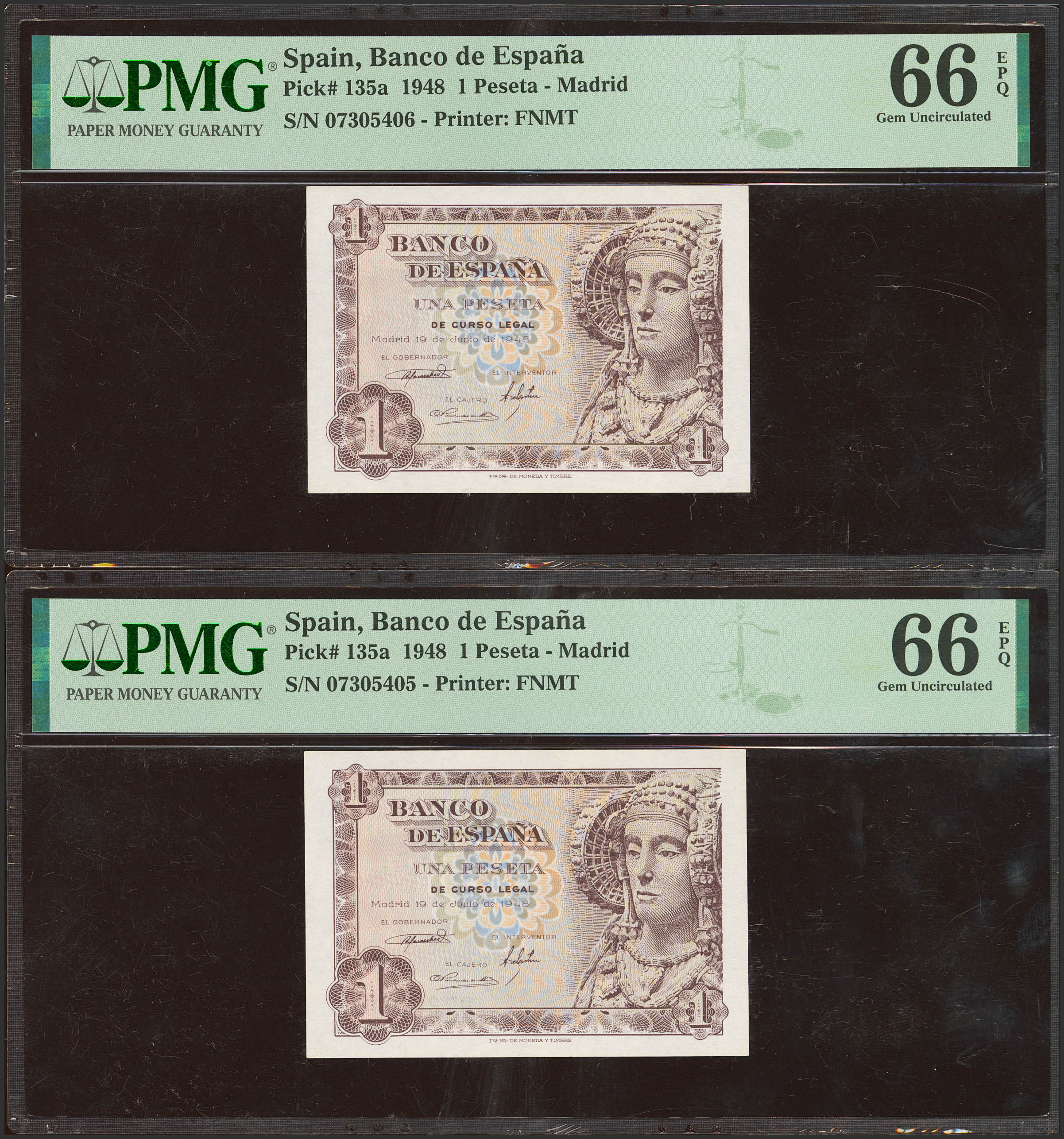 English 1 Peseta. June 19, 1948. Correlative couple. No serie. (Edifil 2023: 457, Pick: 135a). Rare in this quality, original sizing. Uncirculated. PMG66EPQ packages, both.