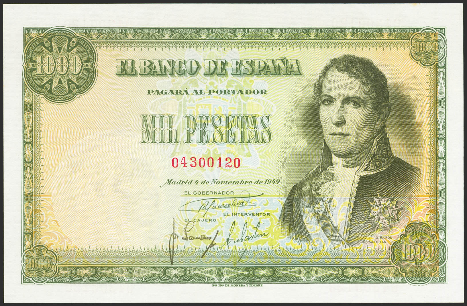 1000 Pesetas. November 4, 1949. No series. (Edifil 2021: 458). Unusual in this quality, it retains much of the original sizing. Good Extremely Fine.
