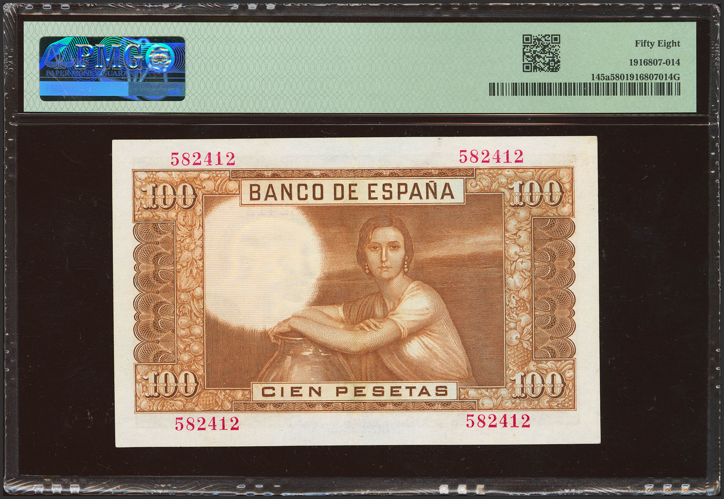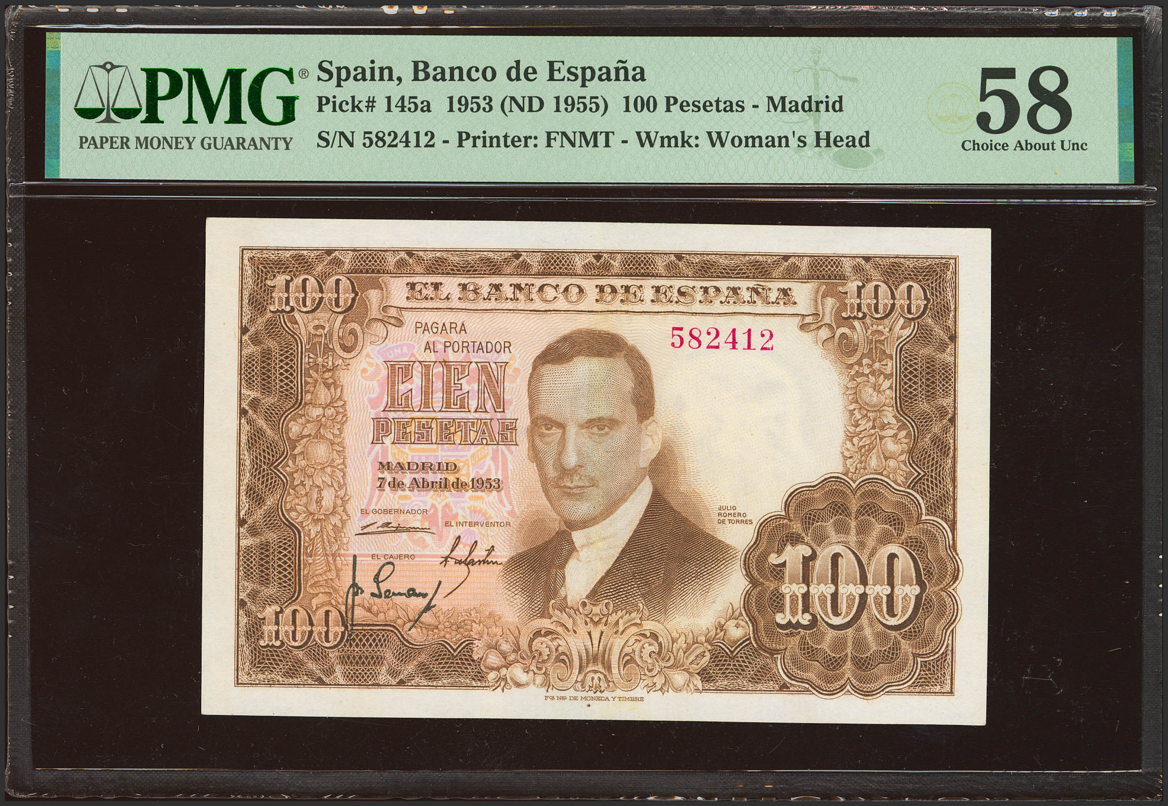 100 Pesetas. April 7, 1953. No series. (Edifil 2023: 464, Pick: 145a). EBC++. PMG58 encapsulation.