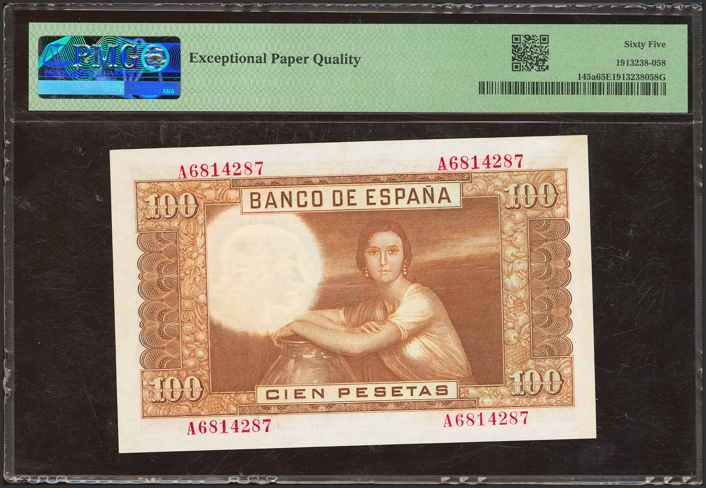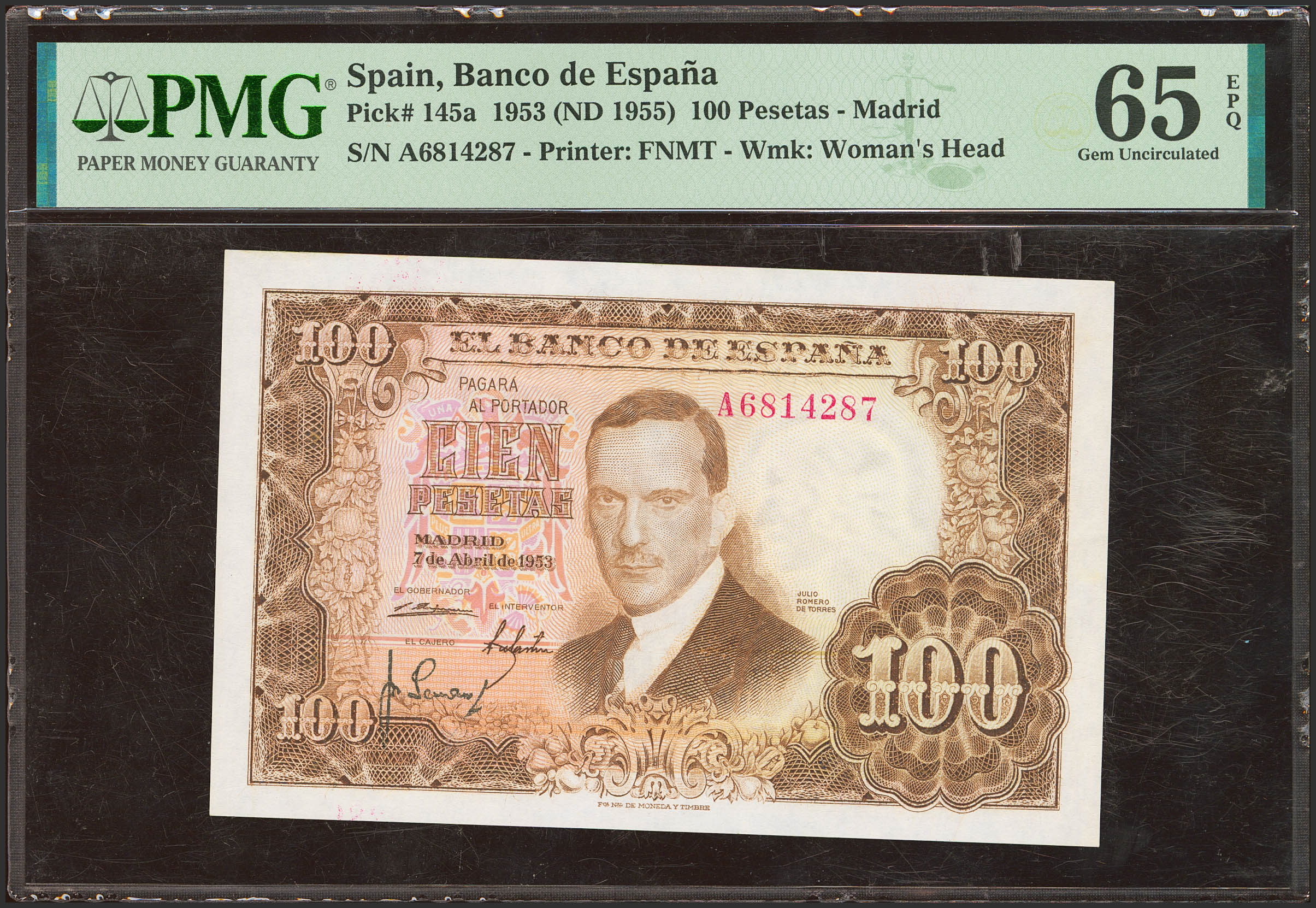 100 Pesetas. April 7, 1953. Series A. (Edifil 2023: 464a, Pick: 145a). Unusual in this quality, original sizing. PMG65EPQ package.
