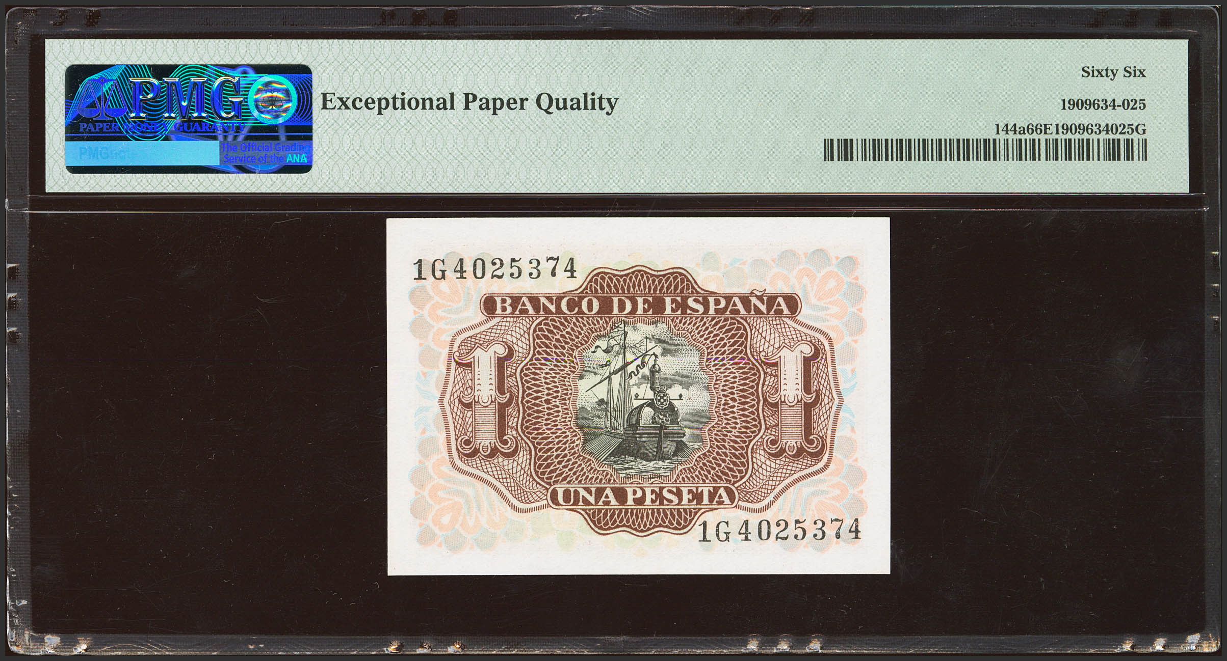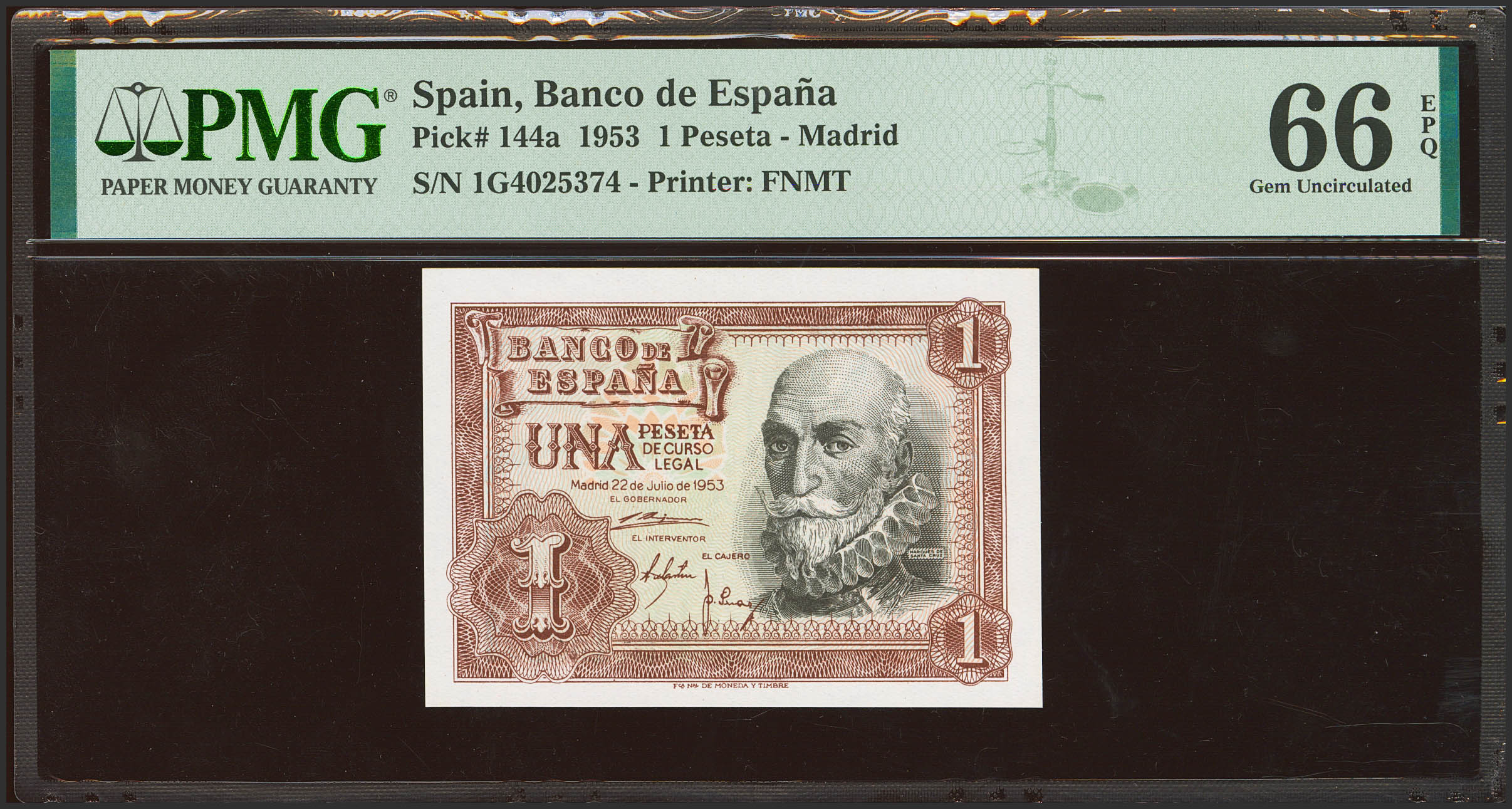 1 Peseta. July 22, 1953. Series 1G. (Edifil 2023: 465b, Pick: 144a). Original sizing. Uncirculated. PMG66EPQ package.