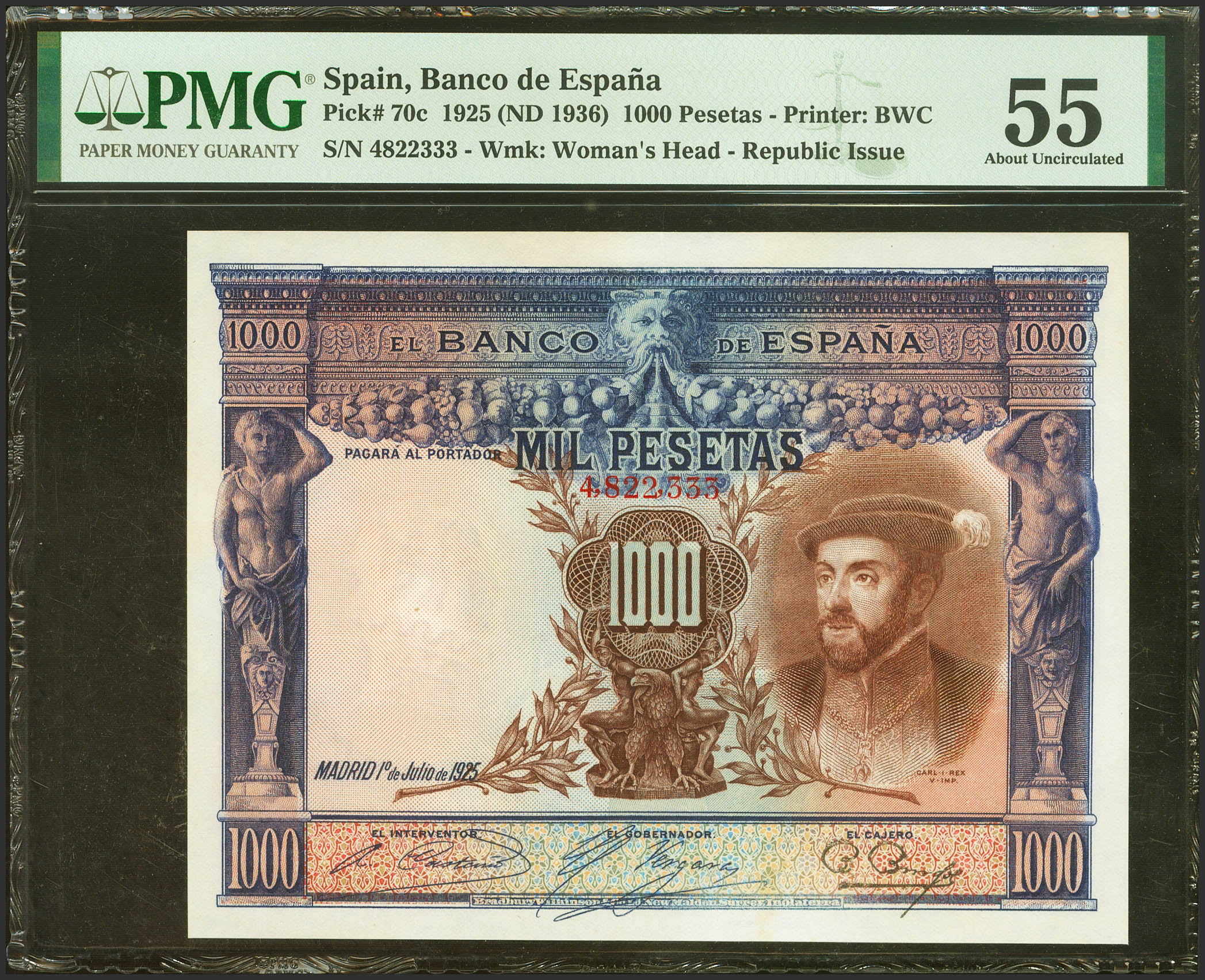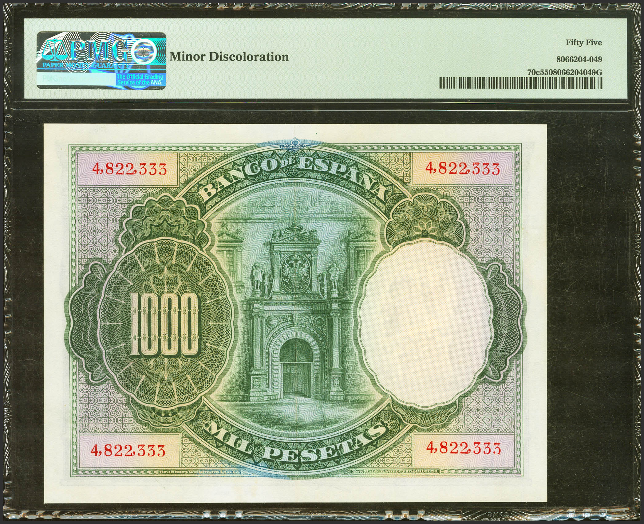English 1000 Pesetas. July 1, 1925. No series and numbering after 3646000. (Edifil 2023: 351, Pick: 70c). Unusual in this quality. Good Extremely Fine. PMG55 encapsulation (minor discoloration).
