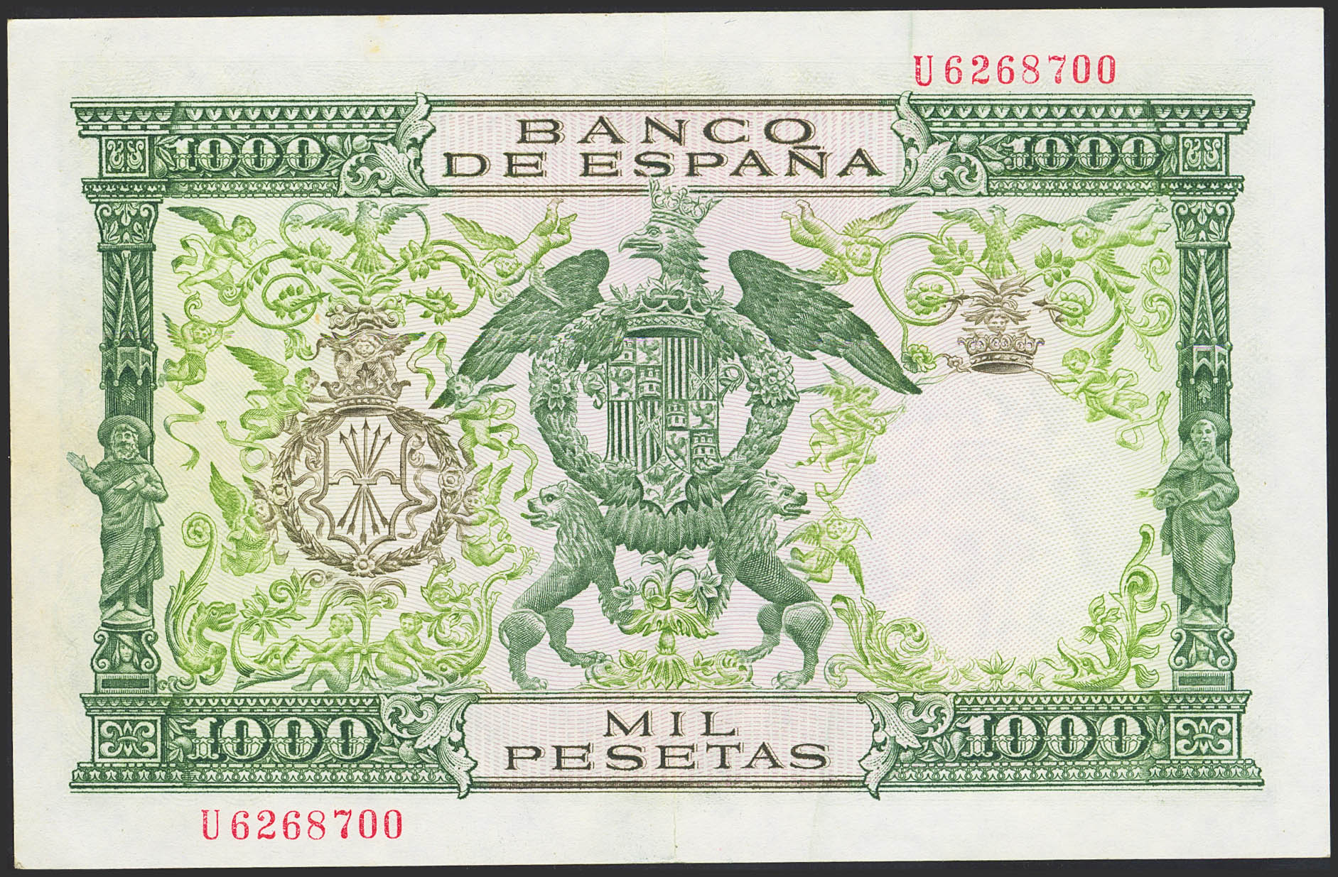 1000 Pesetas. November 29, 1957. Series U. (Edifil 2023: 469b). It retains much of the original finish. Good Extremely Fine.