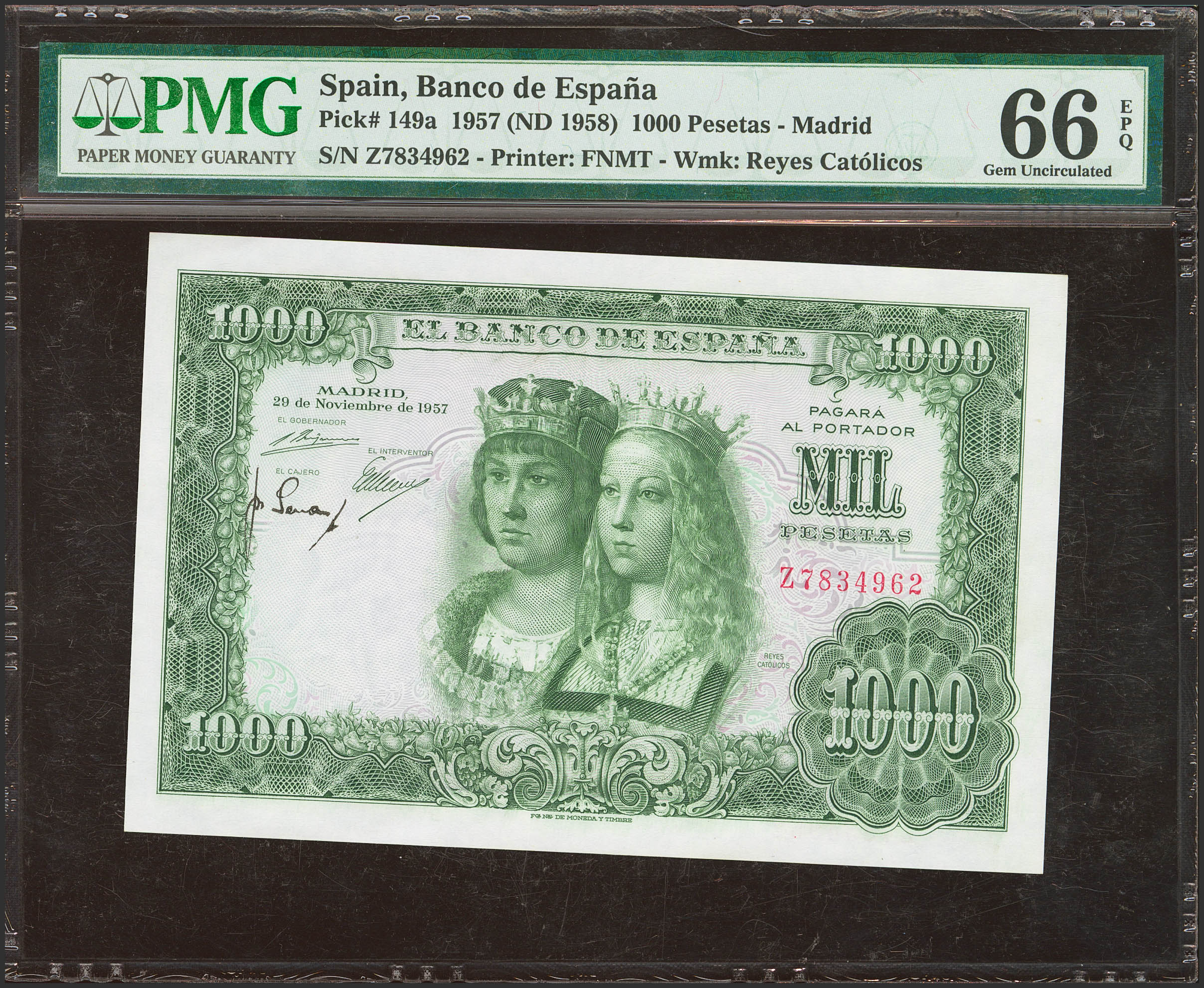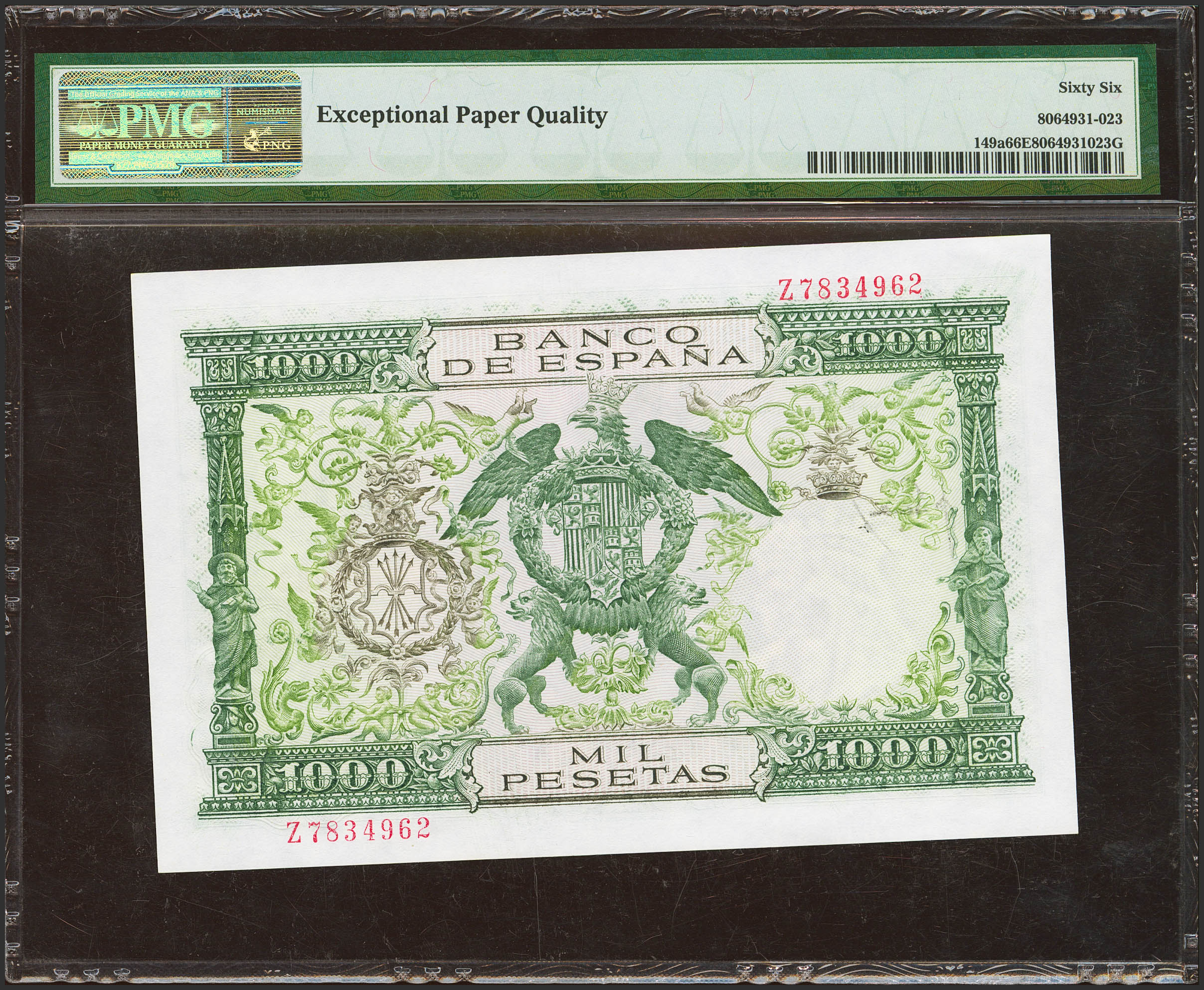 1000 Pesetas. November 29, 1957. Series Z. (Edifil 2023: 469b, Pick: 149a). Rare in this exceptional quality, original sizing. Uncirculated. PMG66EPQ package.