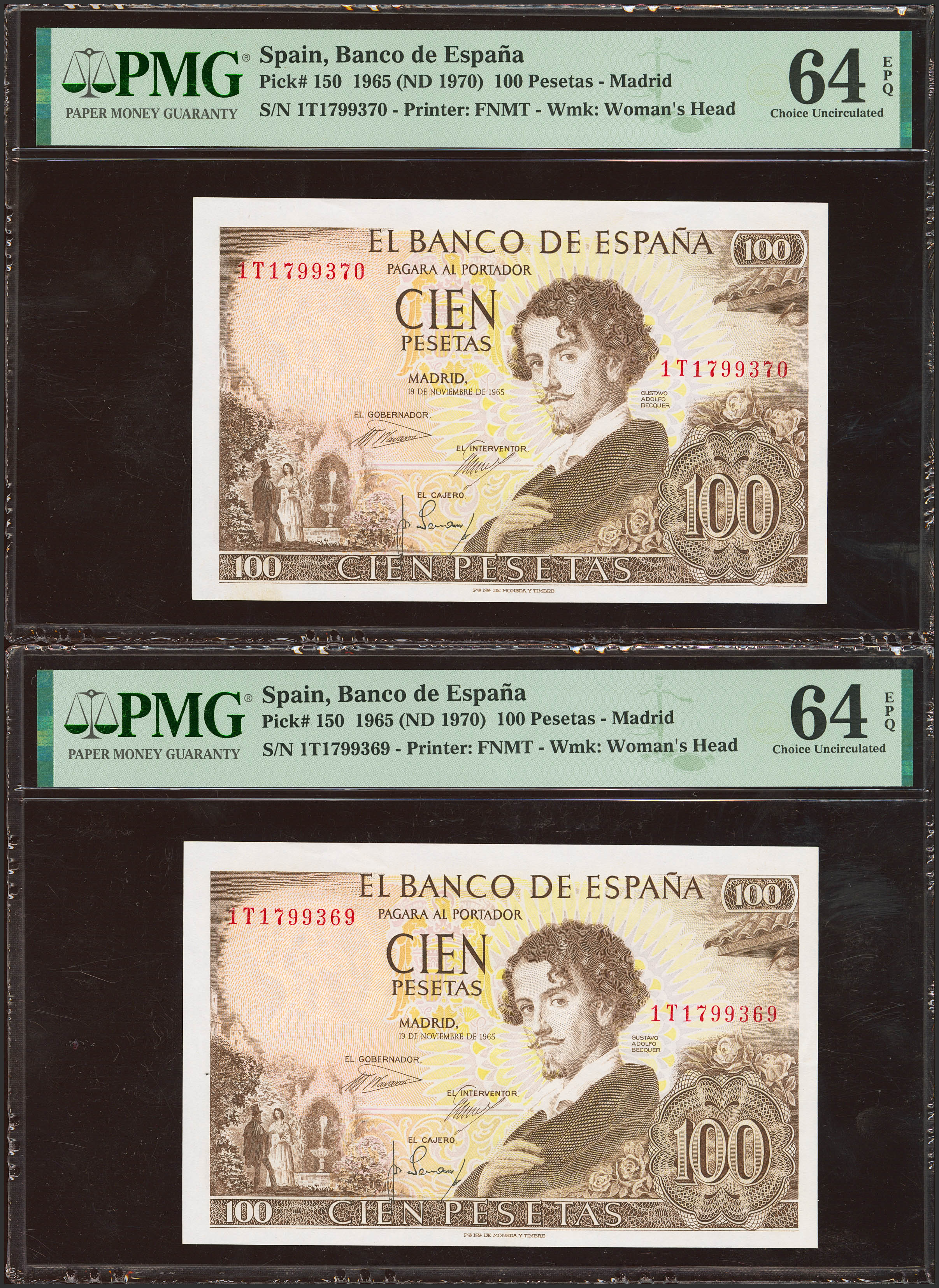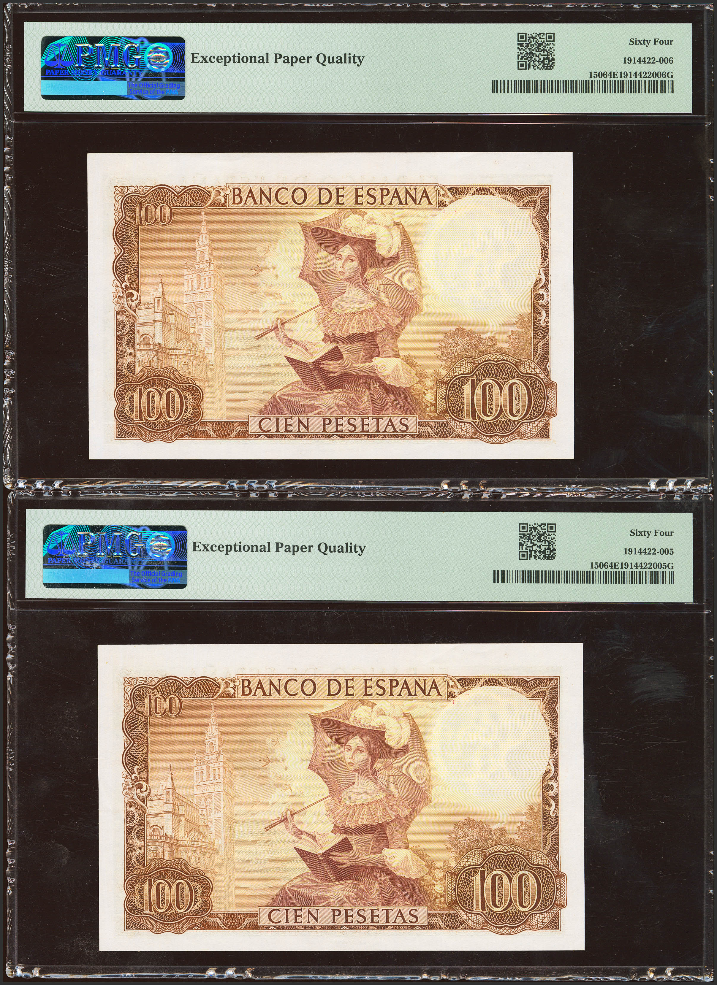 100 Pesetas. November 19, 1965. Correlative couple. Series 1T, last series issued. (Edifil 2023: 470b, Pick: 150). Unusual, original sizing. Uncirculated. PMG64EPQ packages, both.