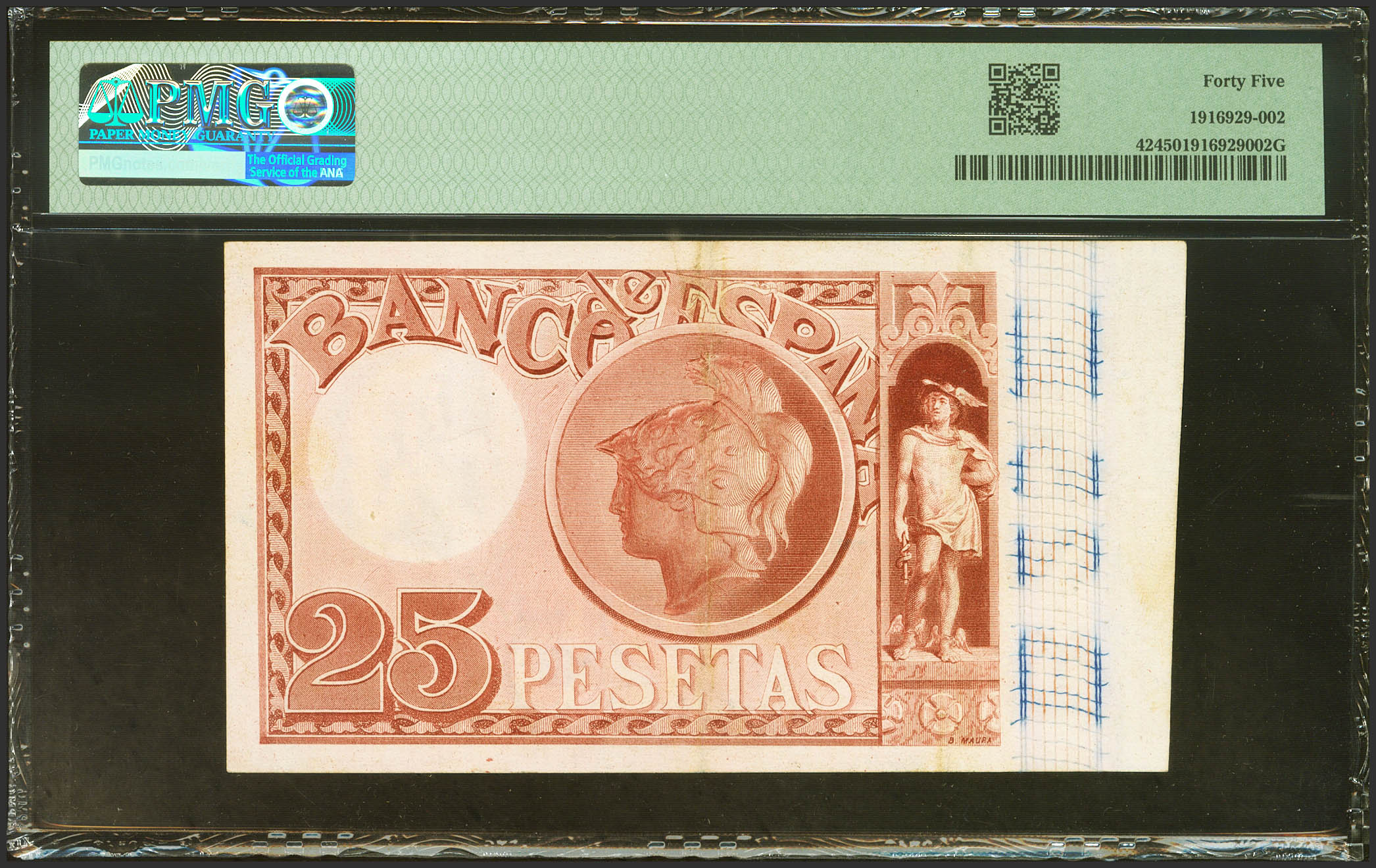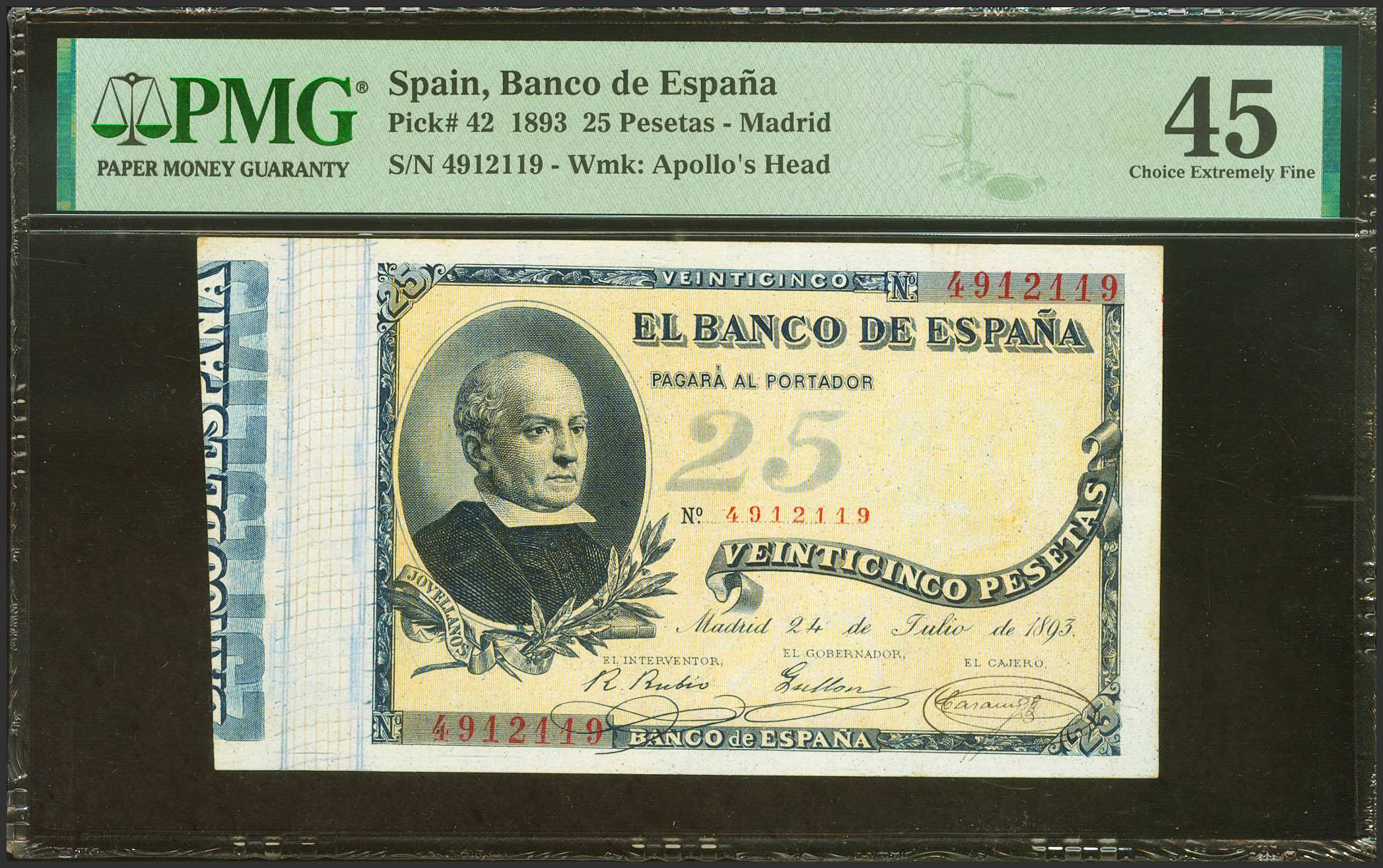25 Pesetas. July 24, 1893. No series. (Edifil 2023: 300, Pick: 42). Rare especially in this exceptional quality and without any repairs. Almost Extremely Fine. PMG45 encapsulated.