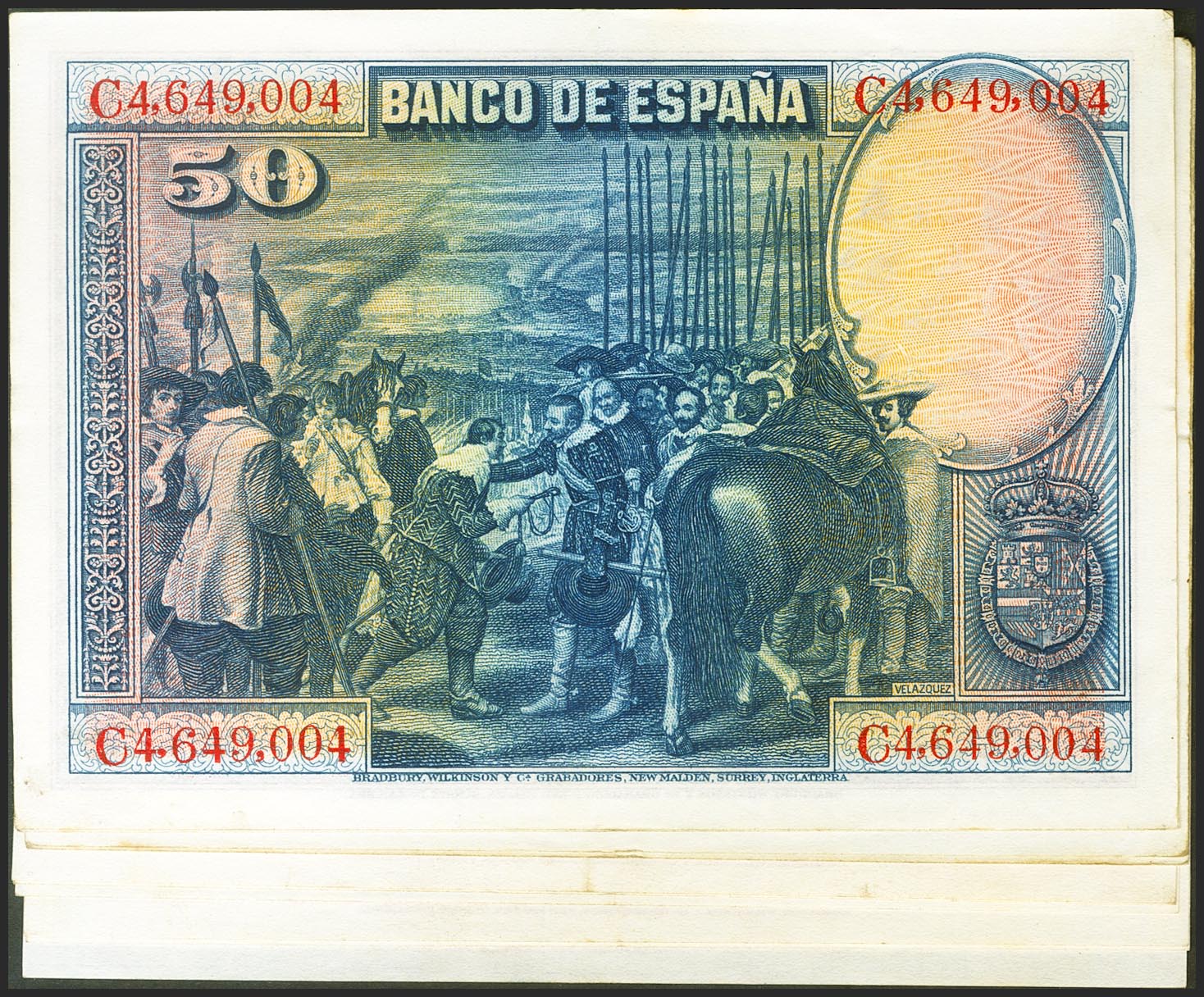 Set of 10 correlative banknotes and in different sections of 50 Pesetas issued on August 15, 1928 and with series C (Edifil 2021: 354), preserving most of the original size. Good Extremely Fine.